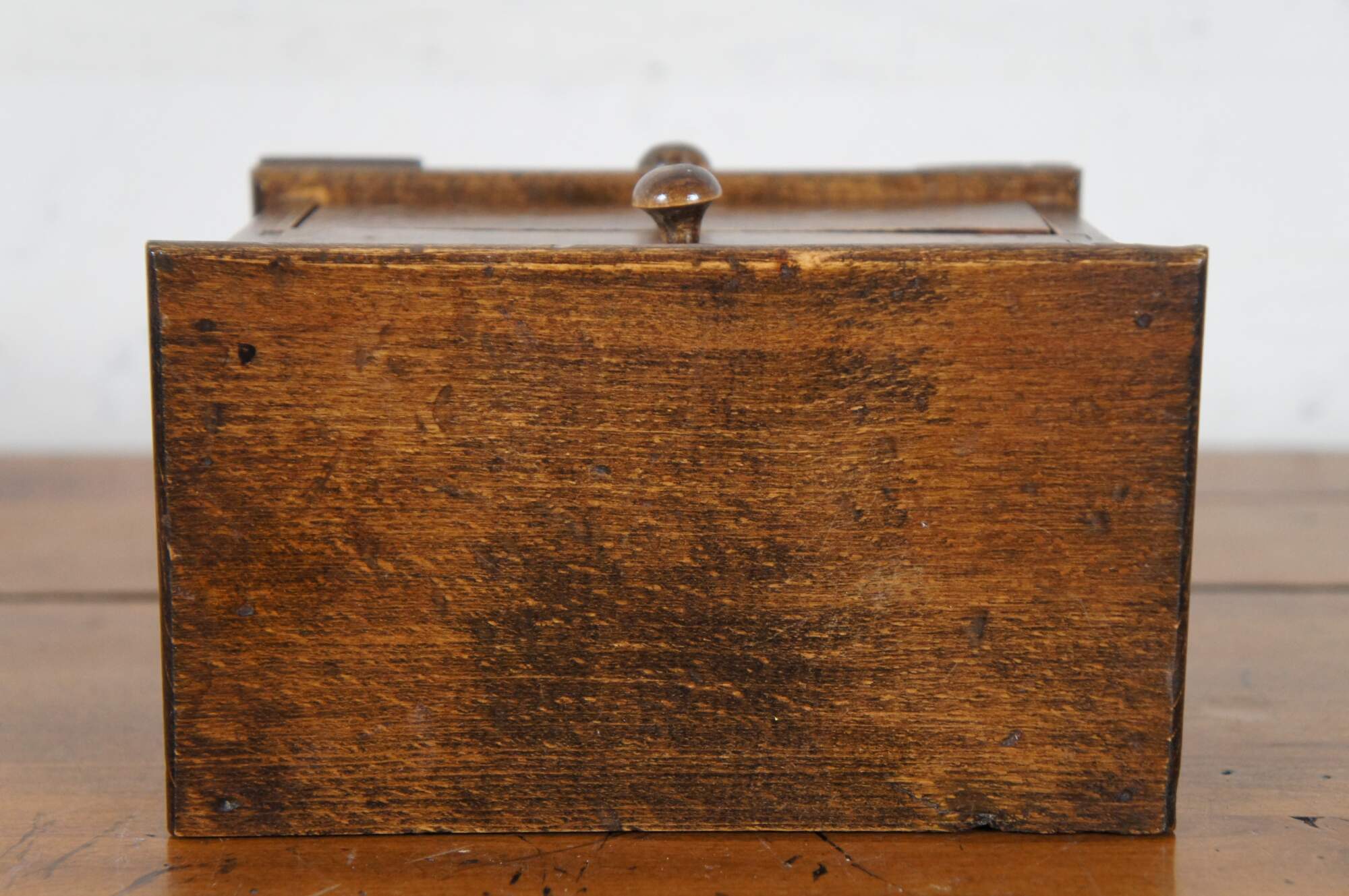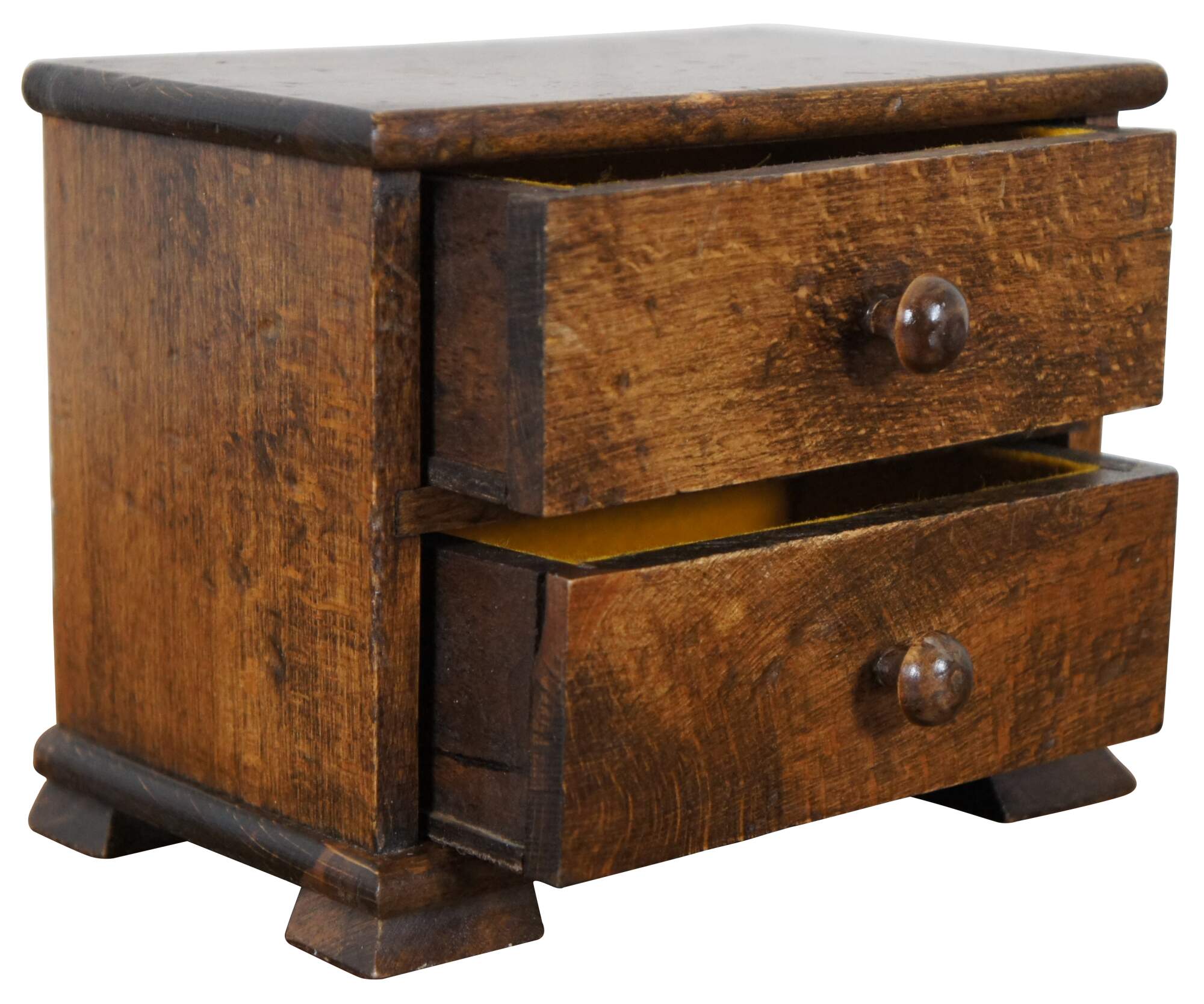 Antique miniature salesman sample style oak chest of two drawers, lined in yellow felt with round knobs and square feet, usable as a dollhouse dresser or trinket / jewelry box.
