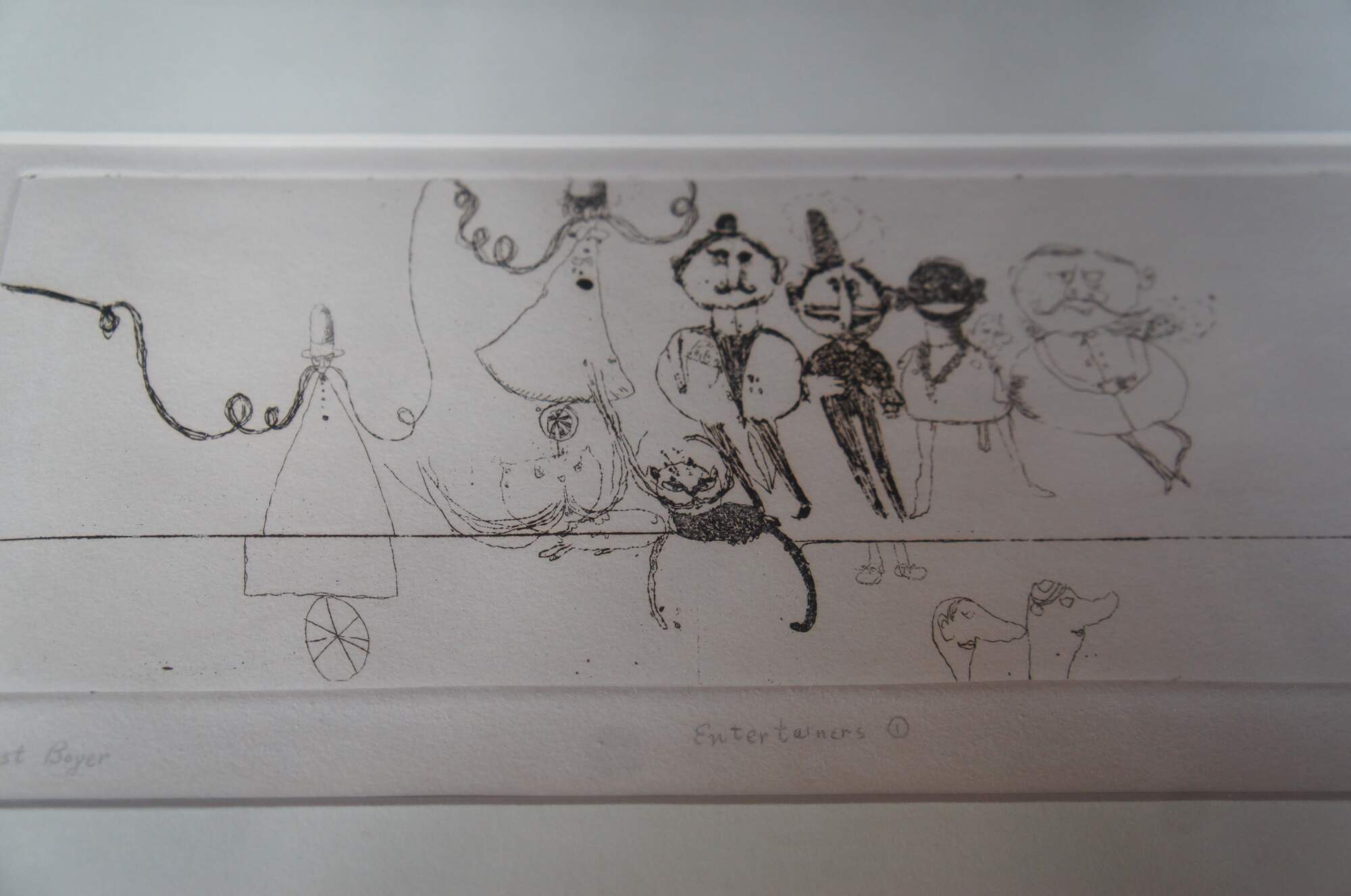 Mid century etching by Ronald Markman, made exclusively for Ernest Boyer of Dayton Ohio. Edition 1/1. Features a circus of characters and abstract figures, cats, men, and mustaches