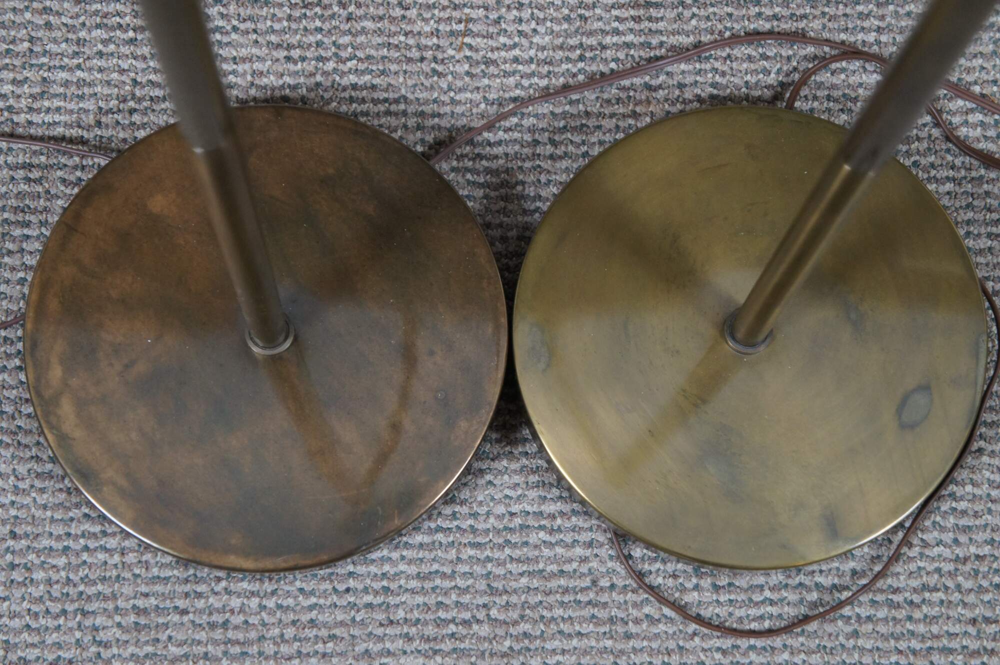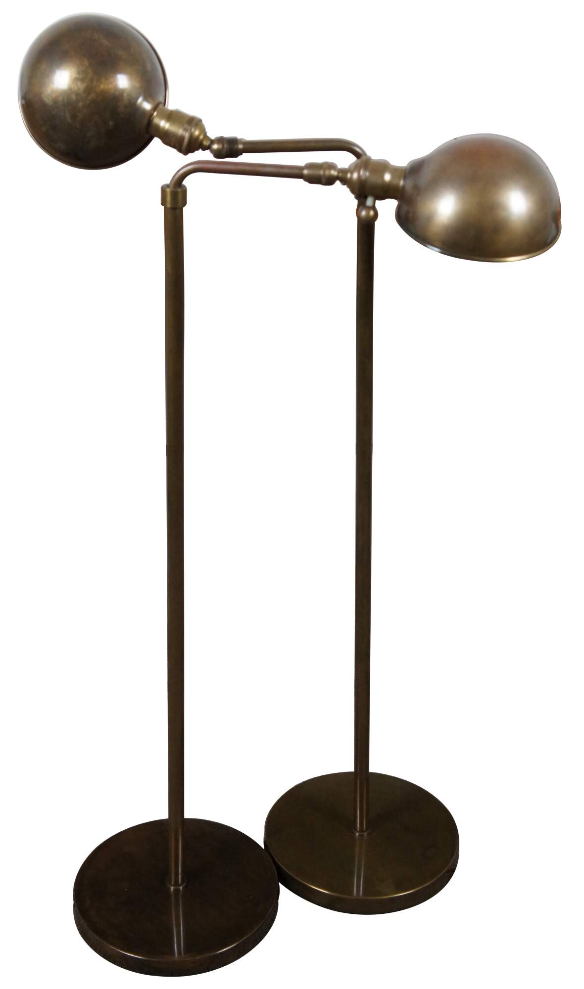 Pair of vintage mid century brass pharmacy style reading / floor lamps with adjustable height and three way switch.