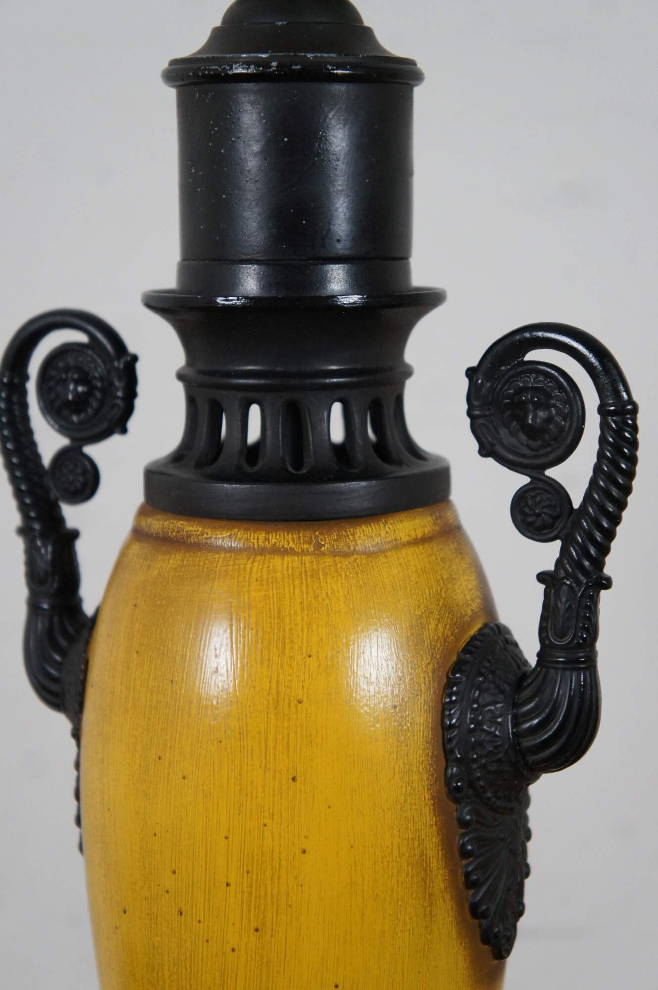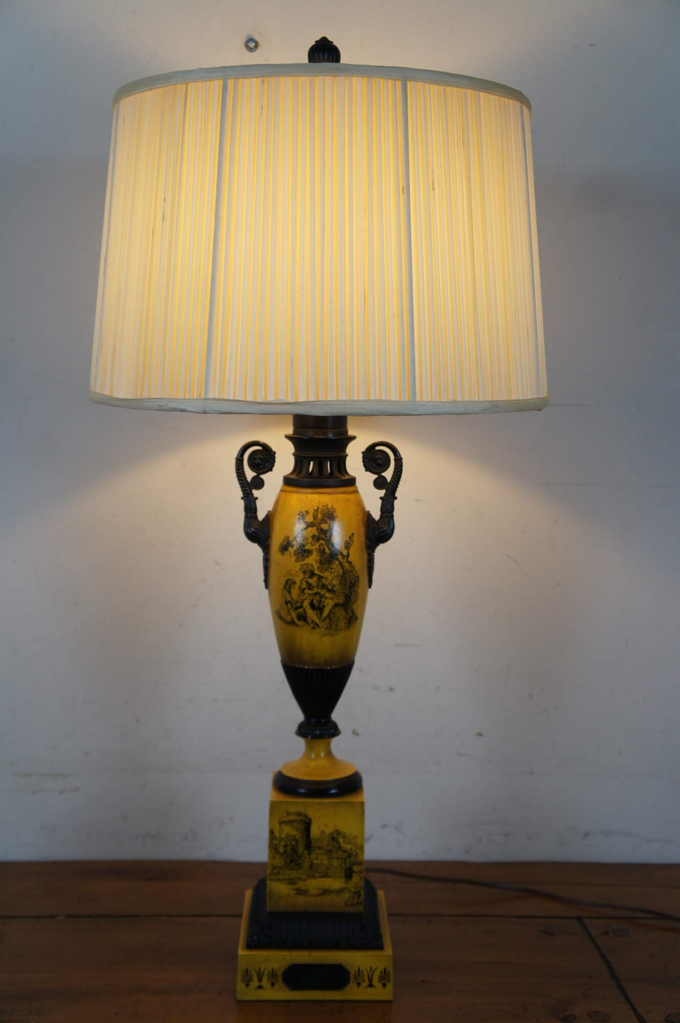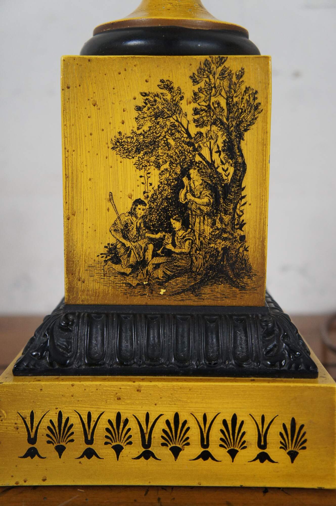 Vintage 20th century black and mustard yellow tole table lamp in the shape of a French Empire style urn on a pedestal, decorated with toile style Provincial scenes and landscapes, overlaid with an artistically aged finish. Plaque on front reads: Lampe a Moderateur par Brevet d’Invention et De Perfectionnement (Loosely translated: Moderator Lamp by Patent of Invention and Perfection). Includes white shade.