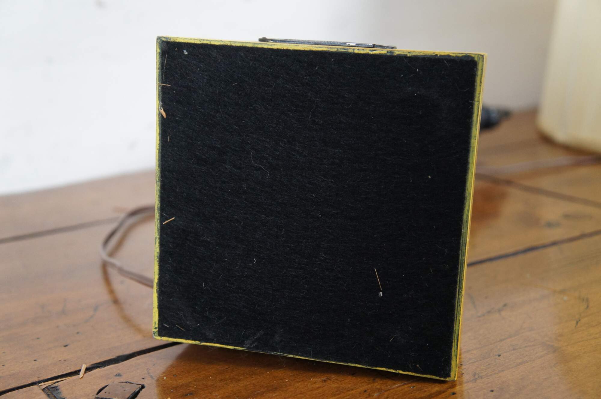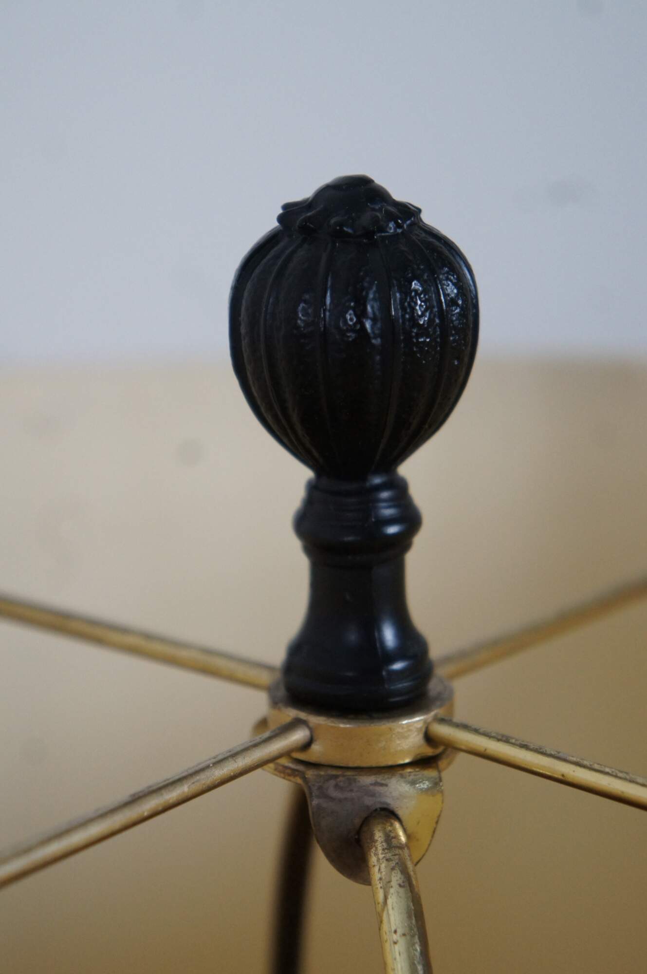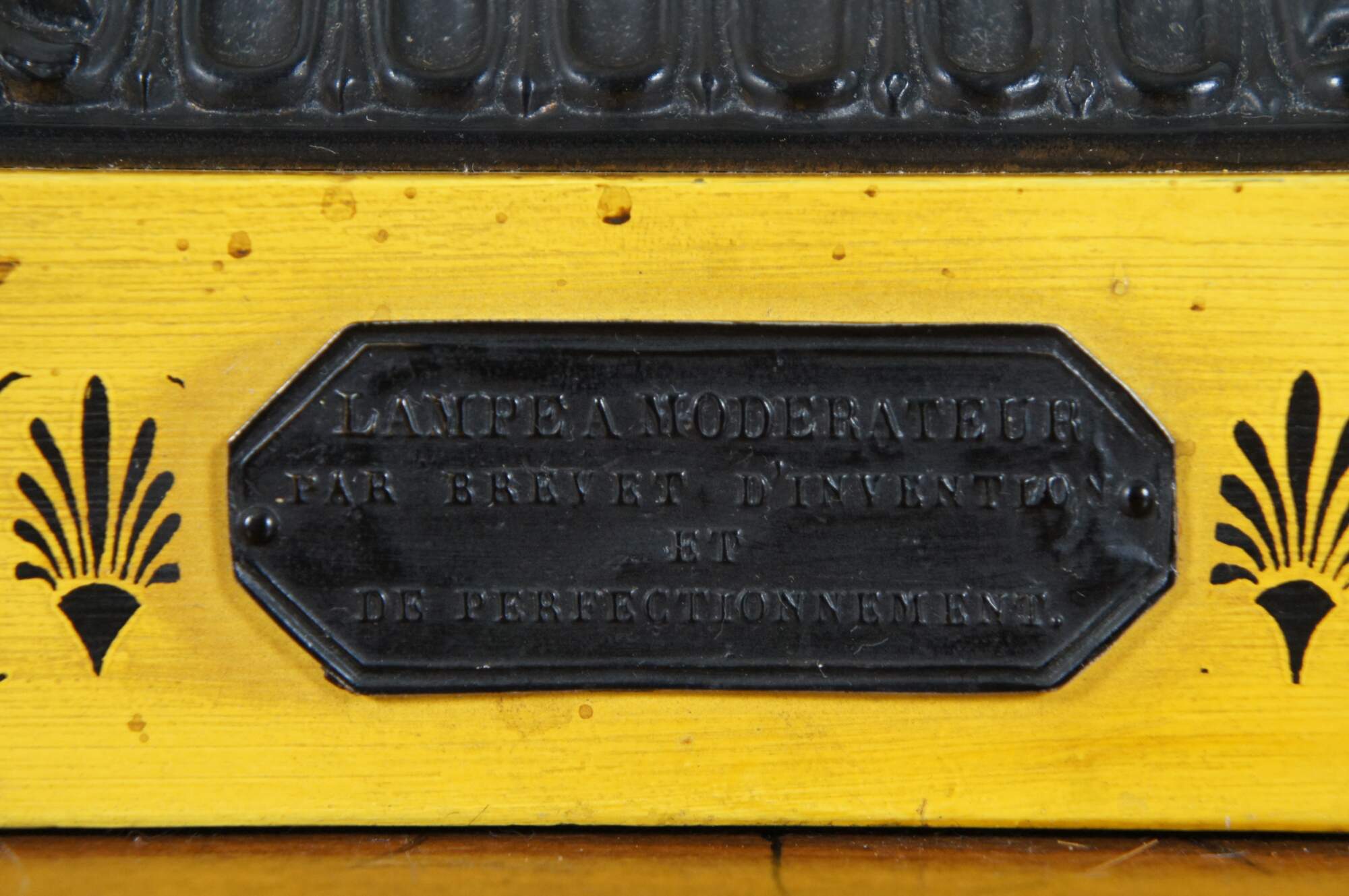 Vintage 20th century black and mustard yellow tole table lamp in the shape of a French Empire style urn on a pedestal, decorated with toile style Provincial scenes and landscapes, overlaid with an artistically aged finish. Plaque on front reads: Lampe a Moderateur par Brevet d’Invention et De Perfectionnement (Loosely translated: Moderator Lamp by Patent of Invention and Perfection). Includes white shade.