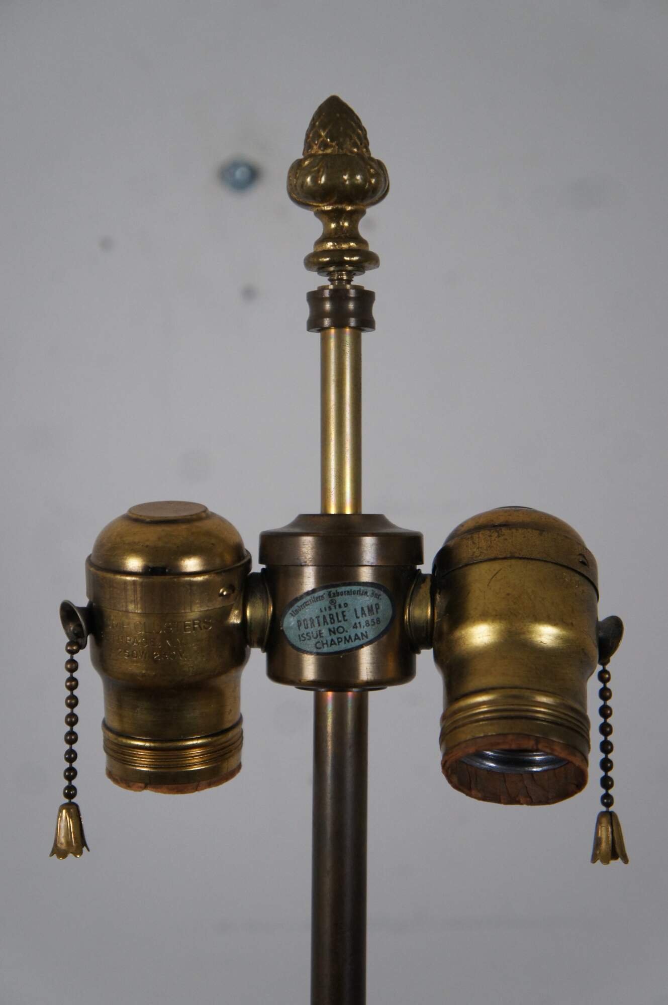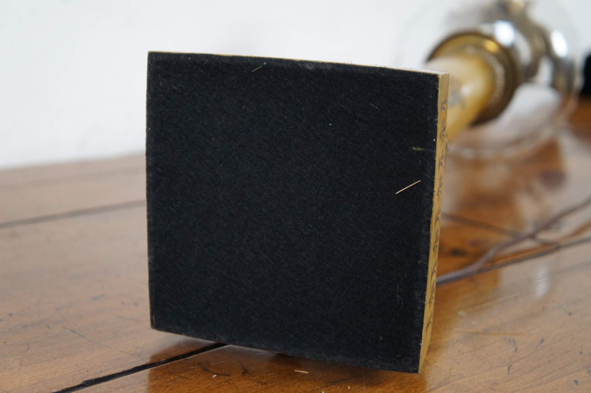 Vintage 20th century converted oil table lamp in the shape of a Italian Neoclassical tole column painted in mustard yellow with toile Provincial scenes / landscapes, trimmed in brass and topped with a clear glass reservoir below the two light sockets and acorn finial.