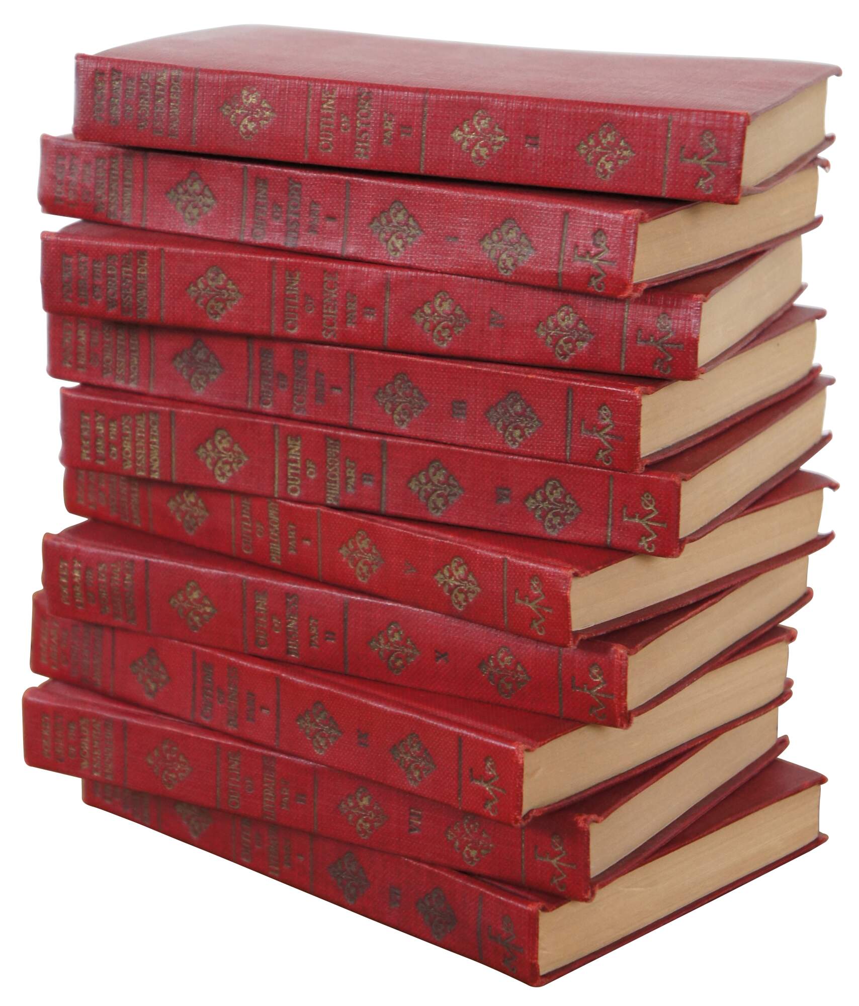 Set of ten red cloth, hard bound books comprising the “Pocket Library of the World’s Essential Knowledge” in 10 Volumes, a complete set containing the Outlines of History, Science, Philosophy, Literature, and Business – Editor-in-Chief Henry Cook Hathaway, A.B. - Published by Funk & Wagnalls Company 1929 – Copyright 1910.