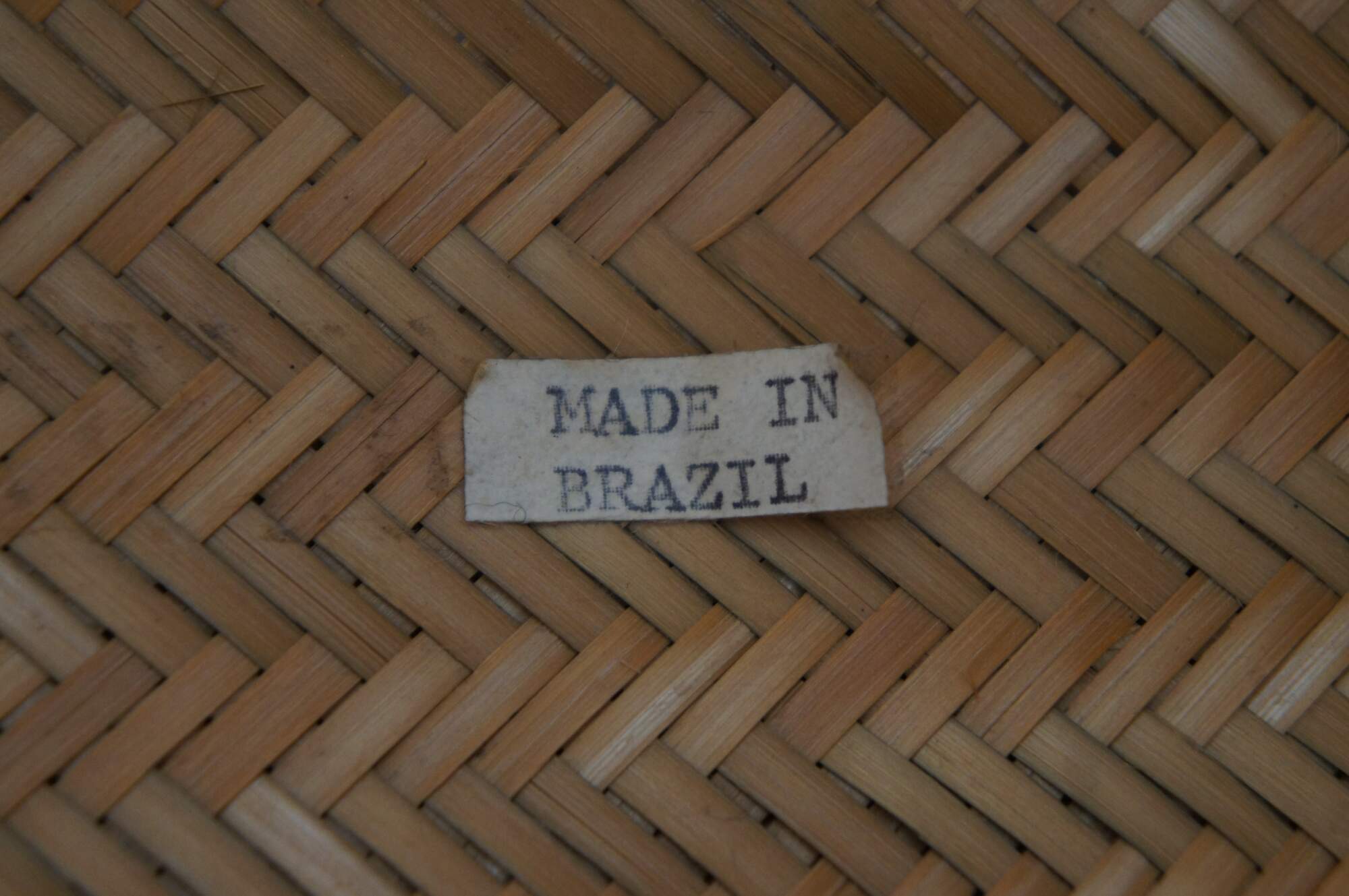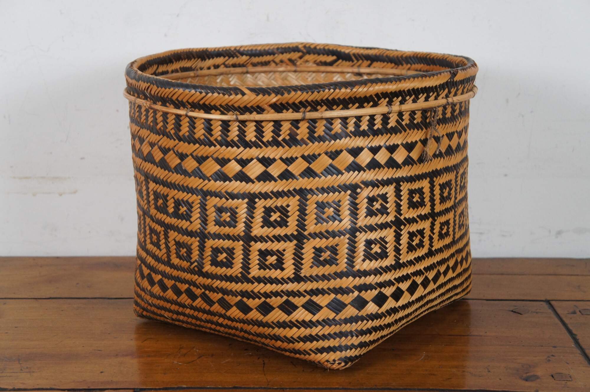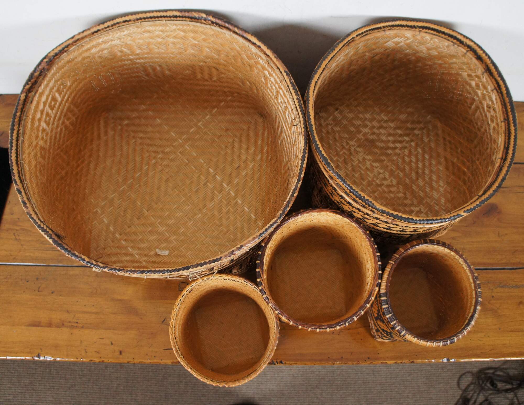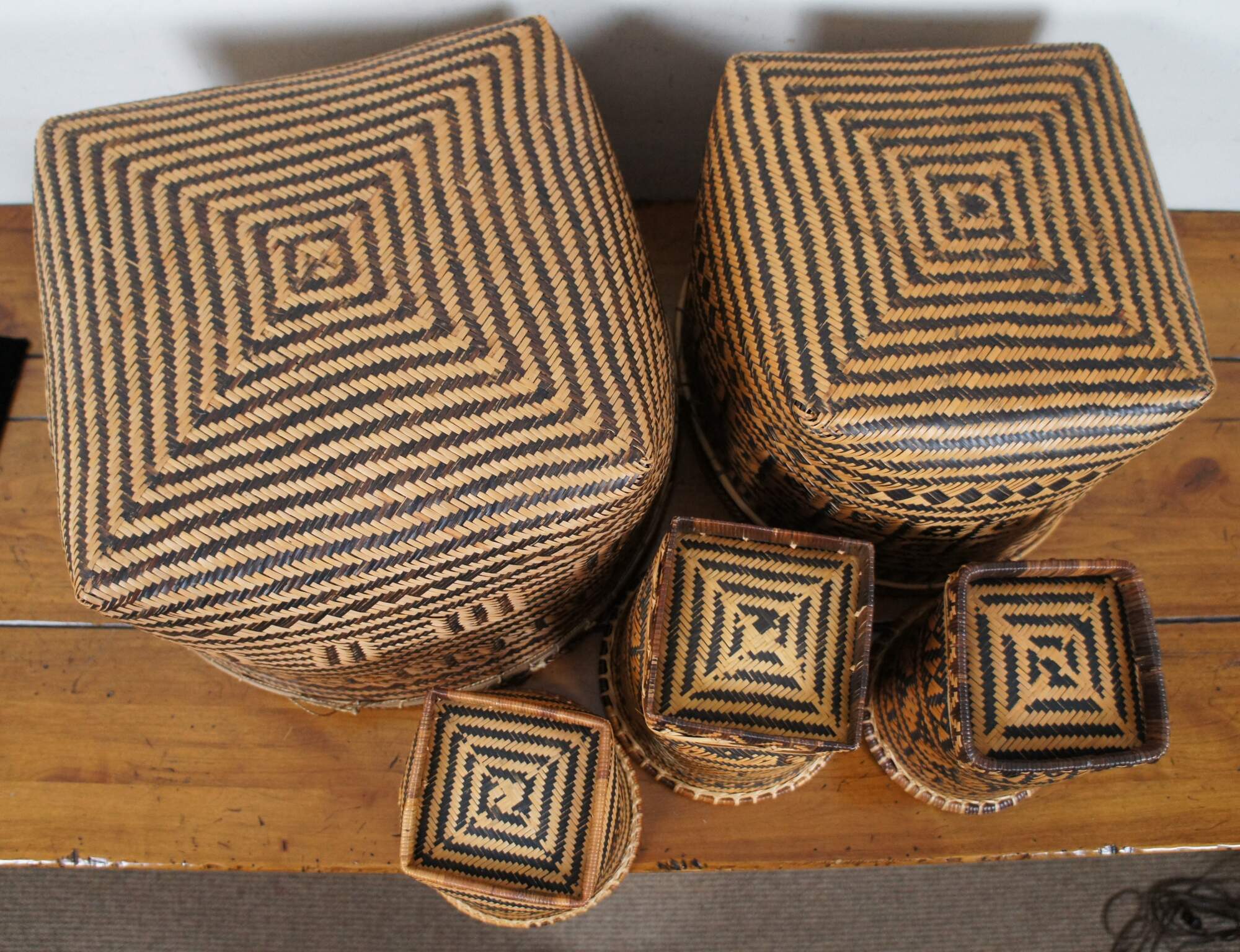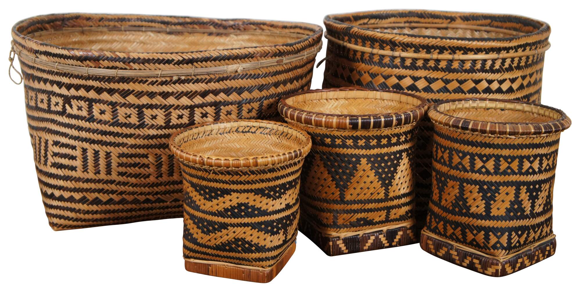 Set of five hand woven two tone, geometric, South American folk art baskets in a variety of sizes for a variety of potential uses from harvest / storage to cachepot / planter. One specifically marked Made in Brazil.