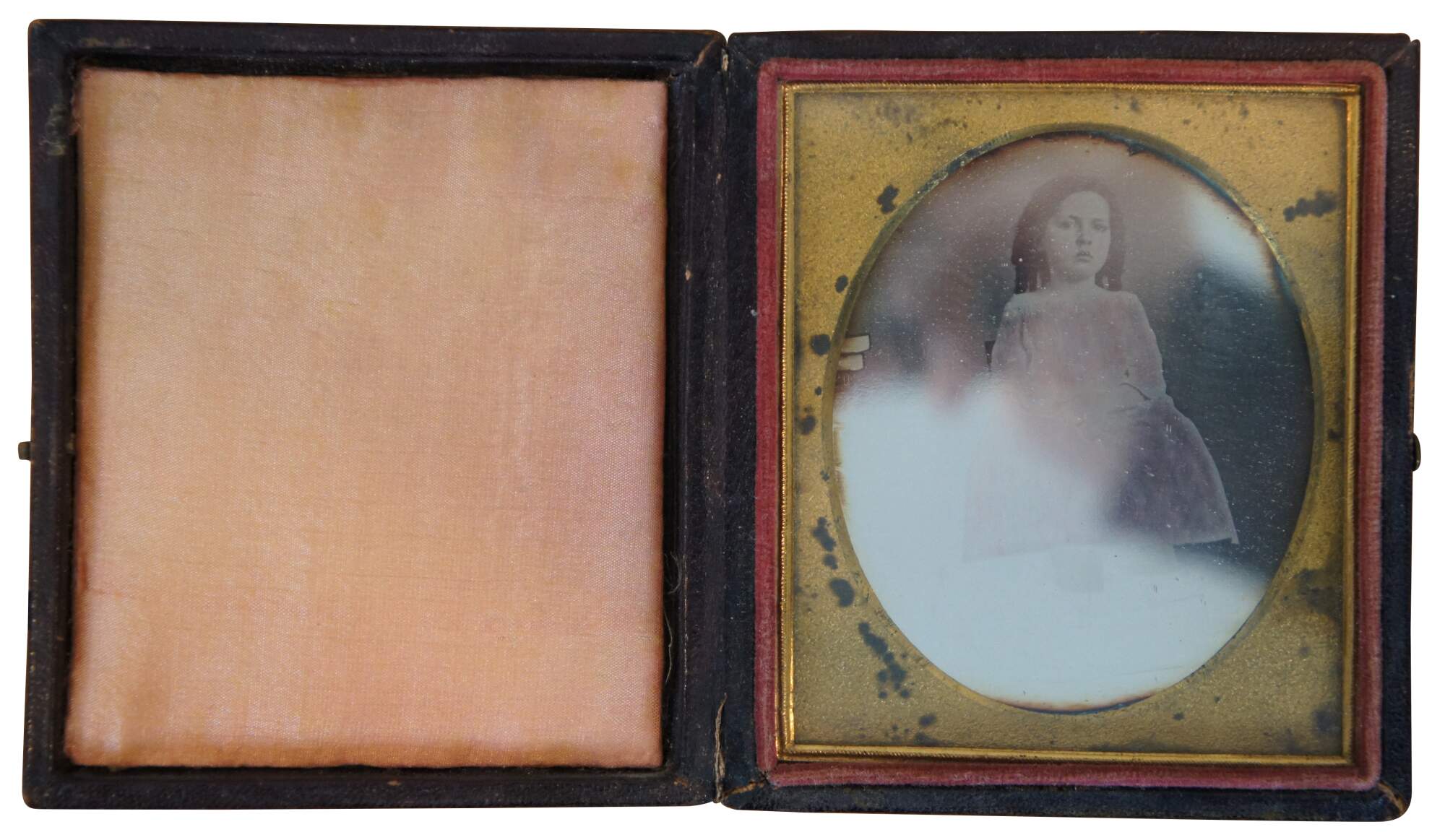 Antique Victorian colored daguerreotype photograph of a young girl in a pink dress, encased in a gold tone mat in a silk lined bonded leather case, stamped with flowers and leaves.