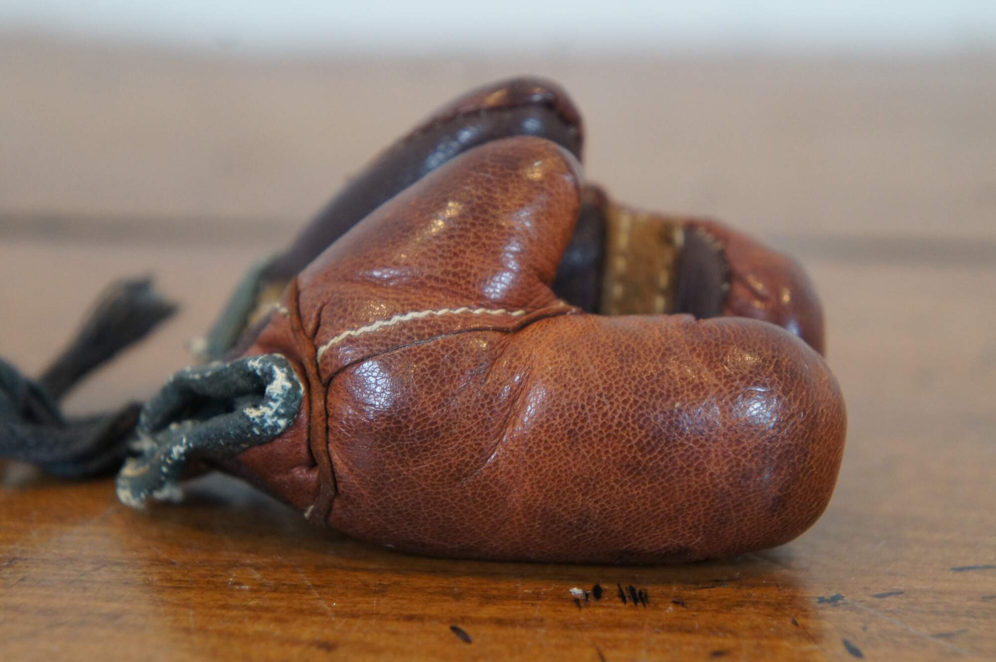 Circa 1930s-1940s miniature boxing gloves, made of multi-toned leather, connected with cotton strings.