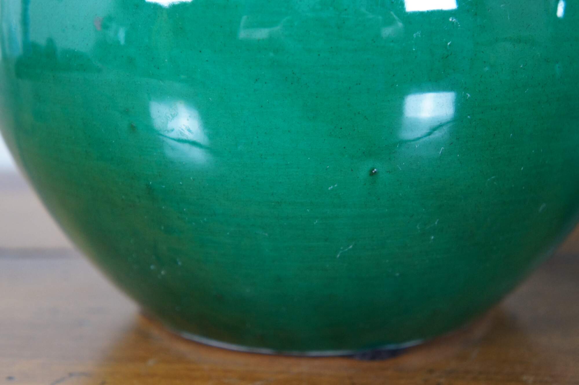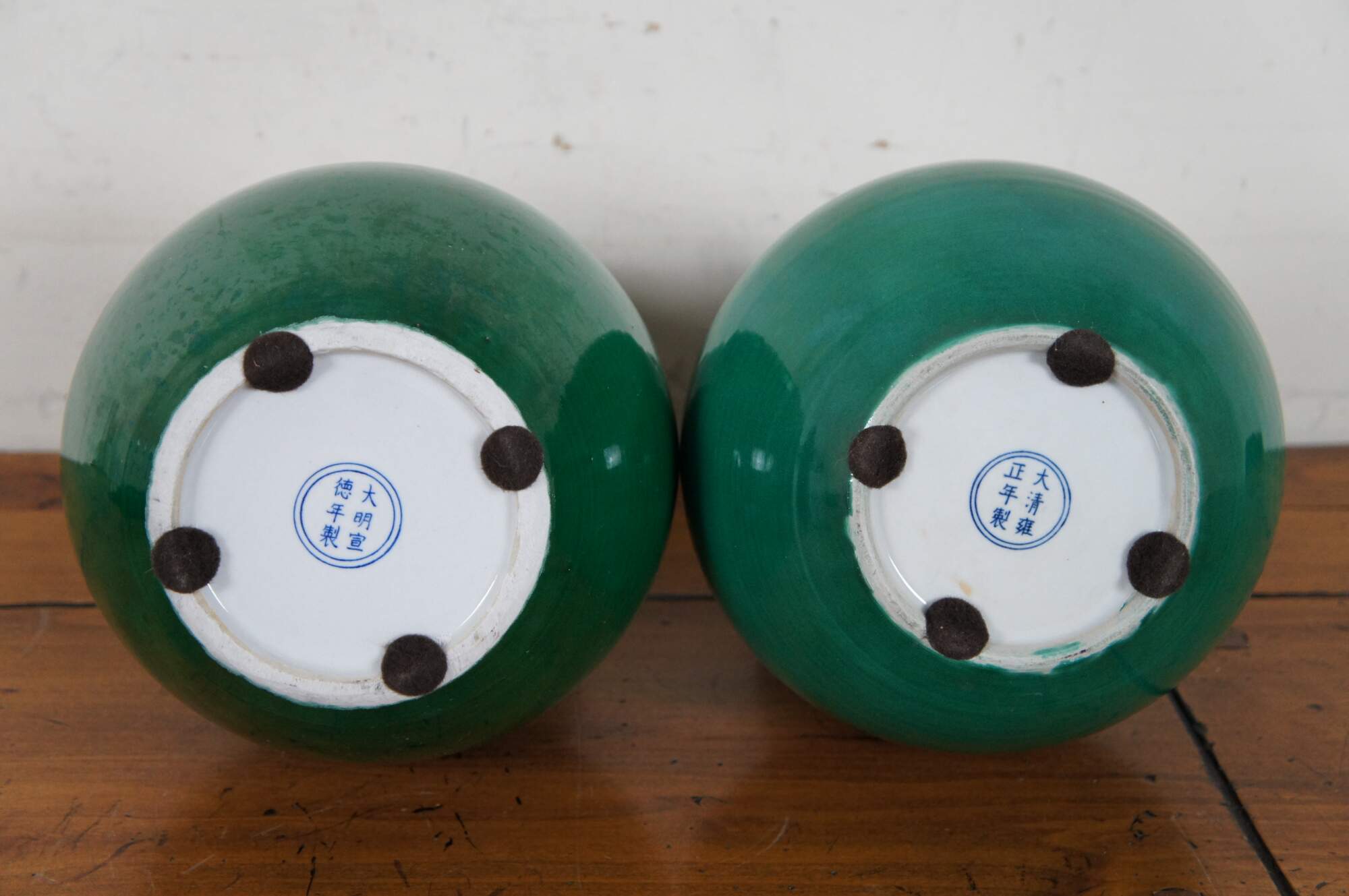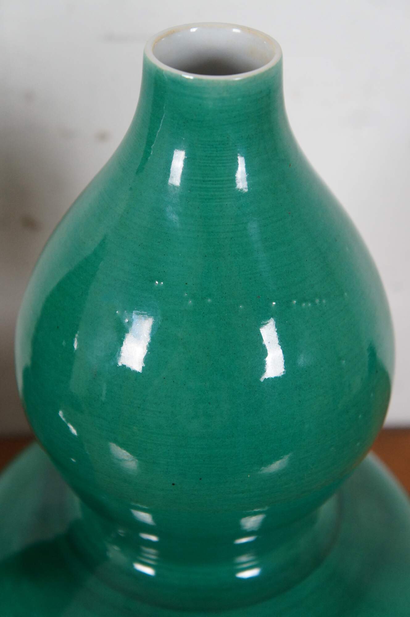 Pair of emerald green Chinese double gourd shaped porcelain vases. Marked on bases.