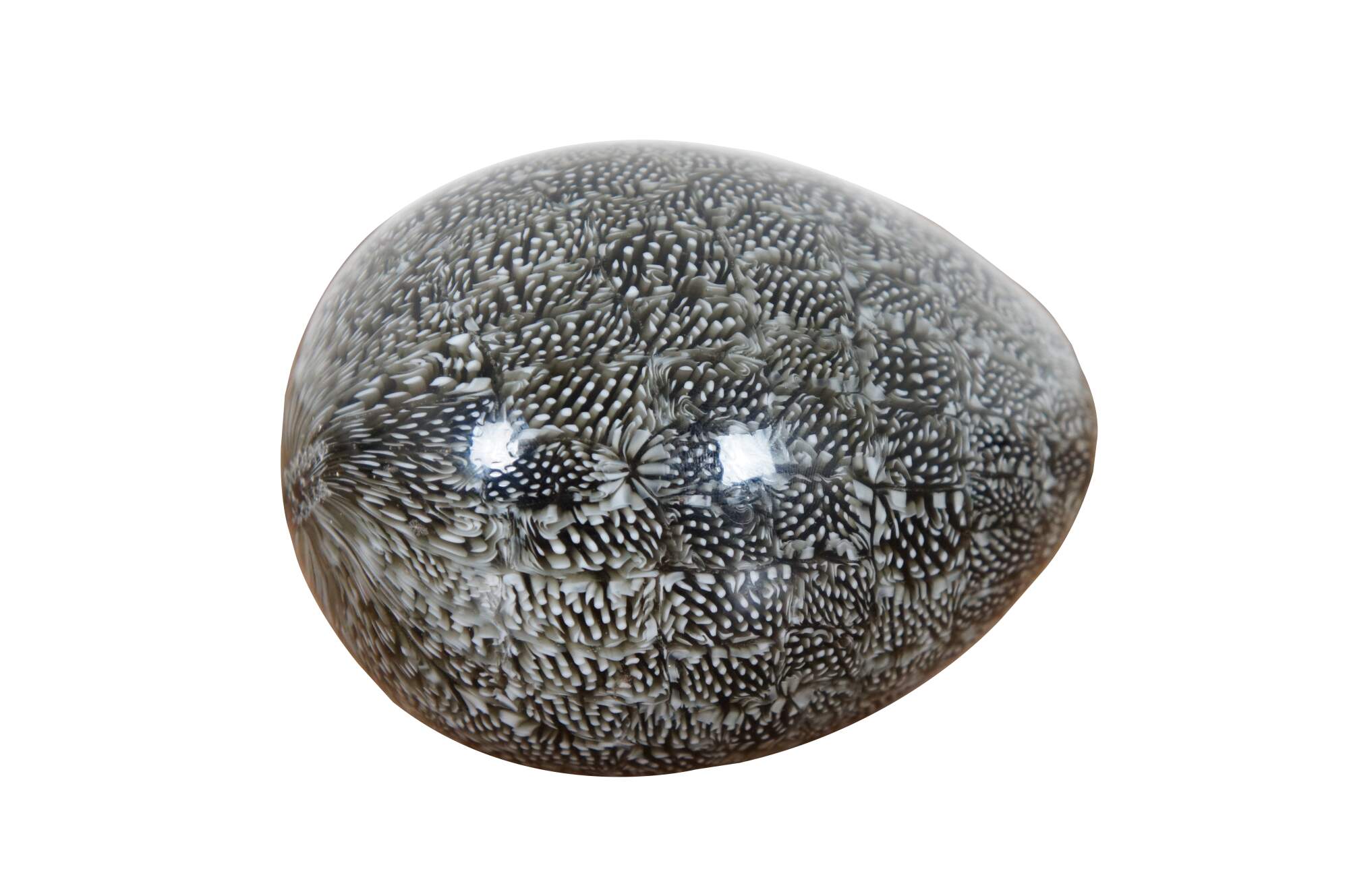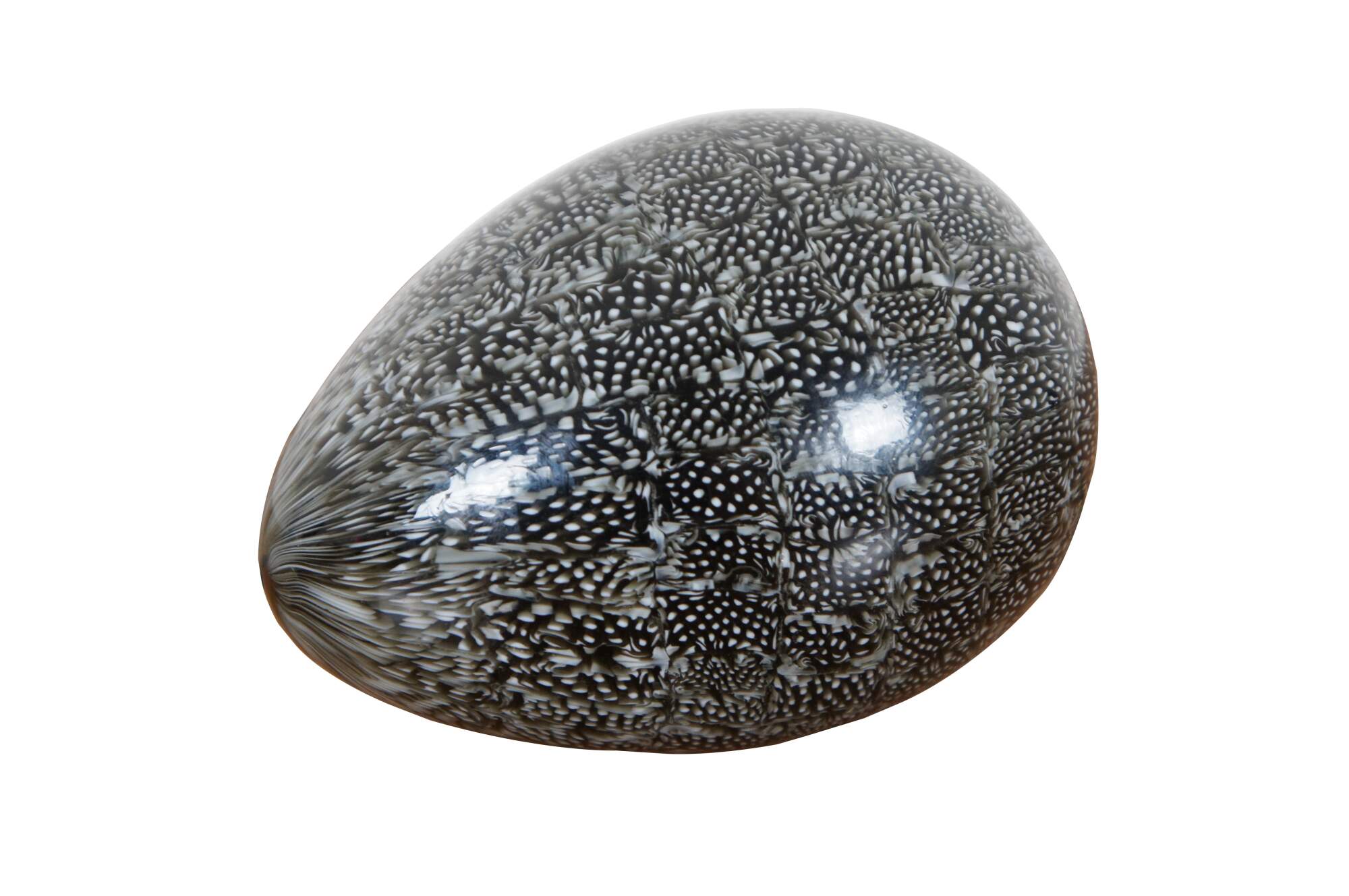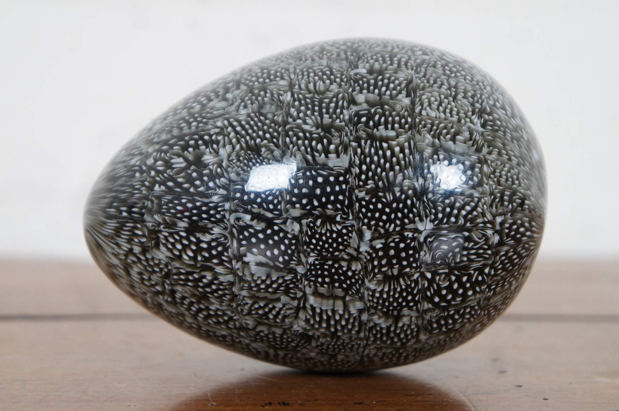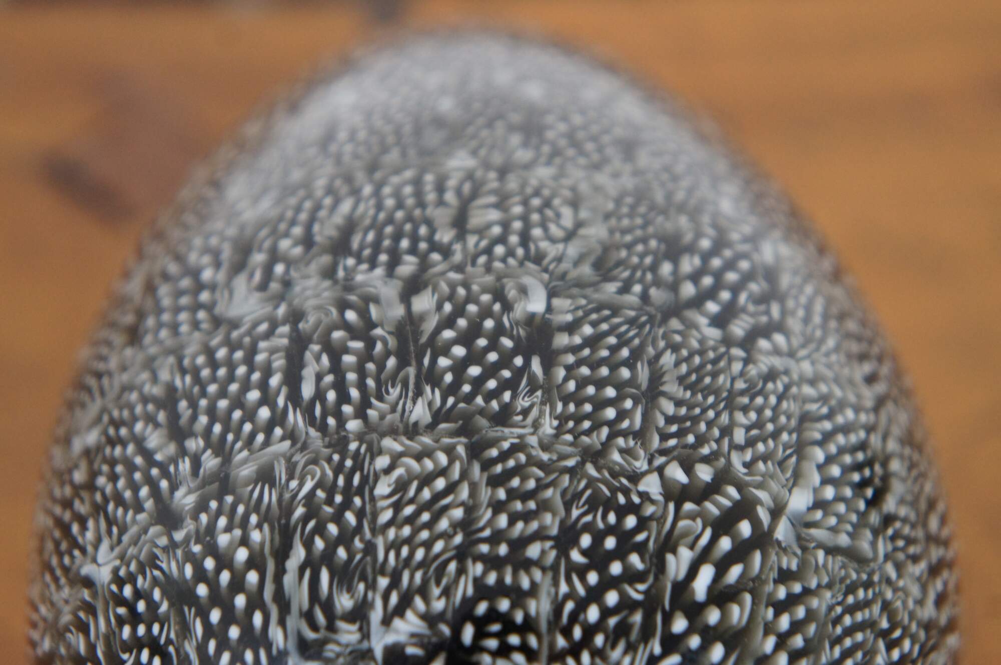 Vintage Murano / Italian art glass egg sculpture / paperweight, featuring a black and white murrine pattern that resembles the speckled feathers of the guinea fowl. Signed Venini Italia.