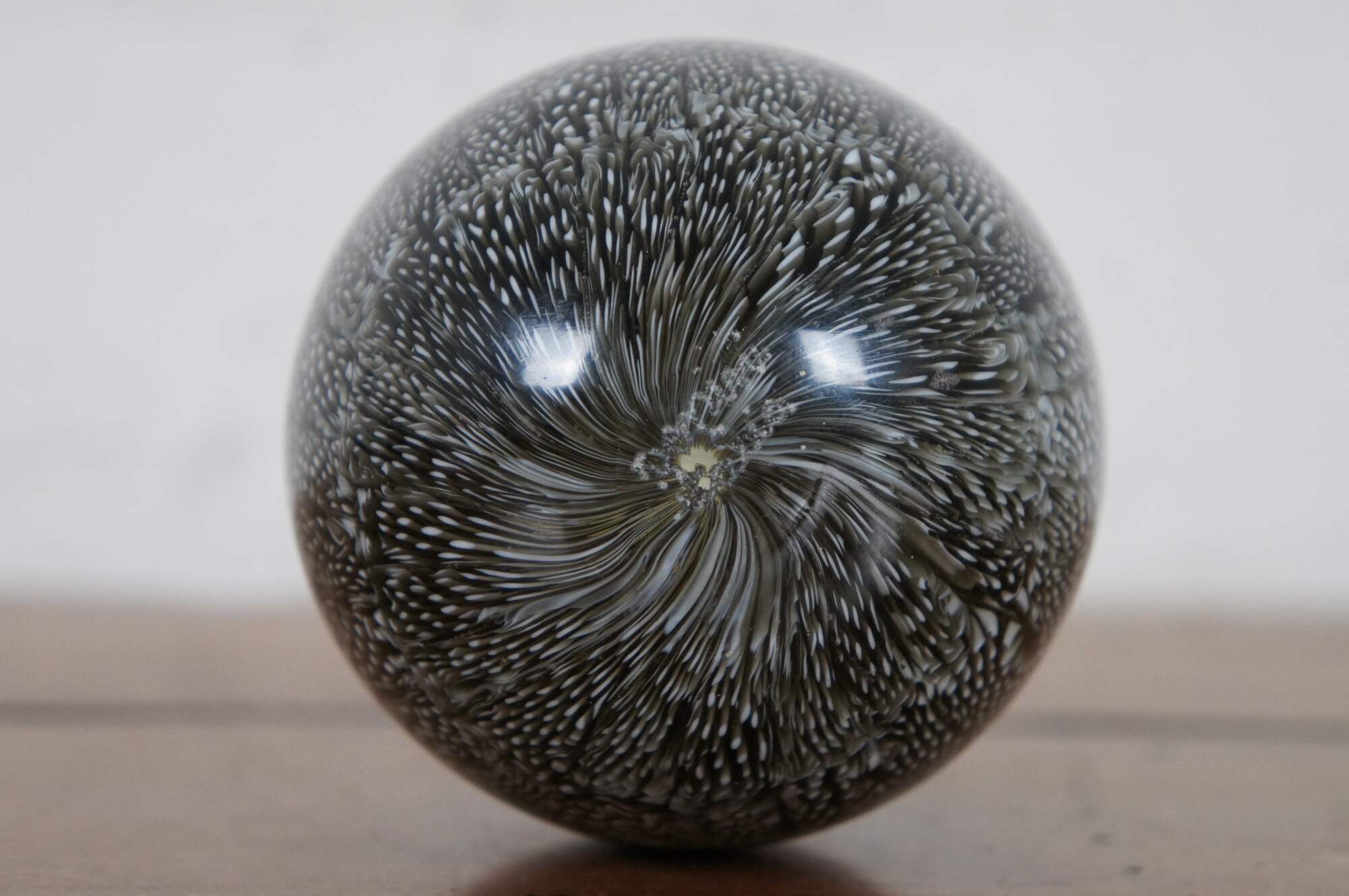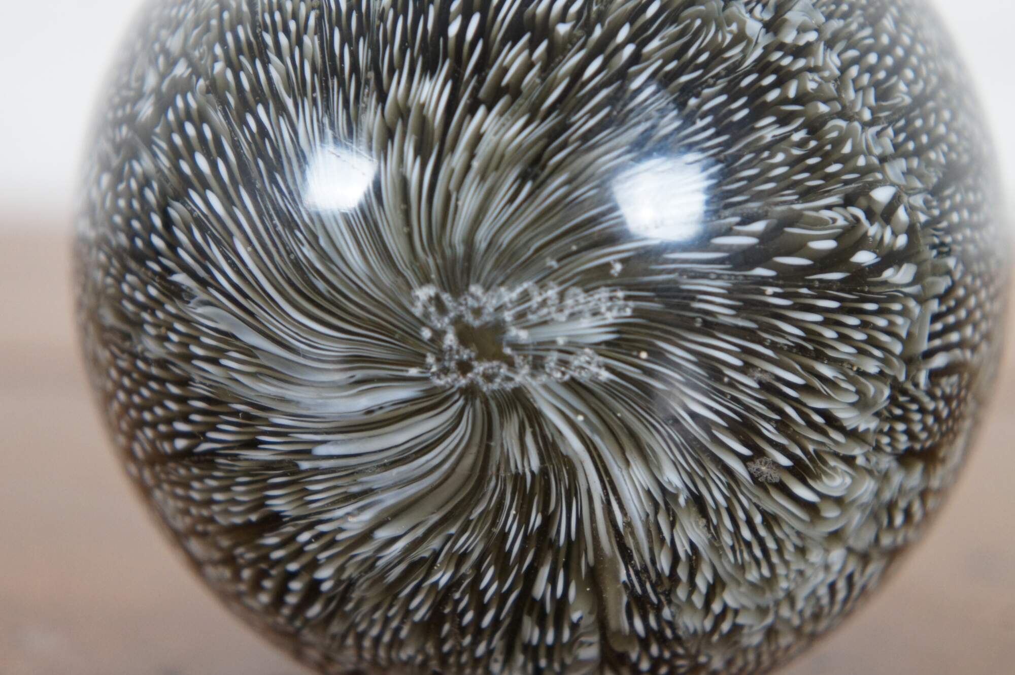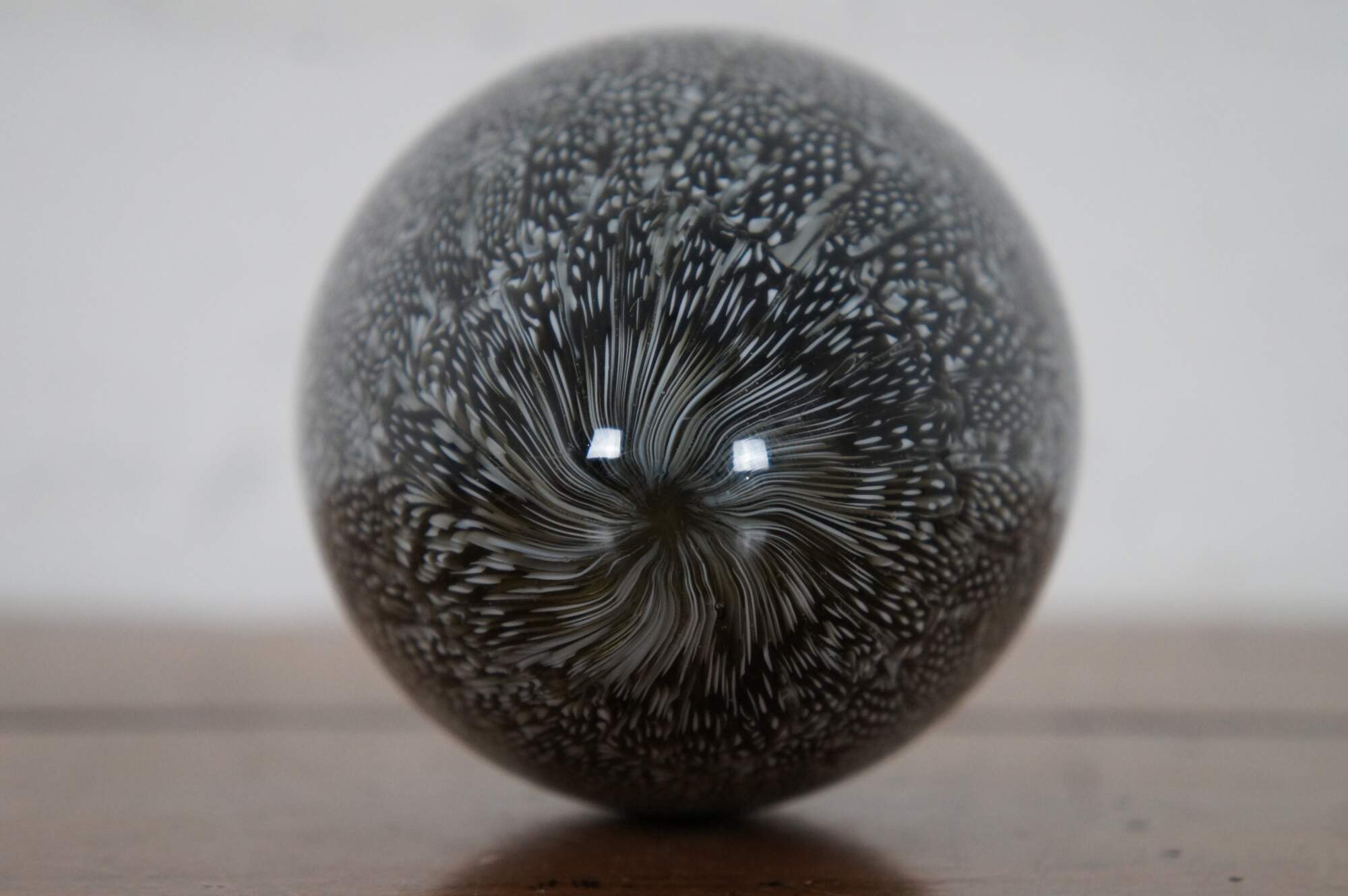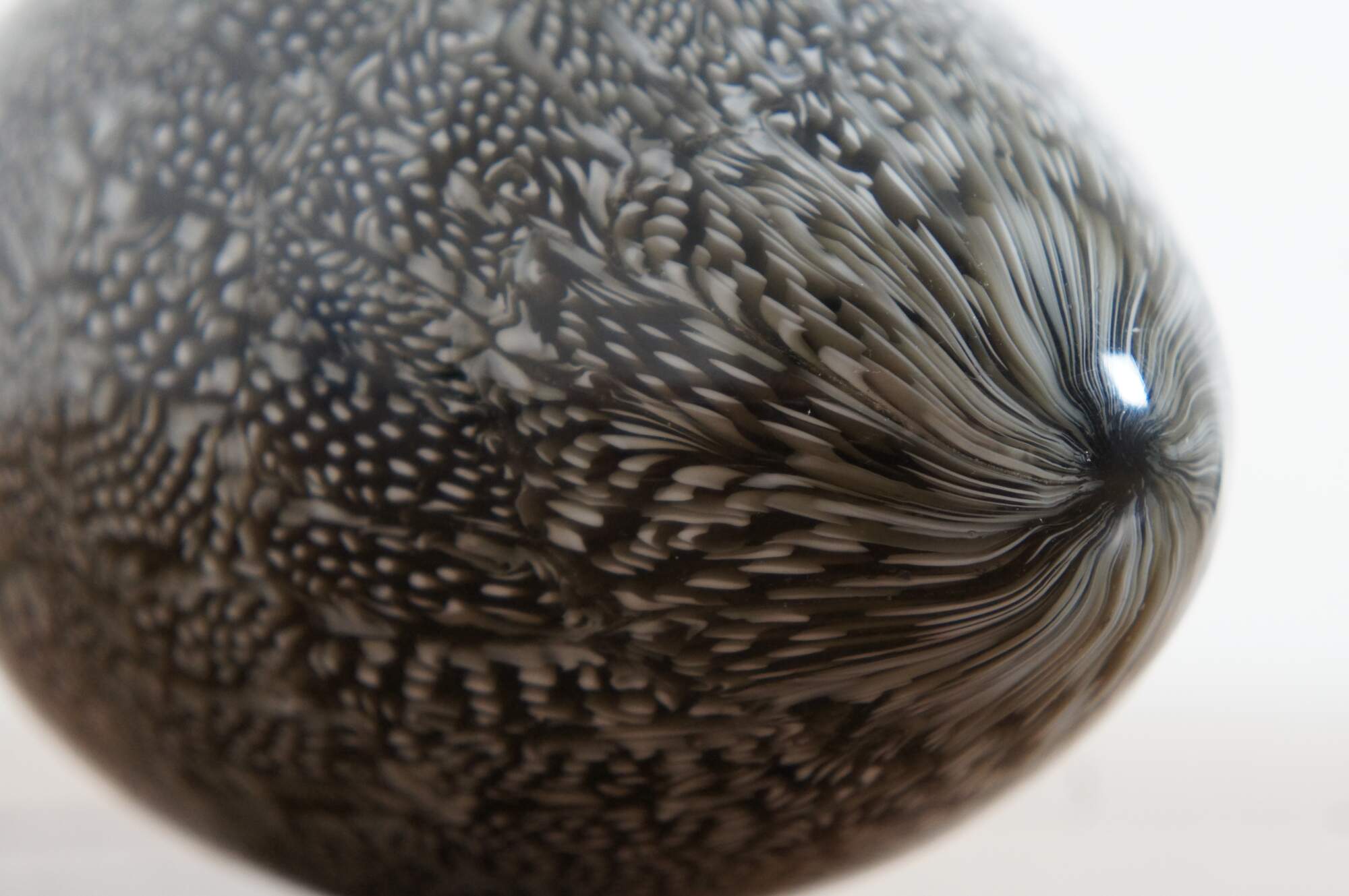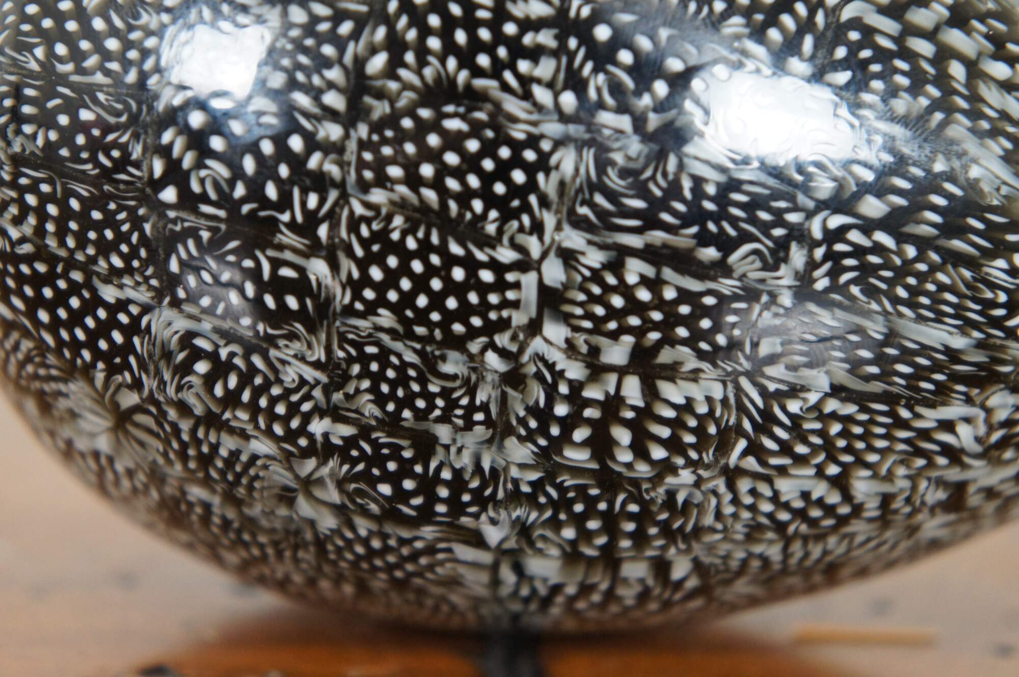 Vintage Murano / Italian art glass egg sculpture / paperweight, featuring a black and white murrine pattern that resembles the speckled feathers of the guinea fowl. Signed Venini Italia.