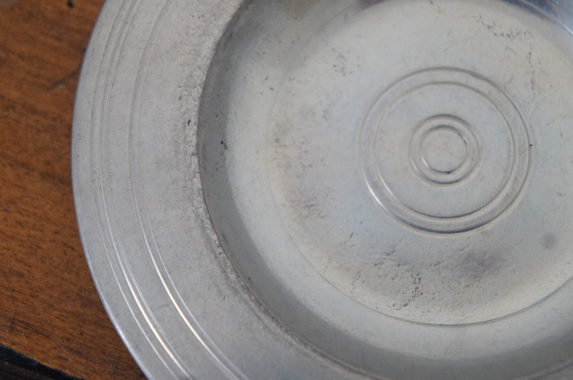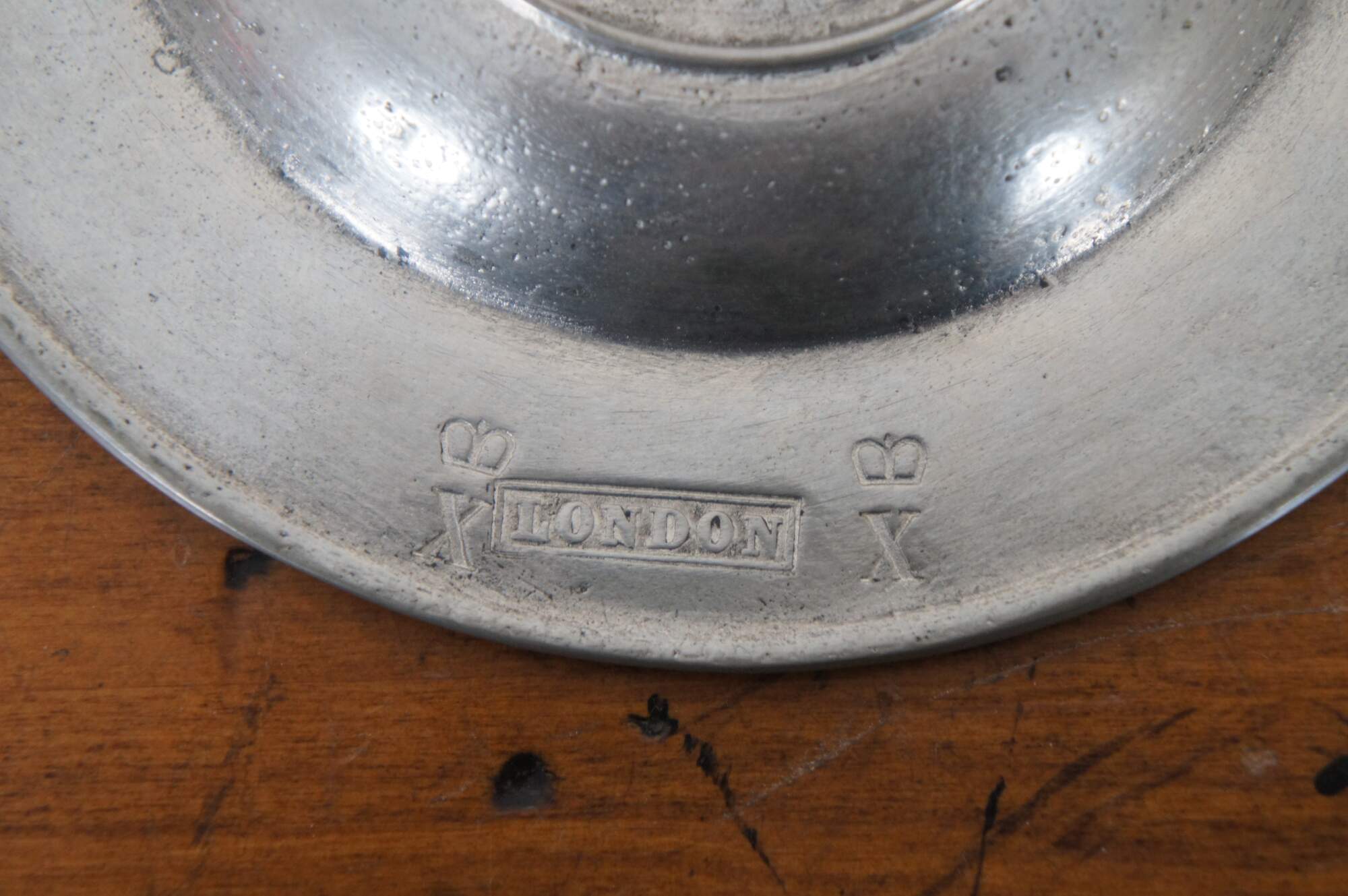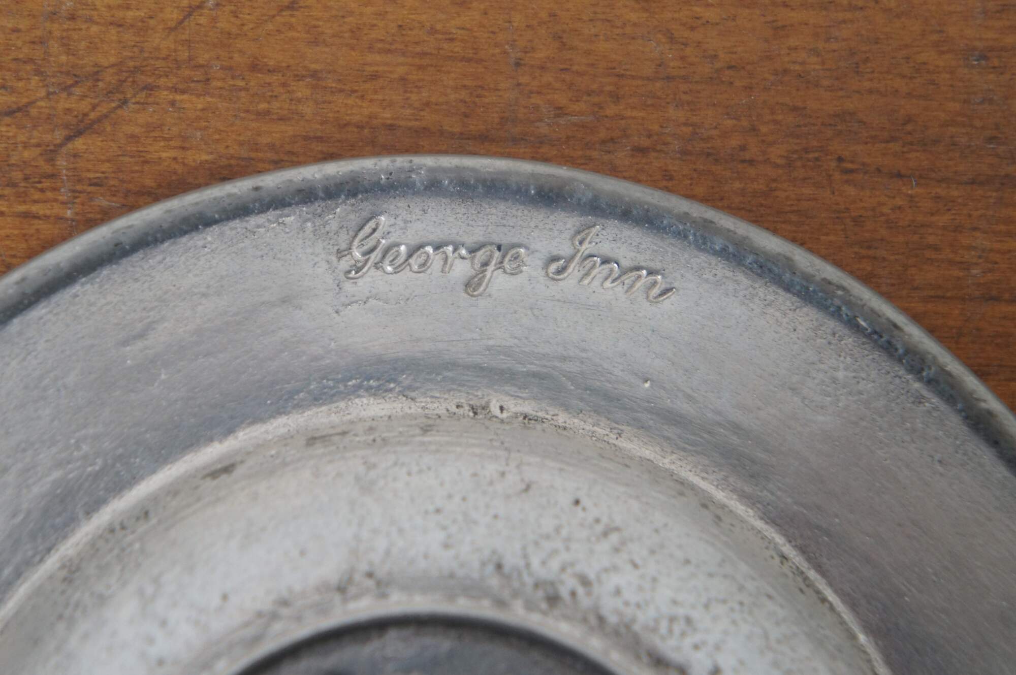 Round pewter nut or bon bon dish, marked on the front edge with four heraldic lion Passants in shields and on the reverse with the name of the George Inn and London flanked by a pair of crowned X pewter quality marks.
