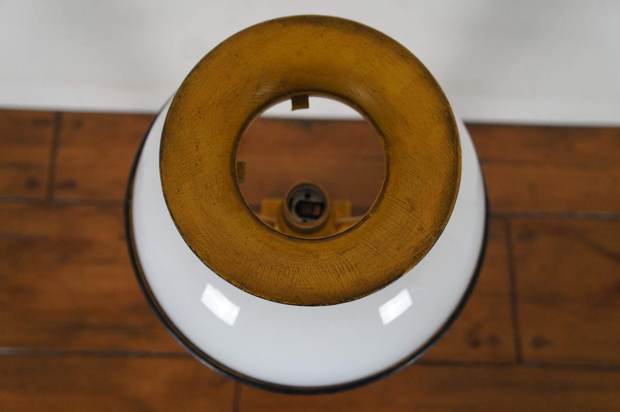 Vintage metal oil / hurricane / bankers style parlor lamp featuring Art Deco styling with mustard yellow / black painted accents and milk glass shade.