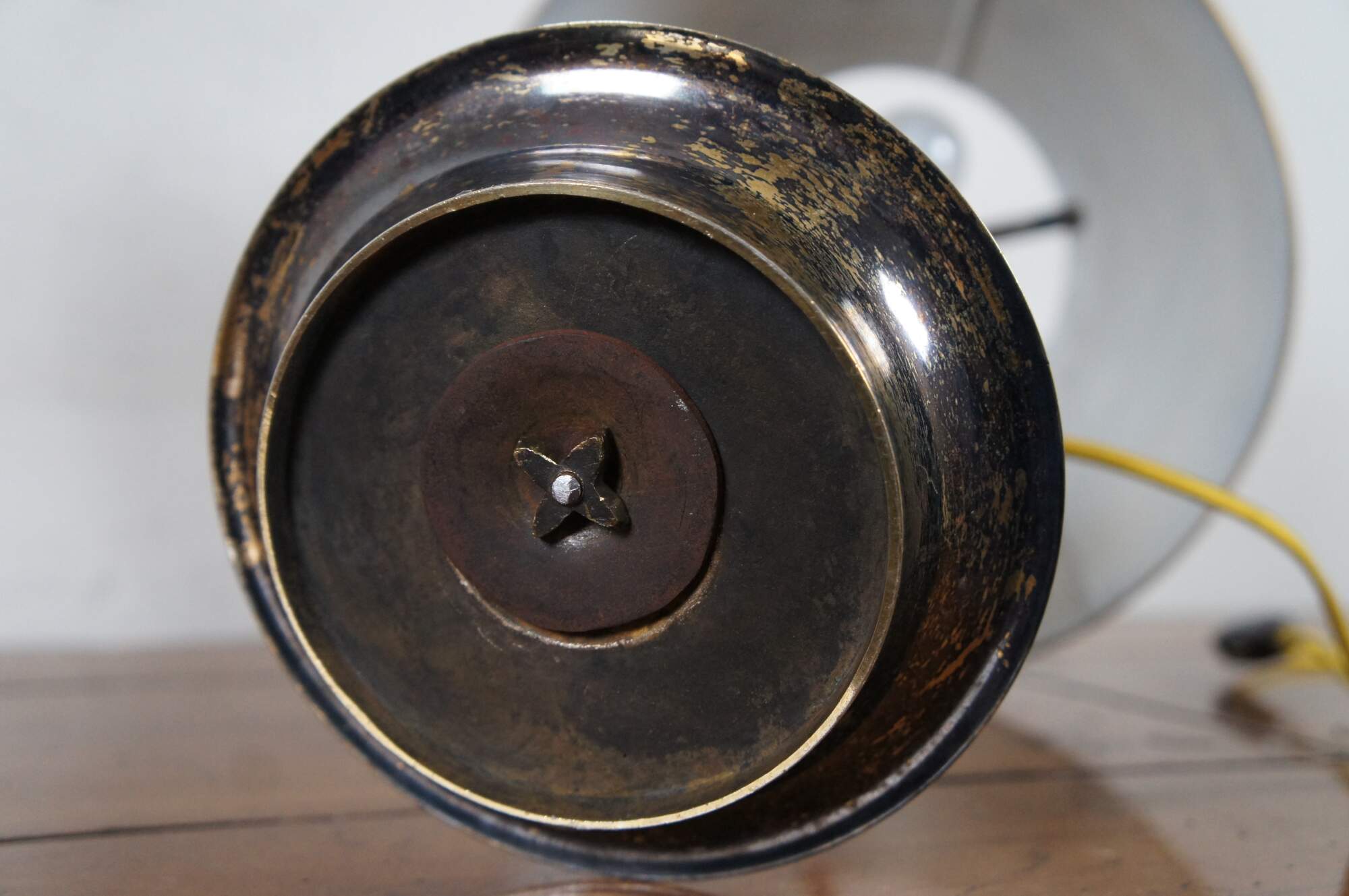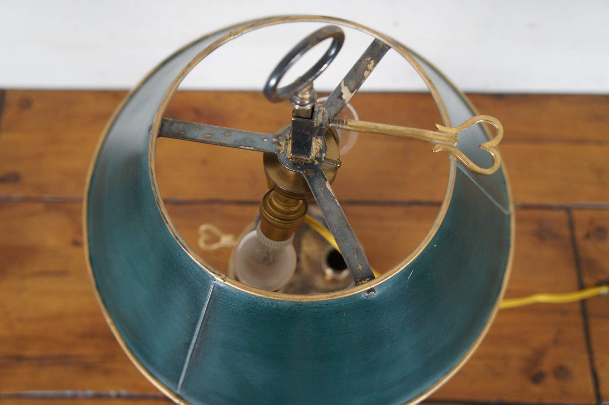 Antique French Neoclassical Bouillotte / Directoire / Hot Water Bottle silver plate three light table lamp, featuring a fluted column with round dish base supporting a three candle tray (height adjustable), with ring finial and heart shaped screw keys and a green and gold painted tole shade.