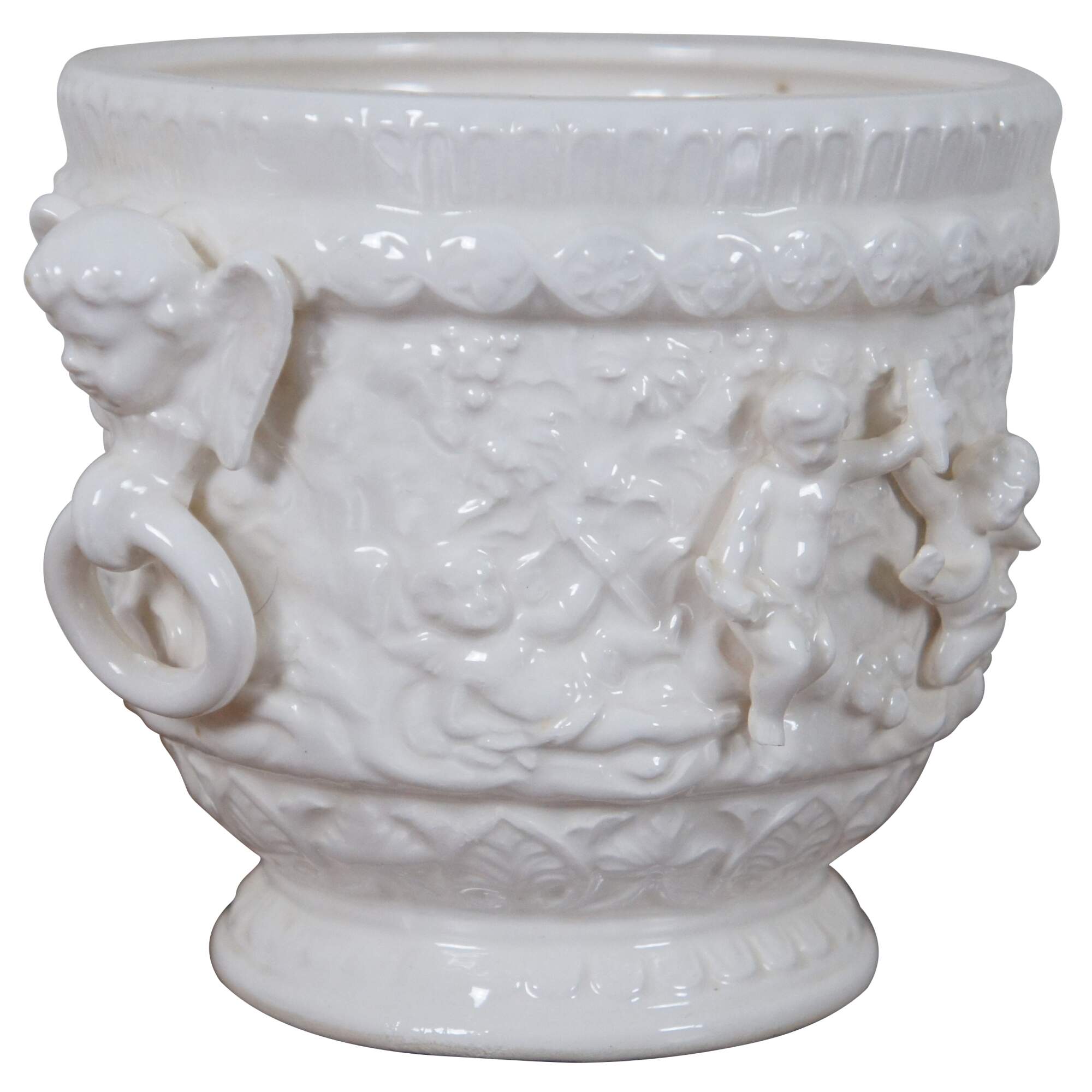 Vintage white porcelain cache pot / flower planter molded with neoclassical motifs and cherubs / Putti including winged cherubs over ring handles.