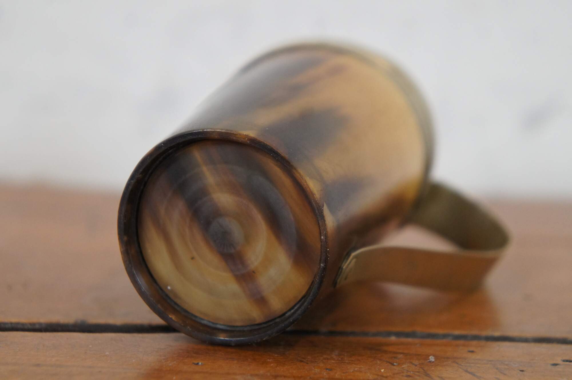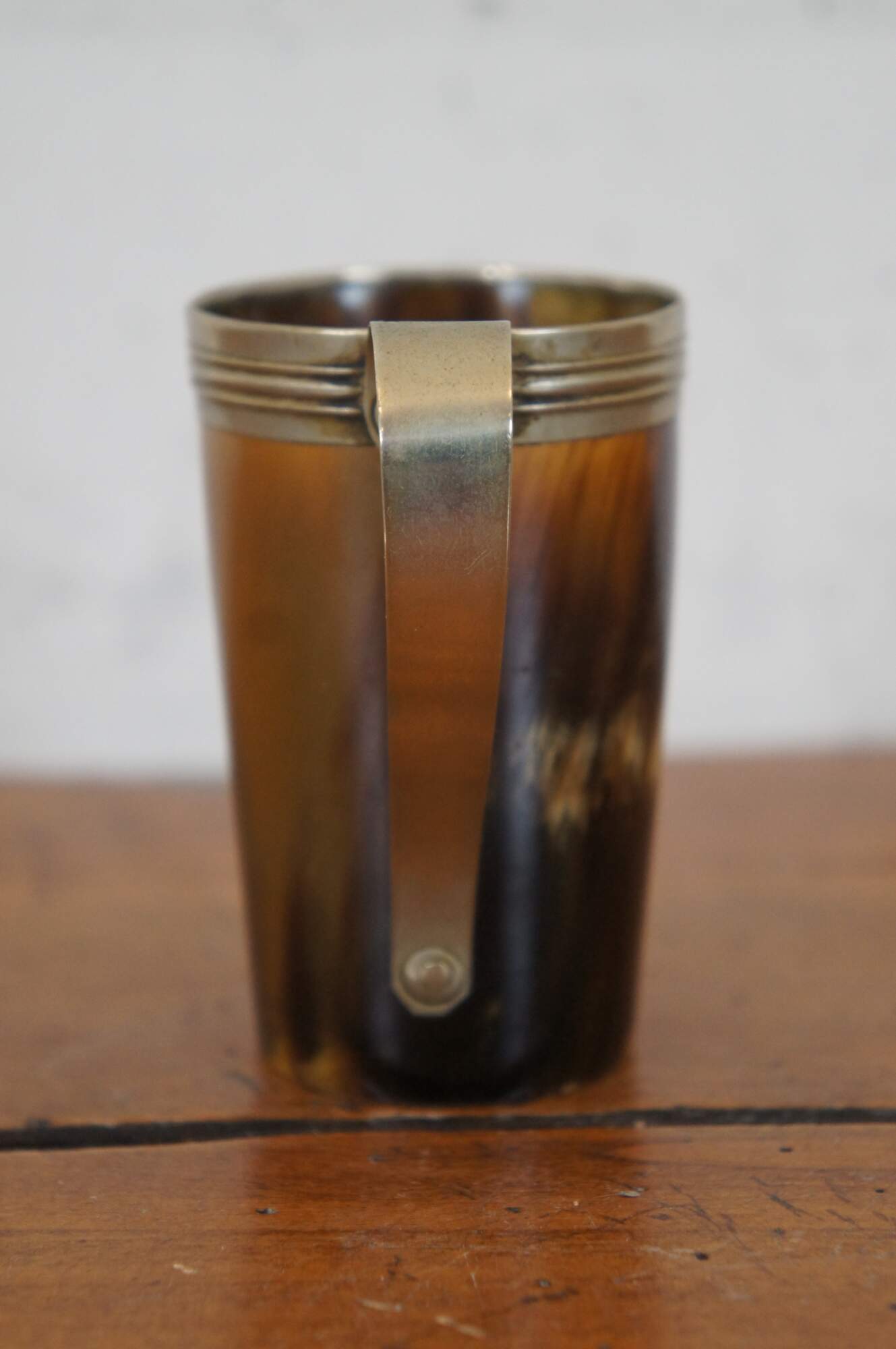 Antique 19th century English Victorian mounted bovine cow horn beaker / goblet / handled cup with grooved sterling silver rim and heraldic shield accent.