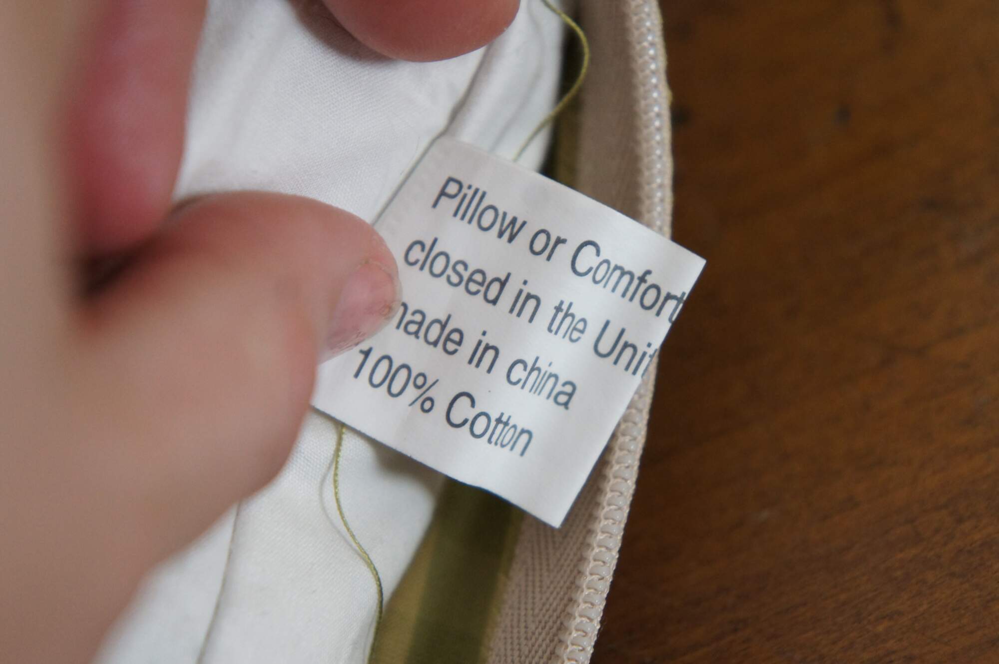 Pair of vintage lumbar throw pillows in green gingham with olive green fringe. Interior form is cotton filled with down/feathers.