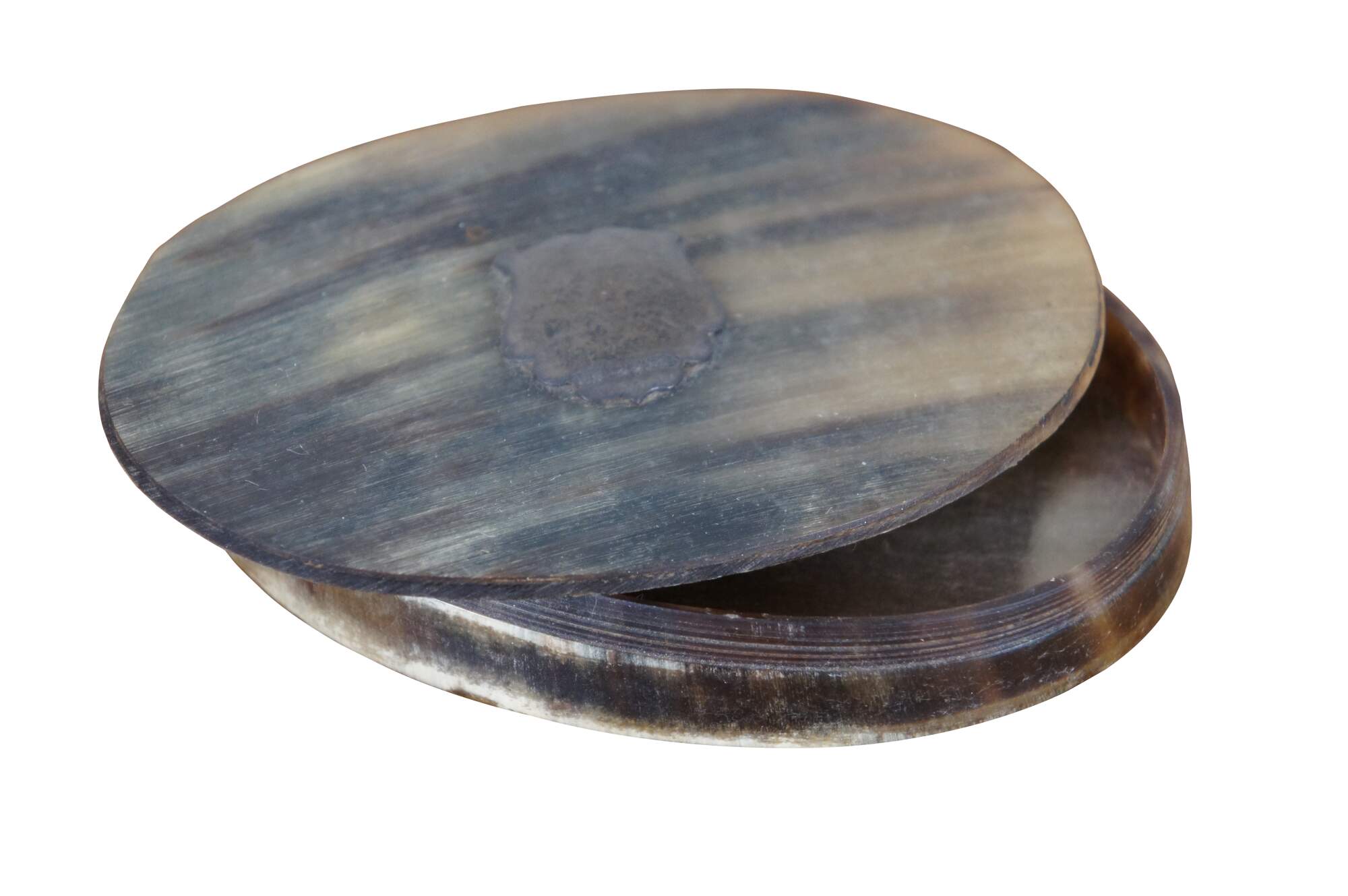 Antique Edwardian horn oval snuff / trinket / pill box, decorated with an unmonogrammed sterling silver 925 shield / crest / plaque.