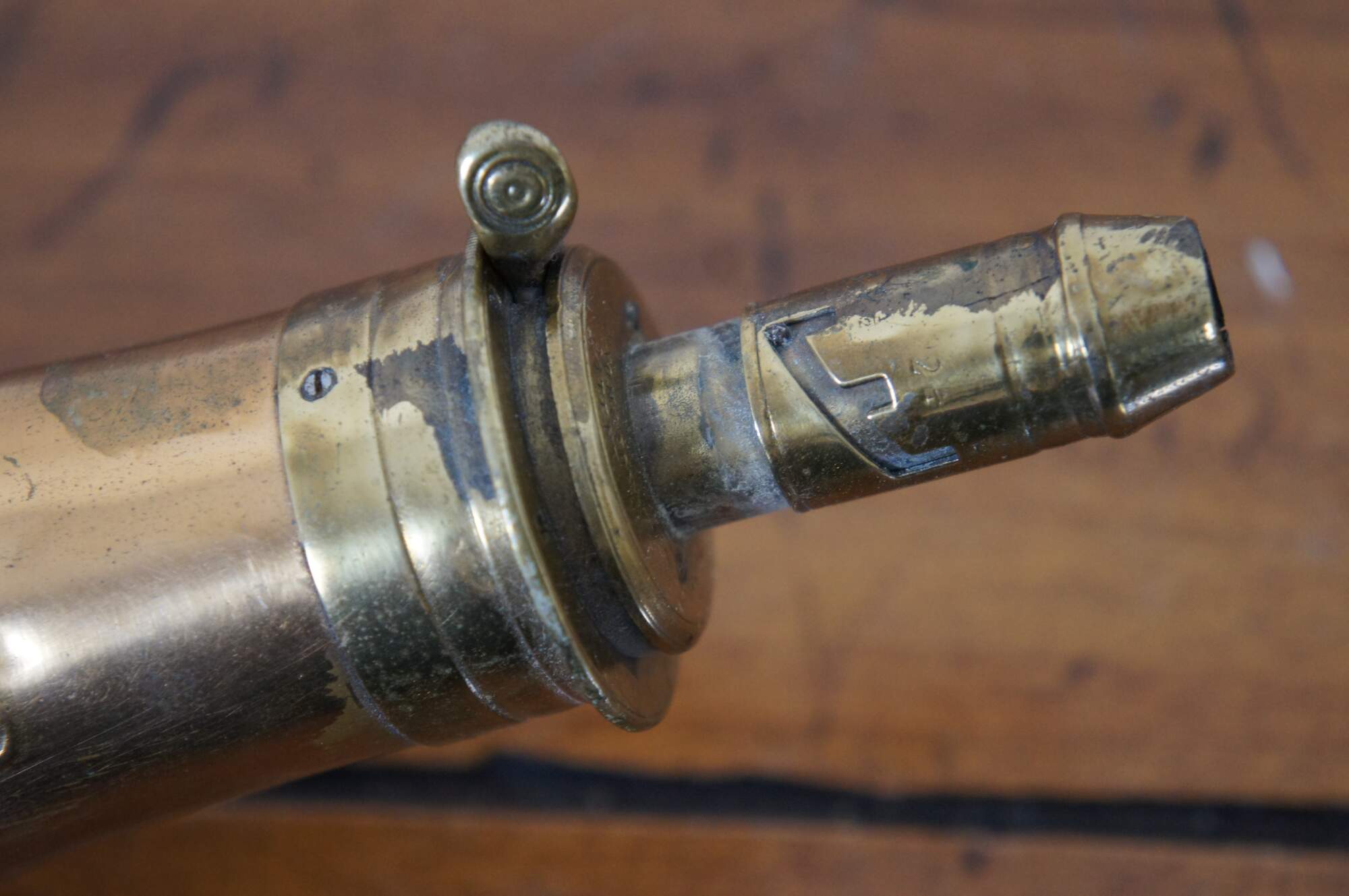 Antique English circa 1850’s copper and brass powder flask horn by James Dixon & Sons, featuring a molded motif of hanging game (rabbin / pheasant / duck / birds) and an adjustable dram measure at the top indicating 2, 2 ¼ and 2 ½ drams.