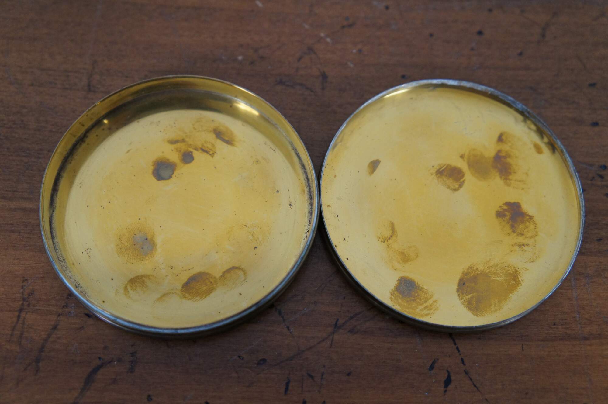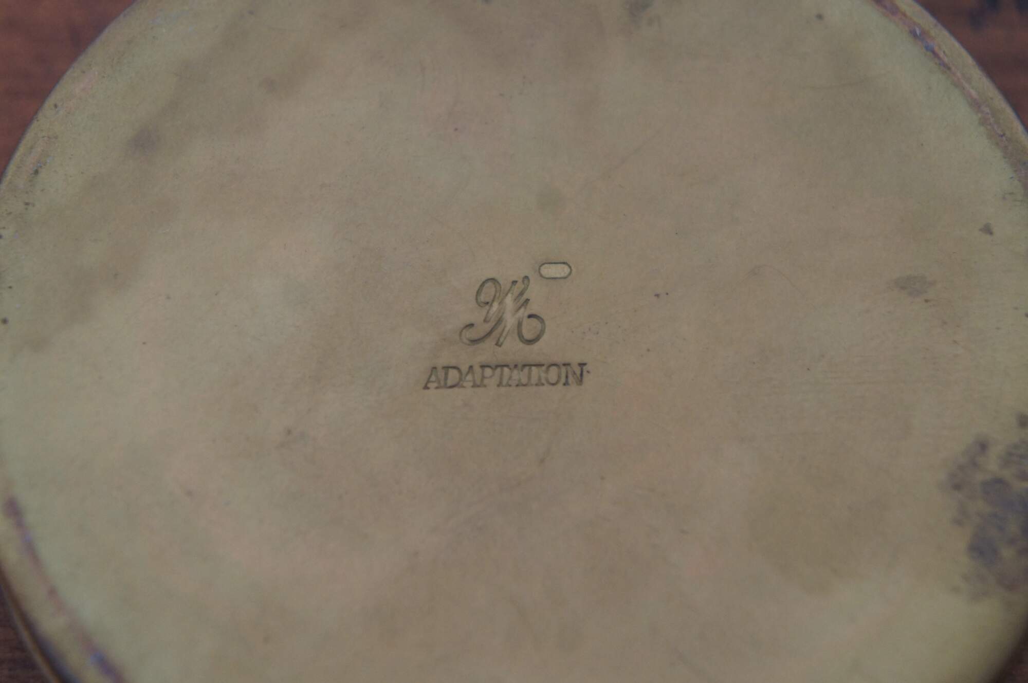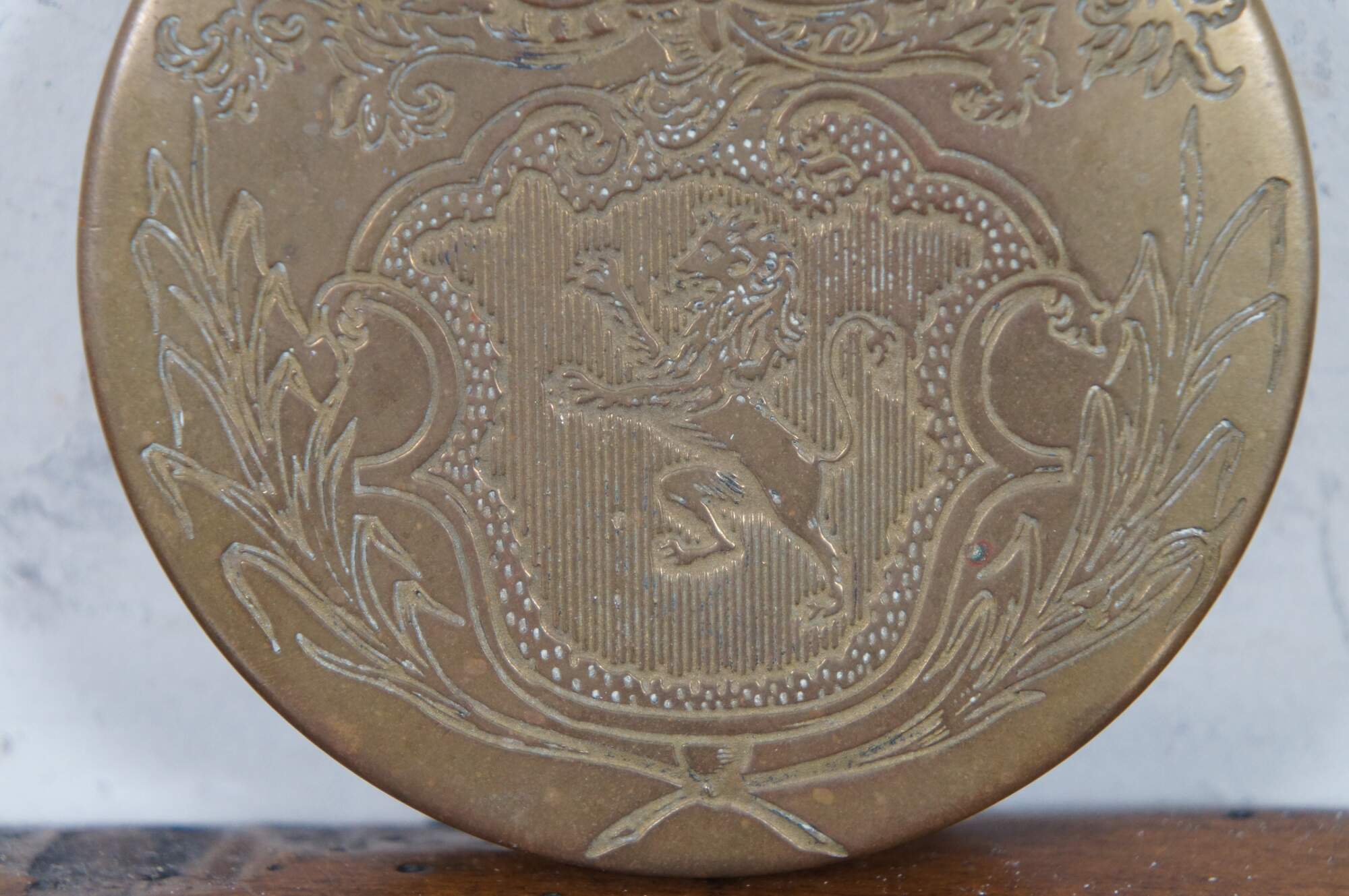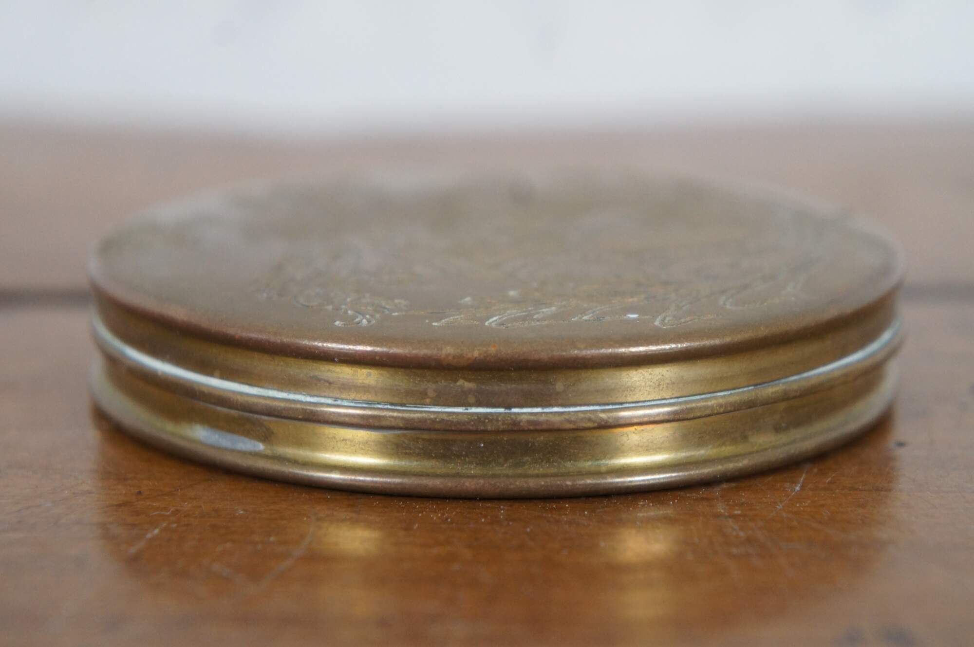 Vintage reproduction brass snuff / trinket / pill box engraved with a coat of arms featuring a lion passant rearing on a shield or crest, surrounded by wheat sheaves, foliate leaves, and a swan on a nest; marked WM Adaptation.