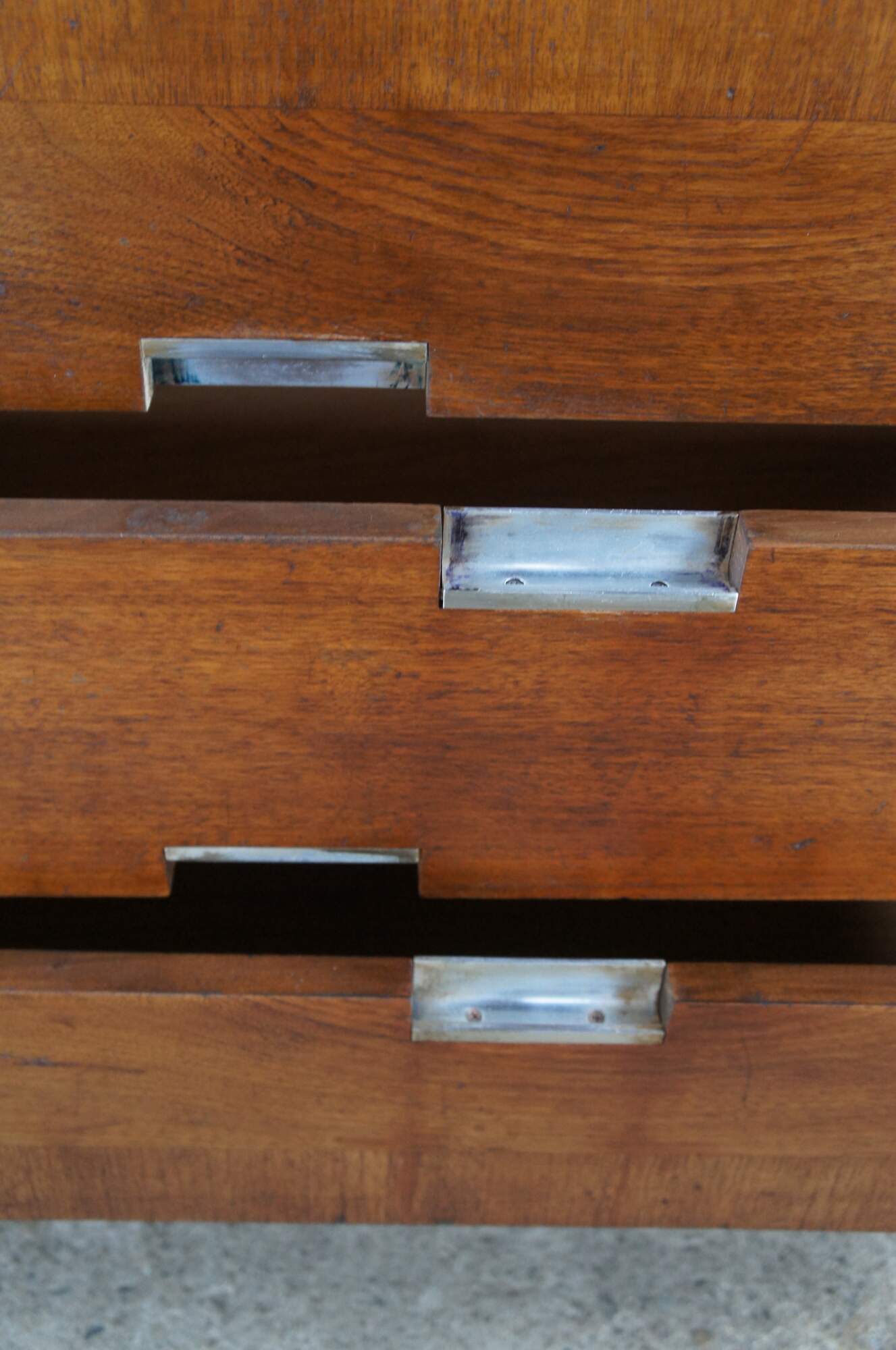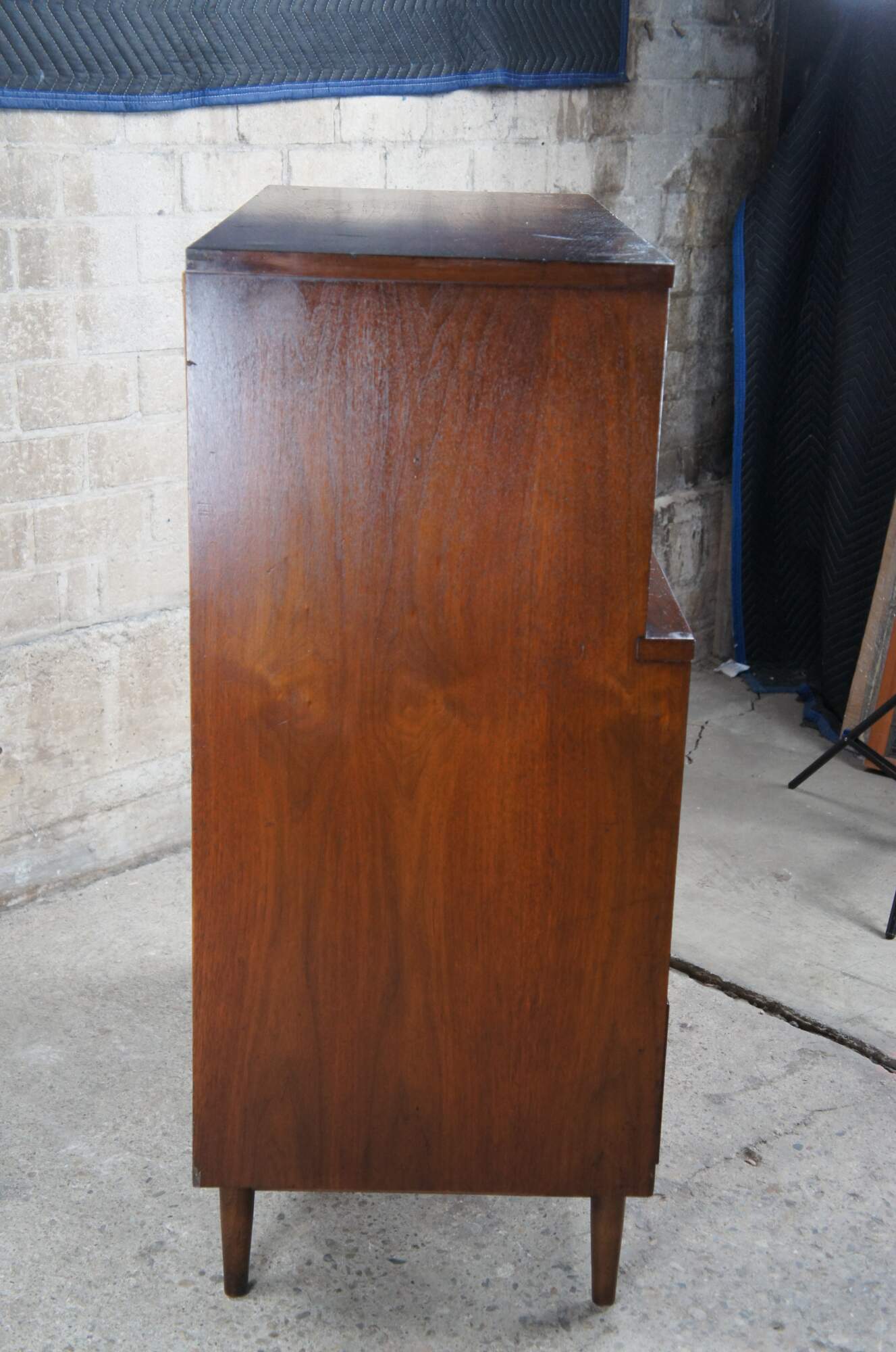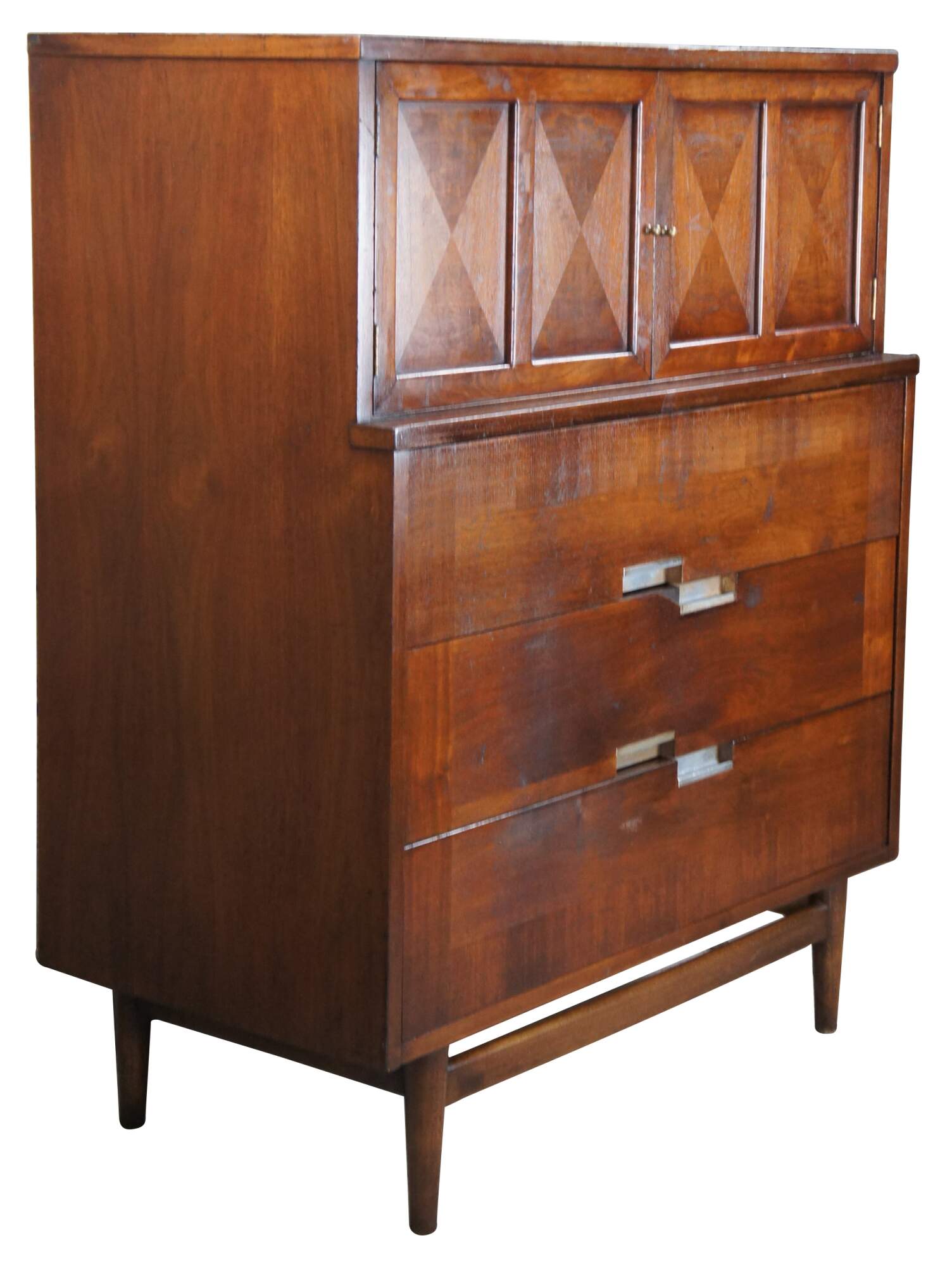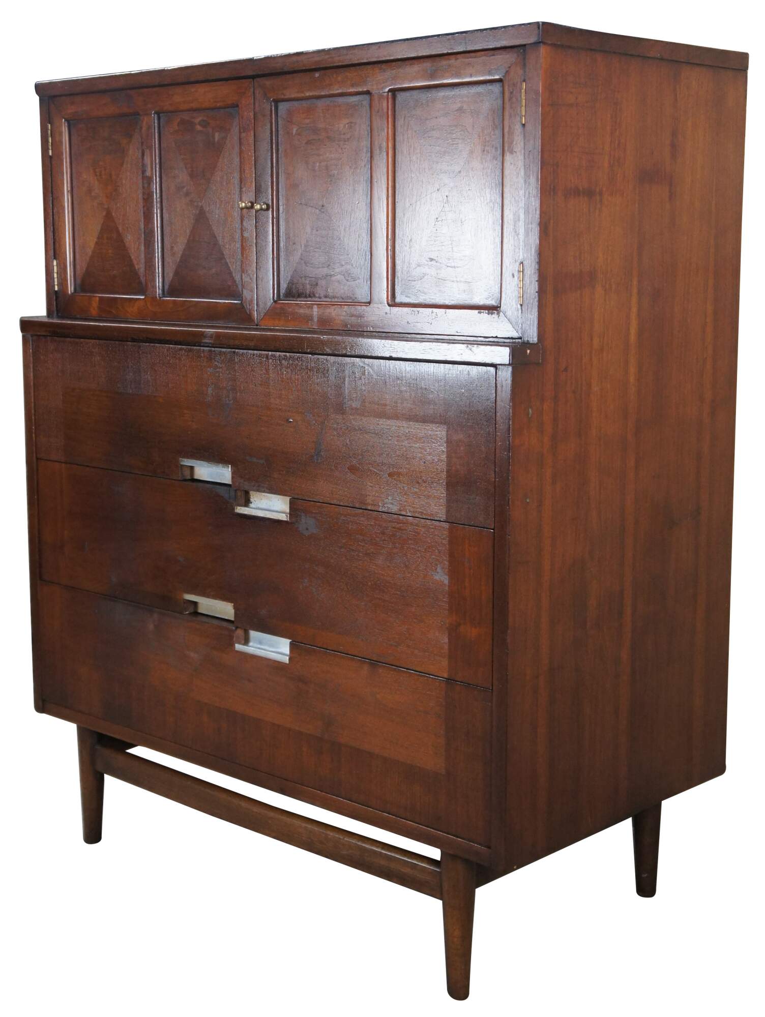 2 Mid century modern Accord Bachelor Chest of Drawers designed by Merton Gershun, American (1909-1989) for American of Martinsville. Made of walnut featuring inset top that opens to two drawers, over three more drawers with inset aluminum handles. 6802.