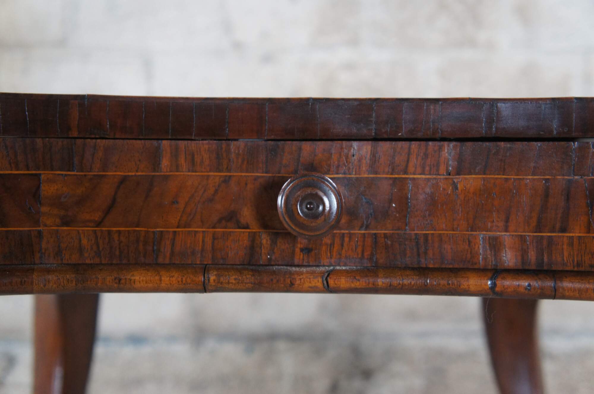 Antique Federal Period flip top game table or entry console, circa 1820. Features a serpentine form made from flame mahogany with cross banding, matchbook veneer, burled panels and inlay. Includes a long drawer with wooden pull within the frieze. The console is supported by long scrolled cabriole legs leading to horse hoof feet.