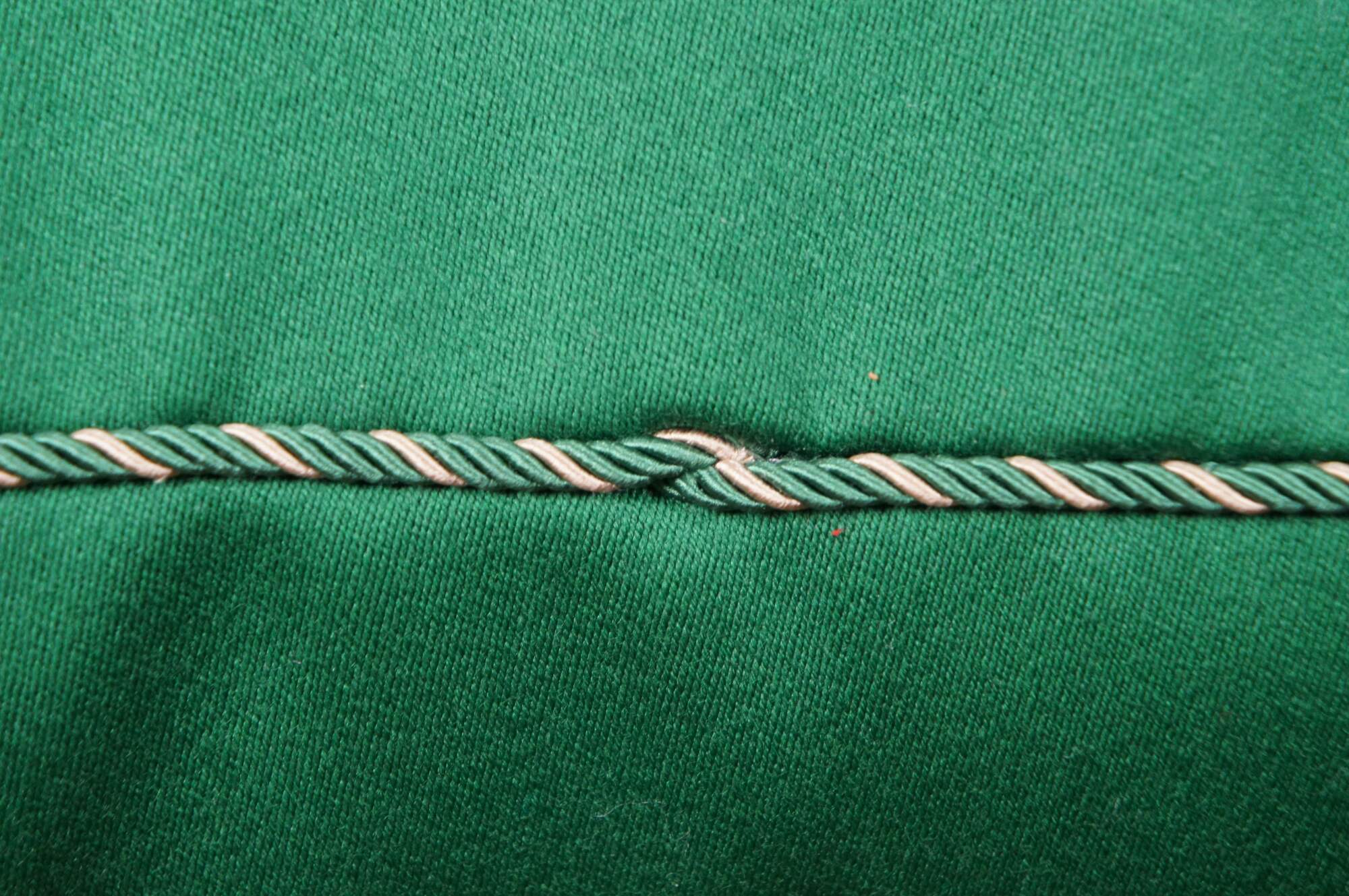 Pair of vintage emerald green silk, down filled throw pillows with green and gold French welting / piping around the edge.