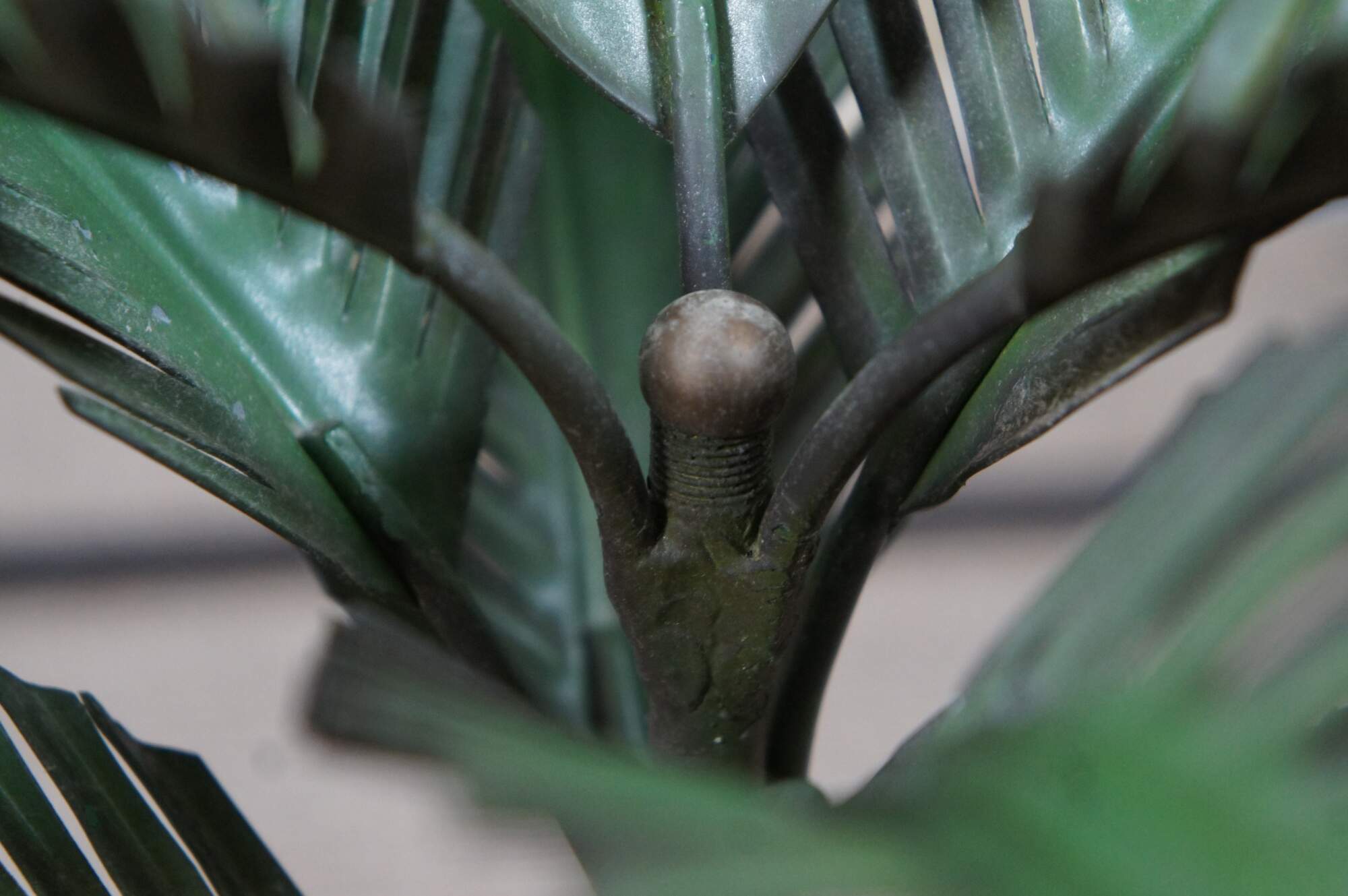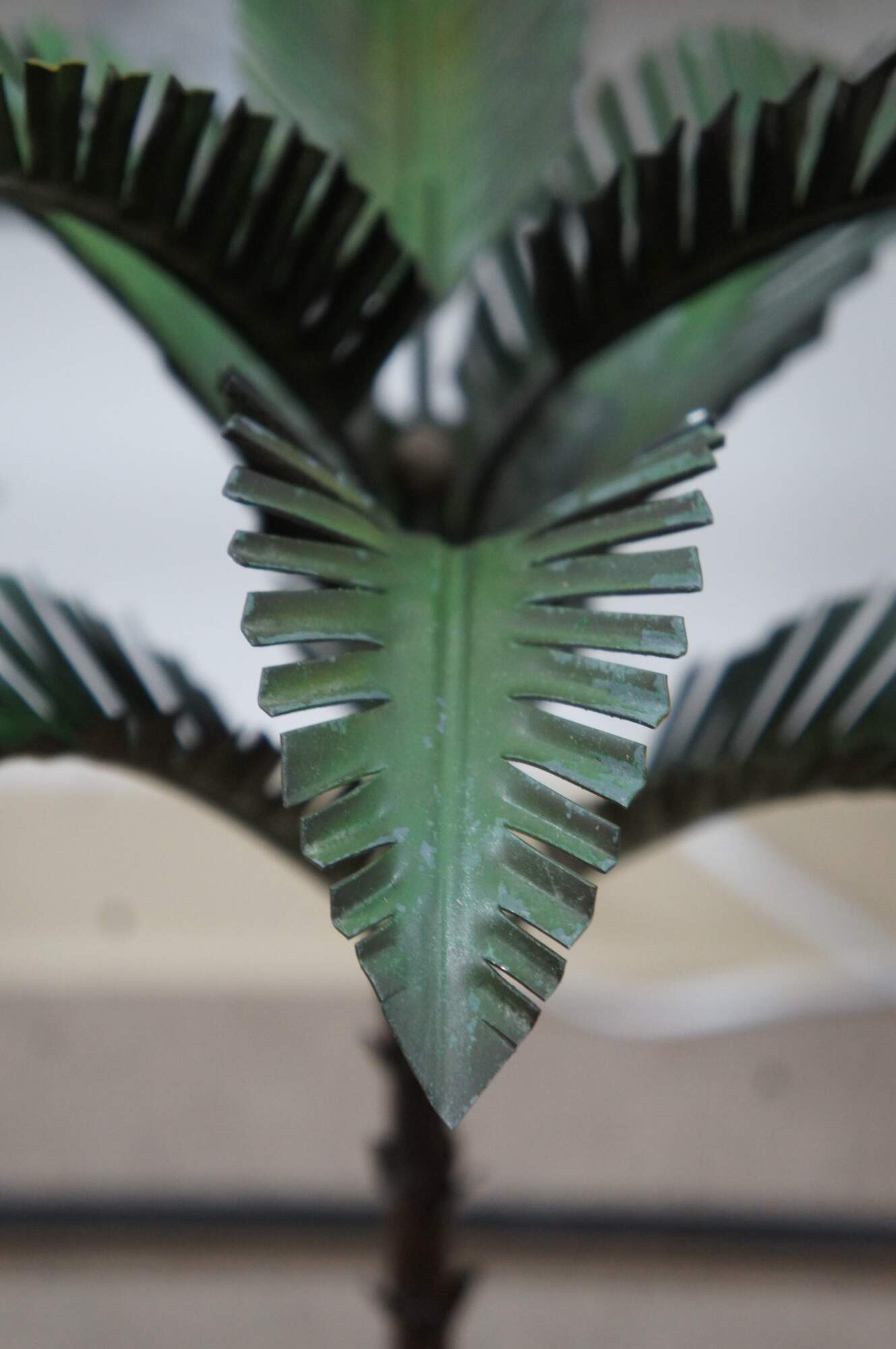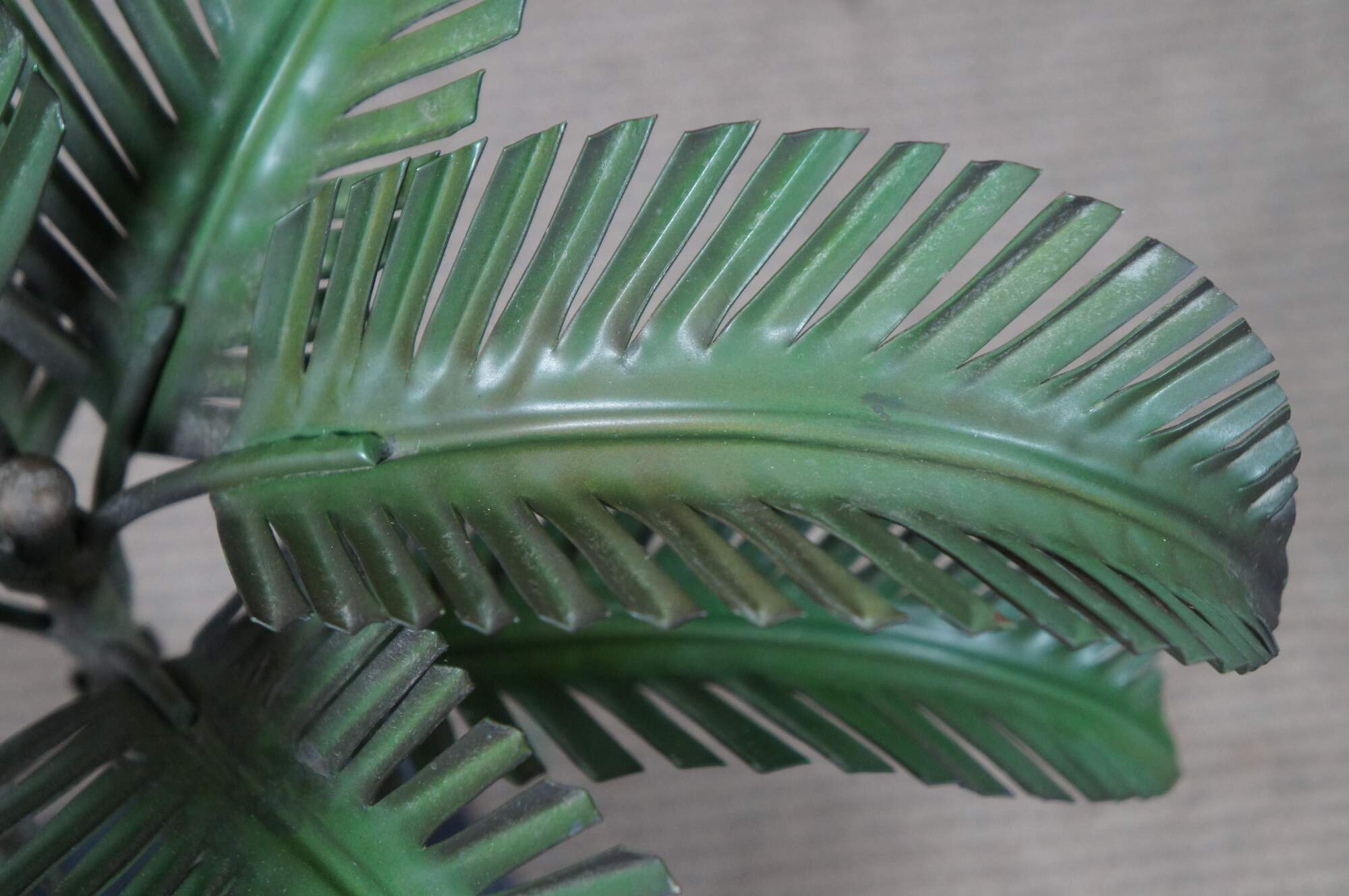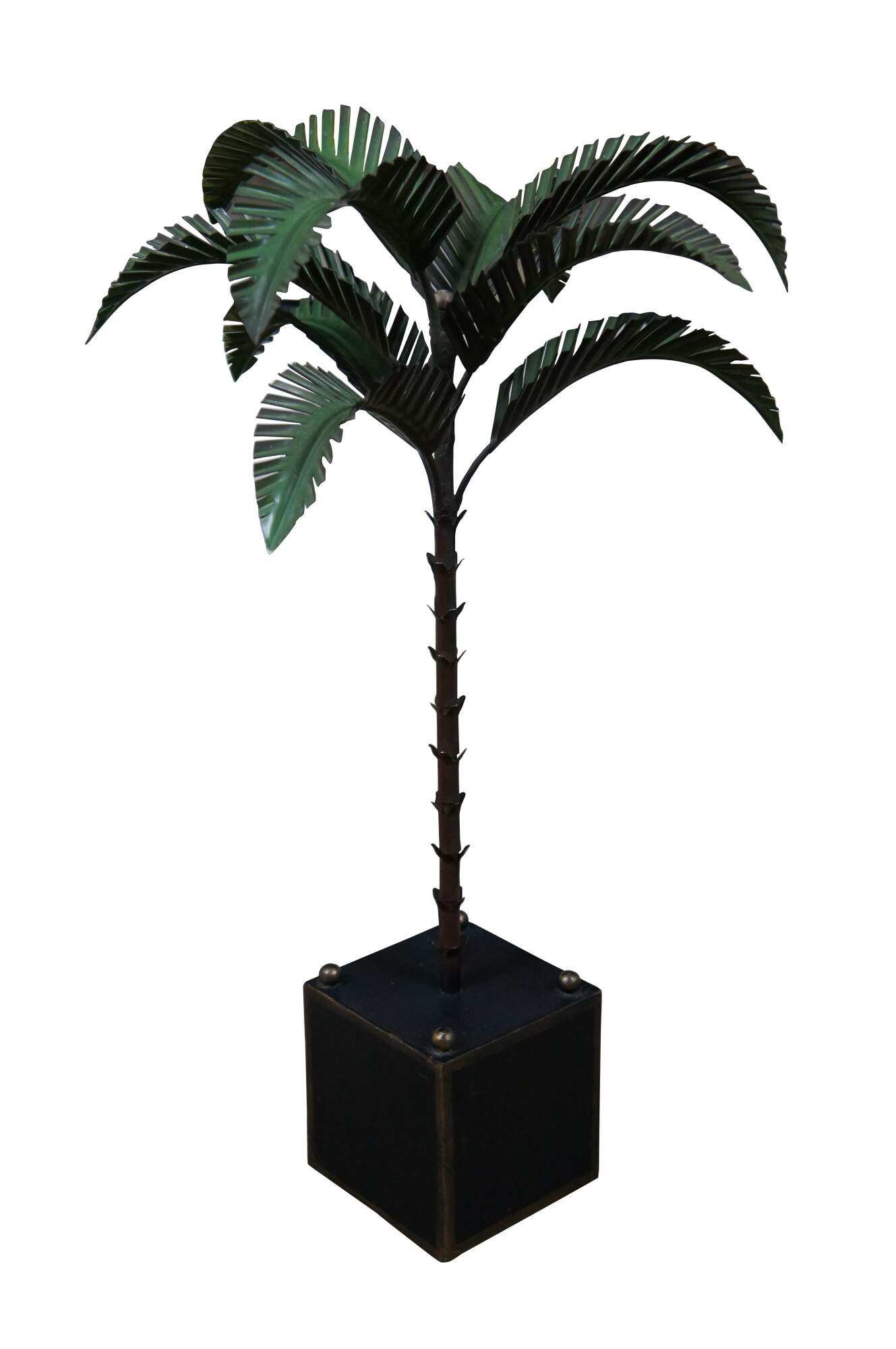 Mid century 1960’s Italian toleware painted metal lamp or sculpture in the shape of a palm tree perched on a black and gold planter base with gold ball feet and finials. Numbered 1-2038, made in Italy. This was originally a lamp, but was converted to a sculpture. Could easily convert back to a lamp if interested.