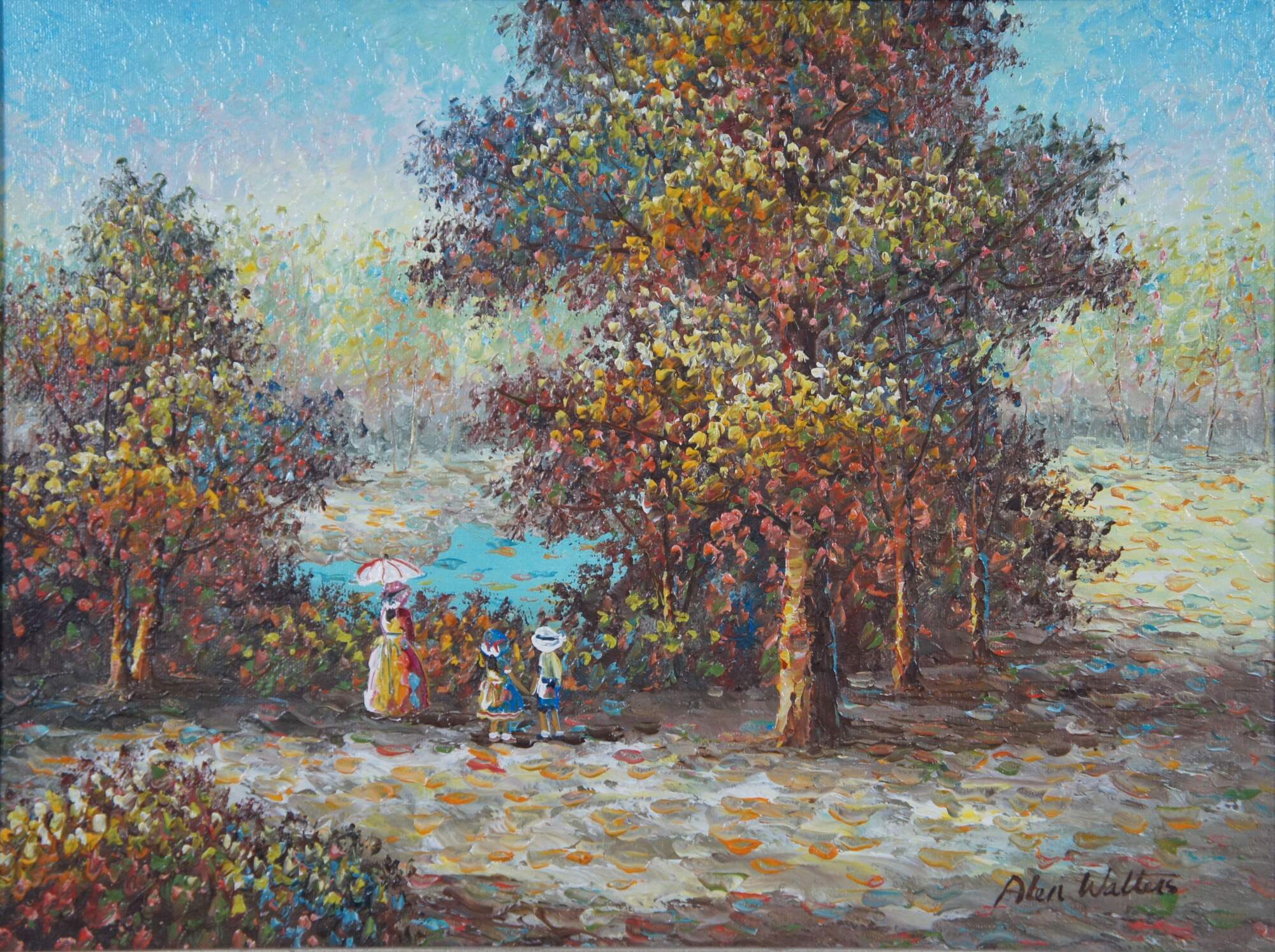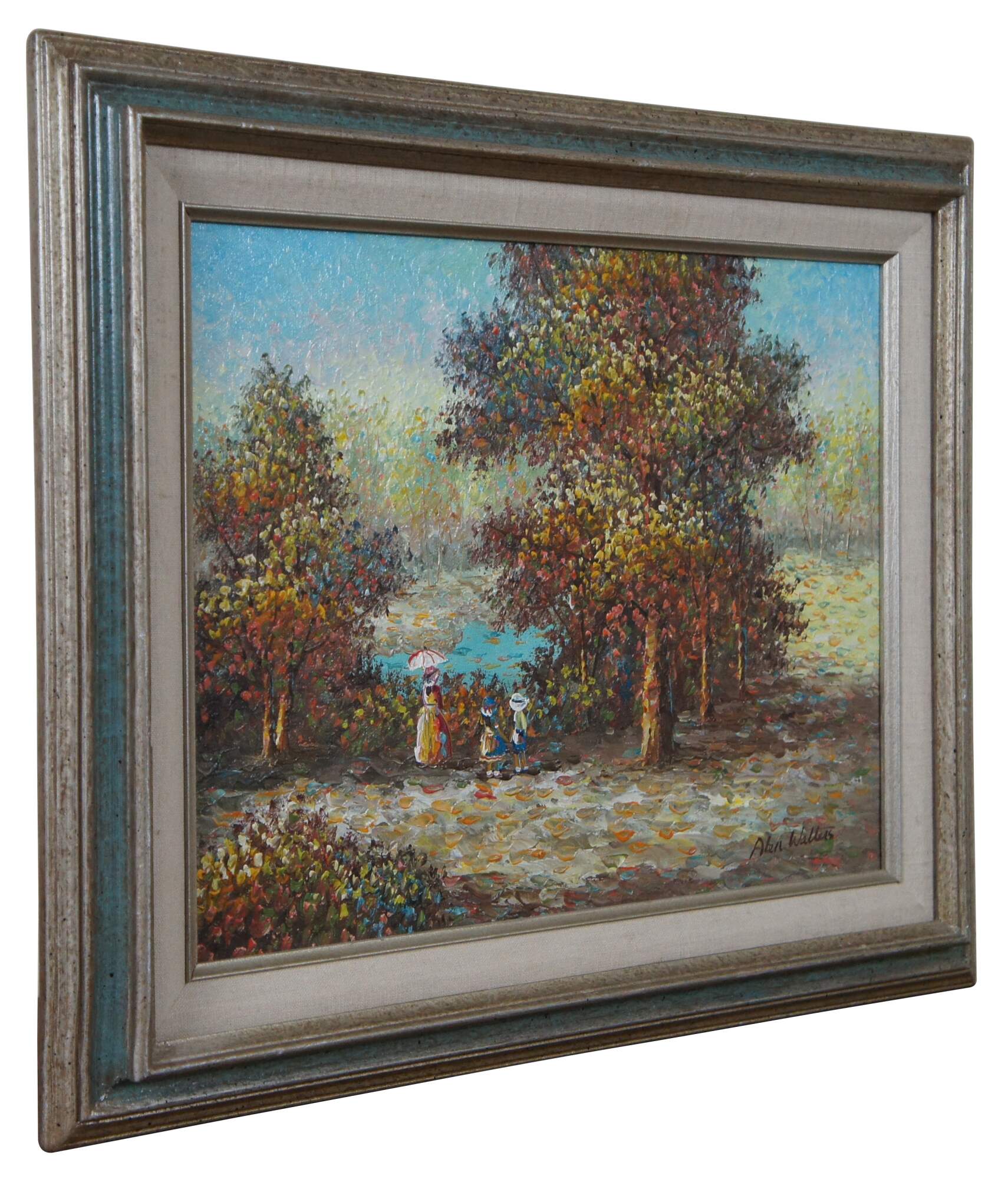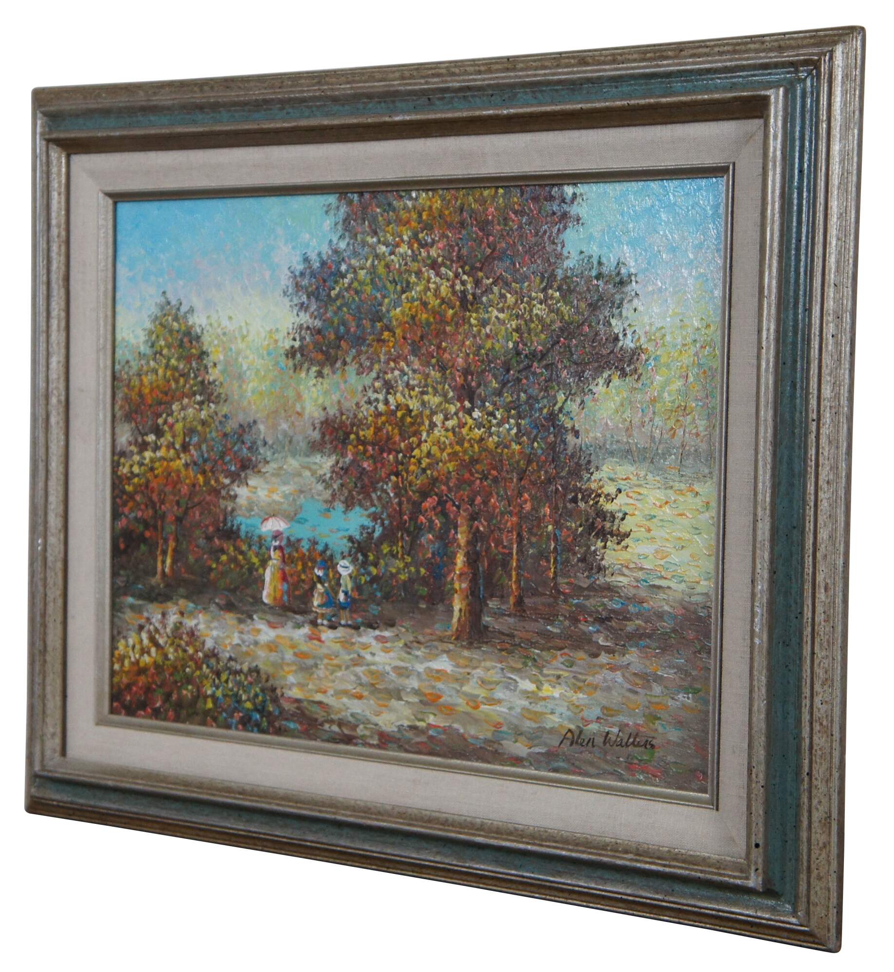 Vintage oil on canvas impressionist / expressionist style painting signed by artist Alen Walters, showing a tree lined landscape by a pond with three figures in Victorian dress.