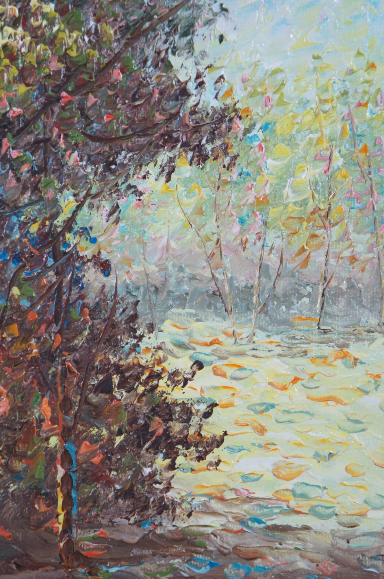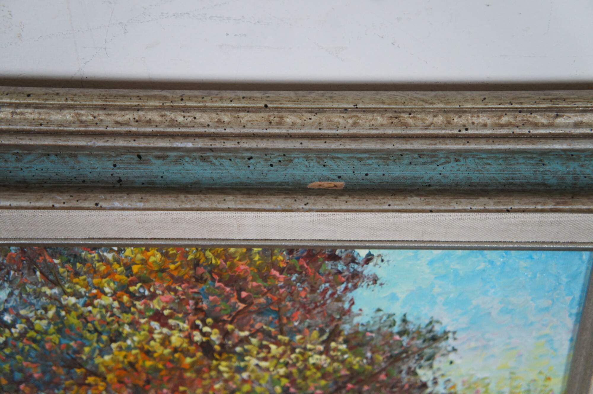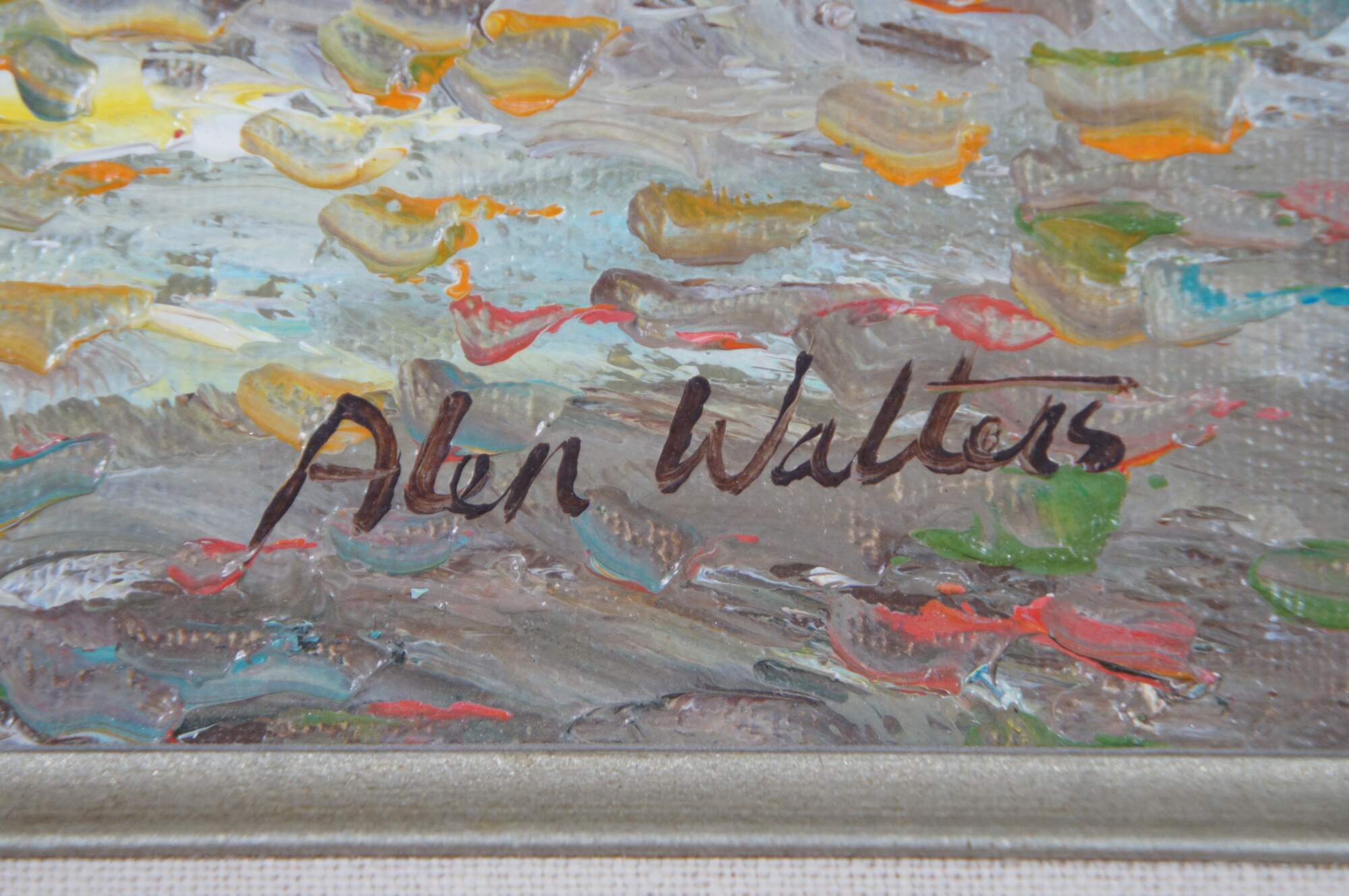 Vintage oil on canvas impressionist / expressionist style painting signed by artist Alen Walters, showing a tree lined landscape by a pond with three figures in Victorian dress.