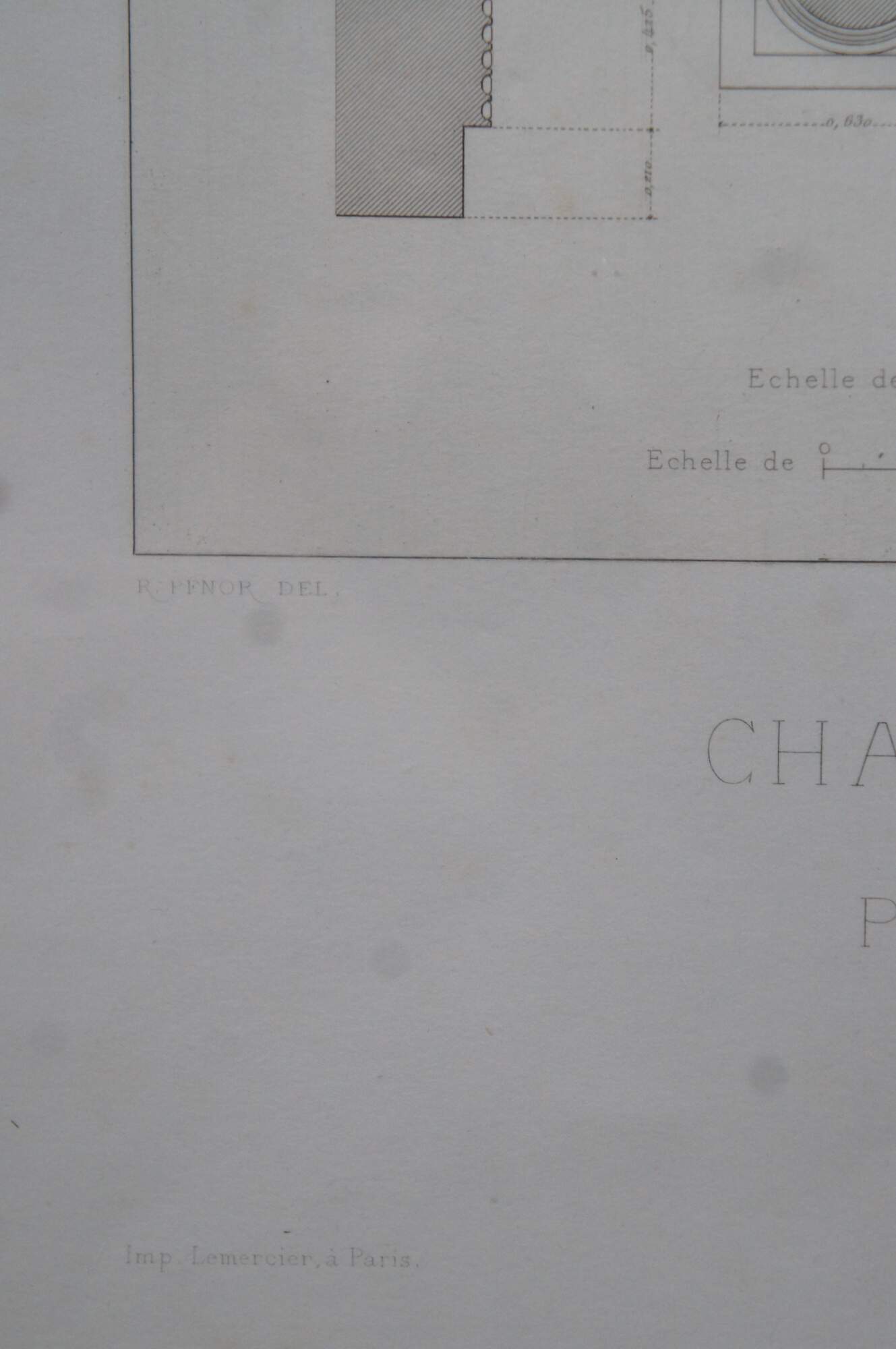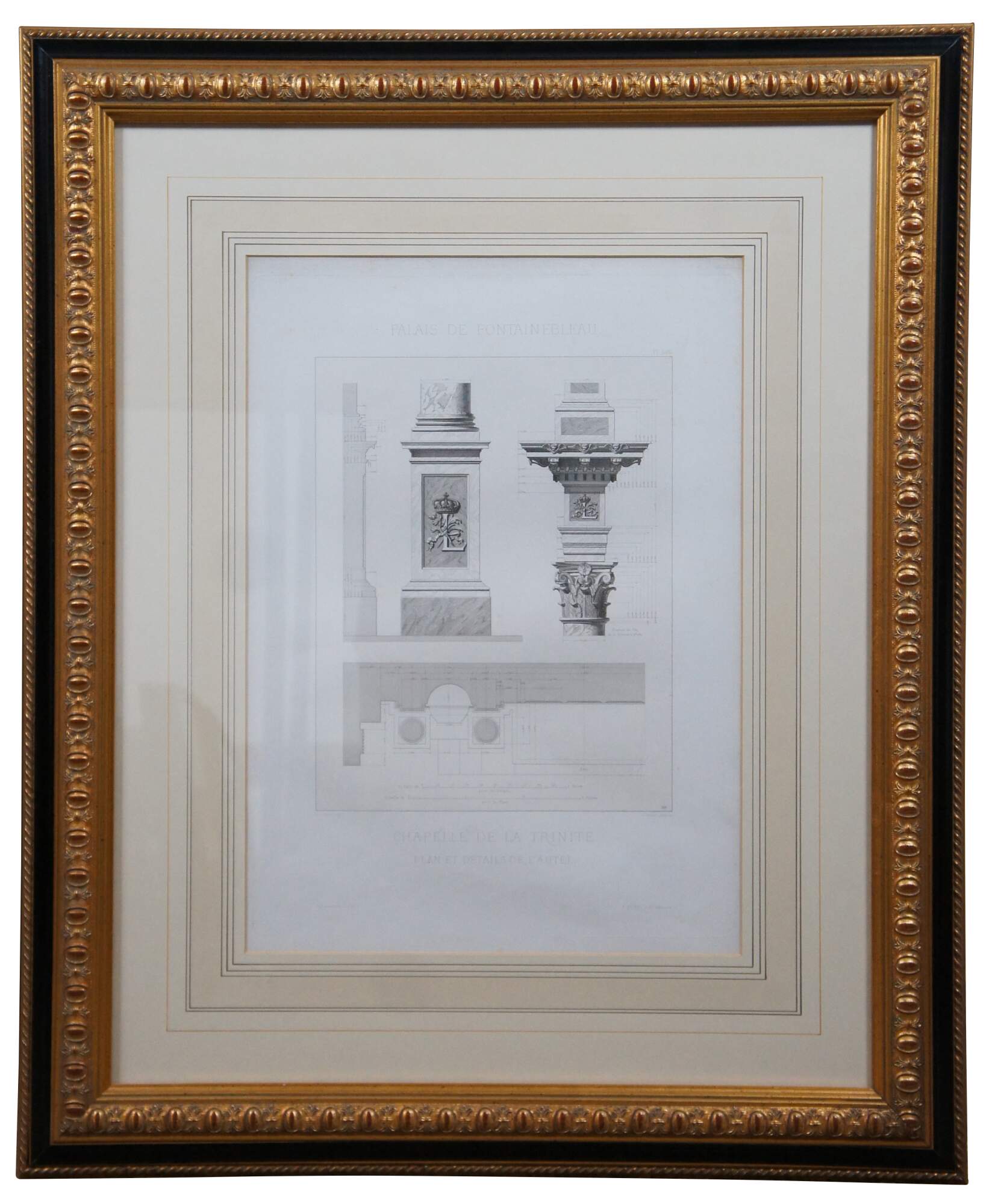 Pair of antique 19th century framed engravings of architecture of the Palais de Fontainebleau (Fontainebleau Palace). 1) Fragments Montant de Porte Chapiteaux en Marbre Provenant de Demolitions (Fragments Marble Capitals and Doorposts From Demolitions), drawn by Rodolphe Pfnor, engraved by Thomas Talbot Bury. 2) Chapelle de la Trinite Plan et Details de L’autel (Chapel of the Trinity Altar Plan and Details), drawn by Rodolphe Pfnor, printed by Lemercier & Co of Paris, Engraved by J. Penel. Both produced by A. Morel et Cie Editeurs of Paris.