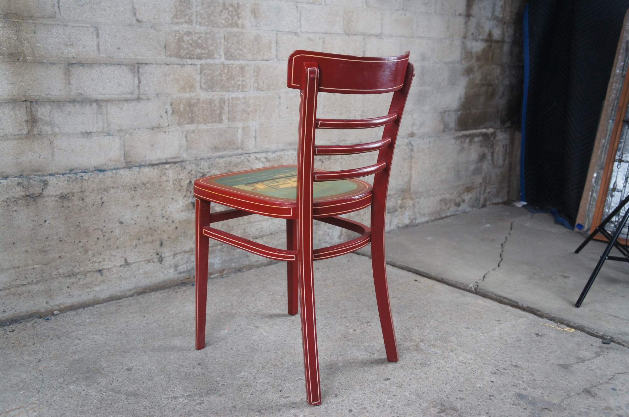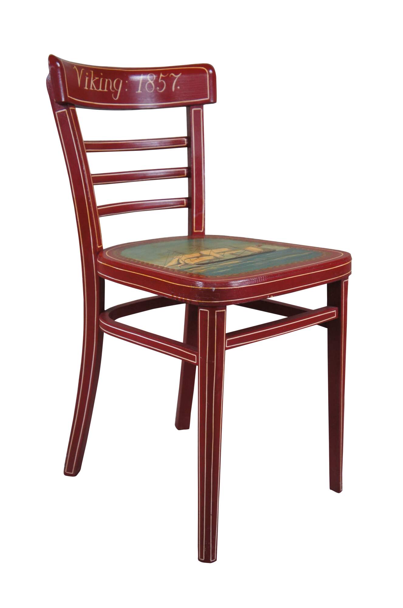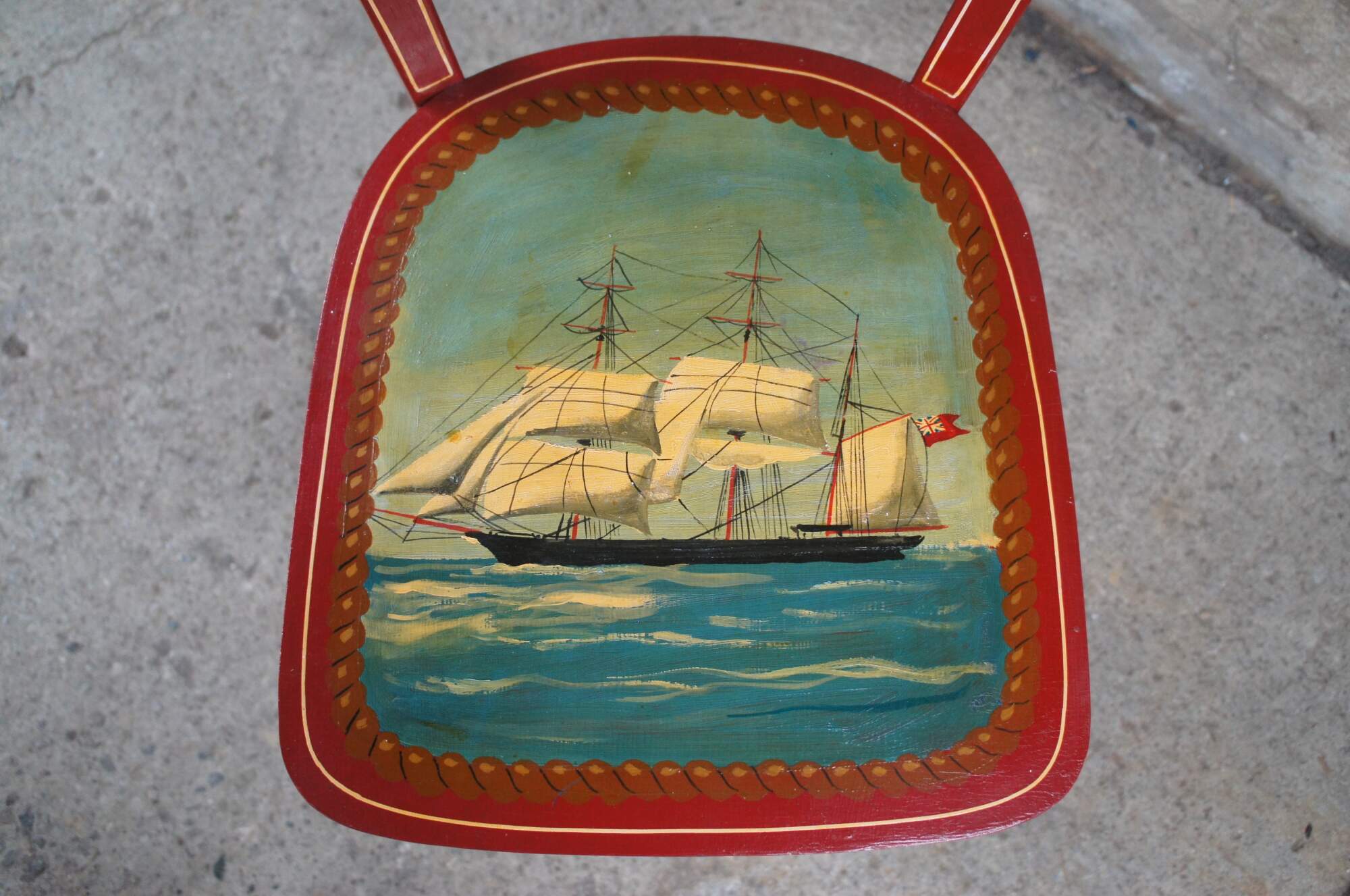 Vintage folk art nautical maritime design side chair featuring a hand painted Viking Clipper ship with rope twist border sailing the ocean with a red ensign or ""Red Duster"" flag, which is the civil ensign of the United Kingdom of Great Britain and Northern Ireland. Marked Viking 1857.