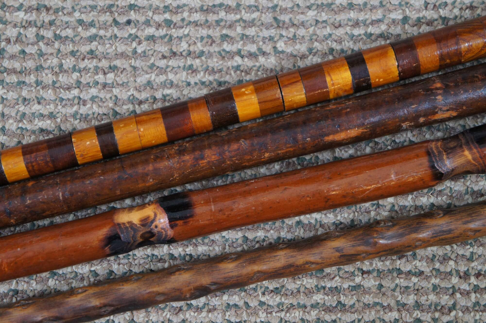 Lot of seven vintage walking sticks / canes including one contemporary orange aluminum adjustable with brown plastic ergonomic / crutch handle; black lacquered / carved Asian cane with dragon head derby handle with flashlight in the front tip (currently non-functional); rough wood crook top; a polished and turned wood knob top; ball / knob top fashioned of discs of alternating color woods; ball /knob top black lacquer and painted Japan souvenir cane; and ball / knob top polished wood cane with turned divots along the length. Includes contemporary black metal stand, vase shaped with molded rose band.