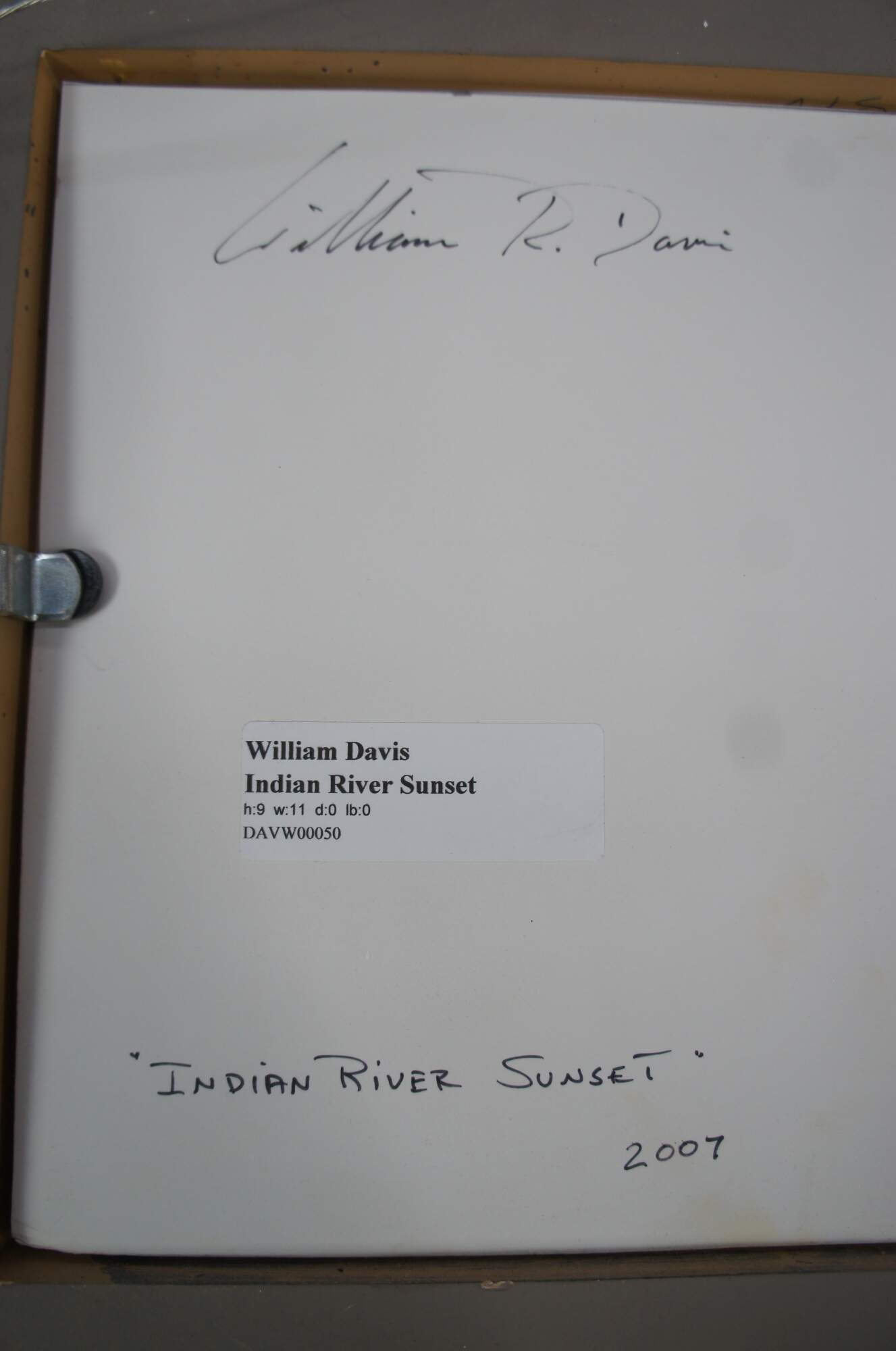 Vintage William R Davis oil painting on board featuring a landscape / seascape with a bird, trees and a view of the Indian River at sunset. Signed lower left and on verso. Purchased circa 2007 at the Vero Beach Meghan Candler Gallery, """"On the Water"""" exhibition.