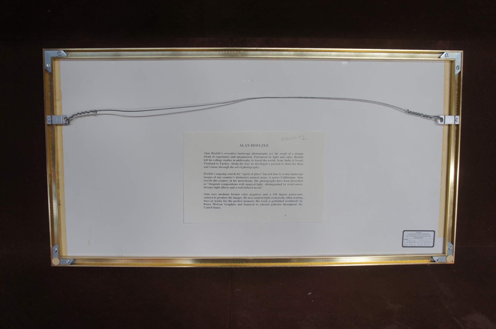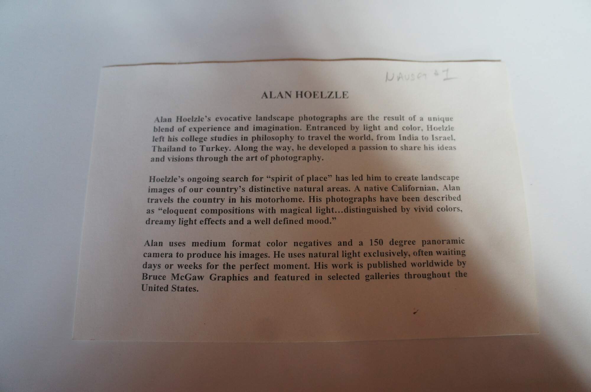 Hoelzle uses medium format color negative and a specially designed rotating panoramic camera to produce his images. He uses natural light exclusively, avoiding lab manipulation or enhancement. Each photograph is individually printed to custom specifications and signed by the artist.