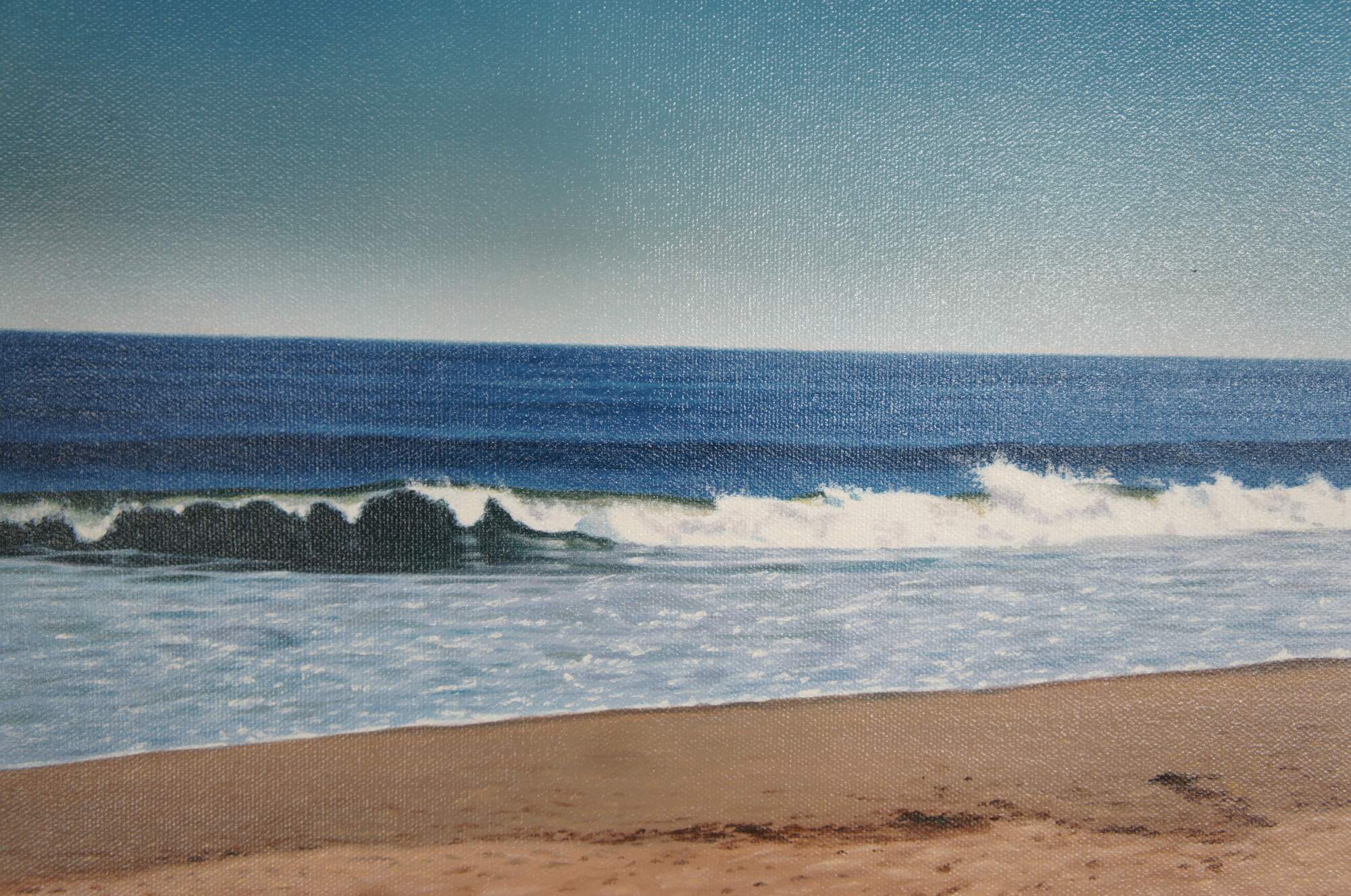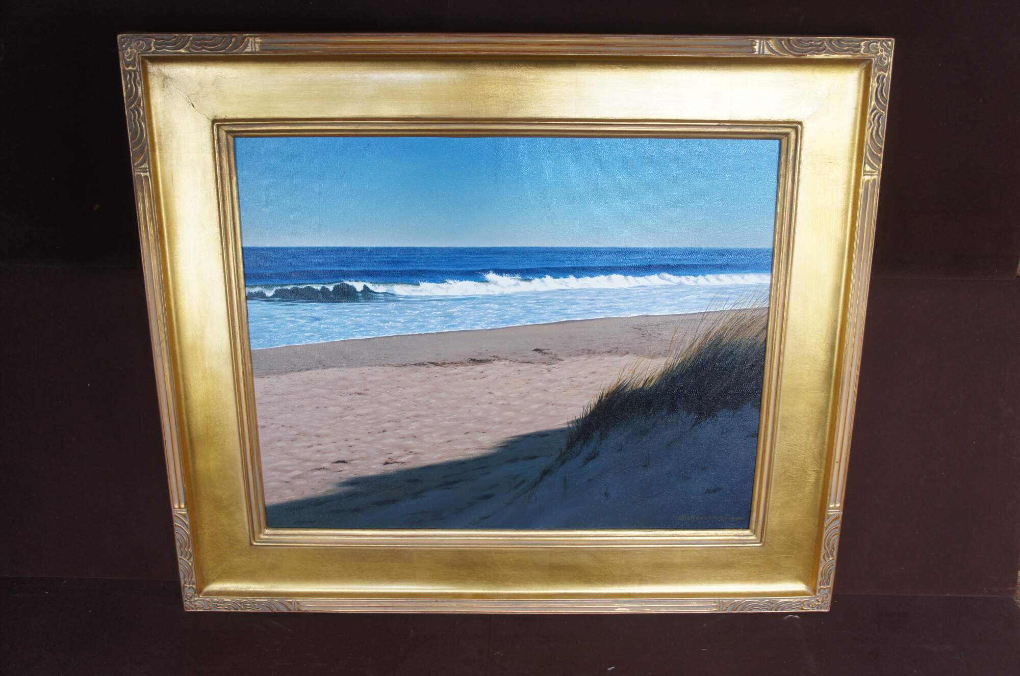 Vintage Michael McGovern ""Shorebreak"" seascape oil painting on canvas featuring Nantuckets Shorebreak beach, dunes and crashing waves. Circa 2000.