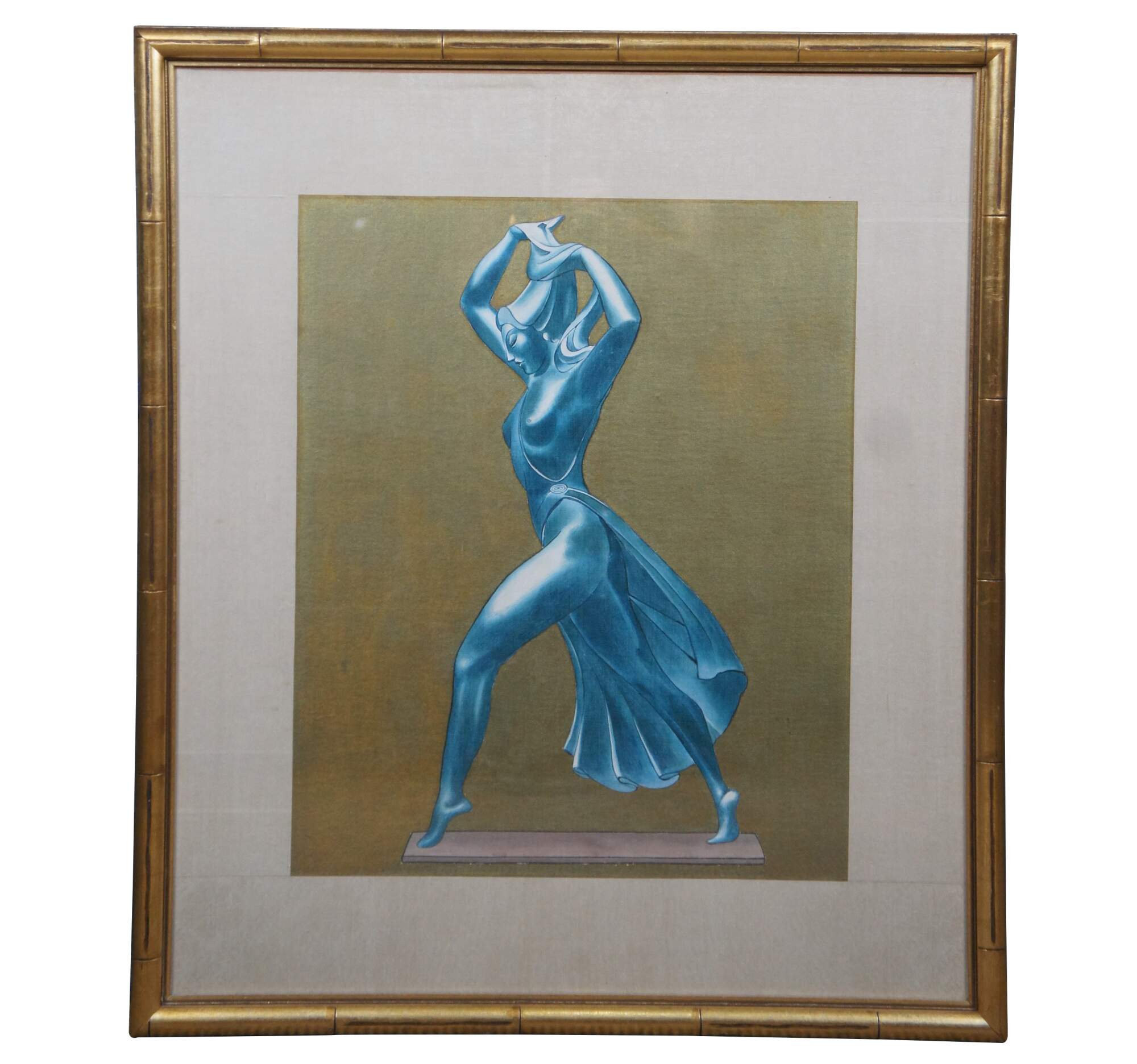 A rare and impressive pair of Original Chinese Art Deco Paintings, circa mid 20th century. 'Forever Young' by Chi Change Hou, Peking China. Features a sculptural young man and woman posing in blue on a plinth over gold background. The artwork is framed in gold under glass.