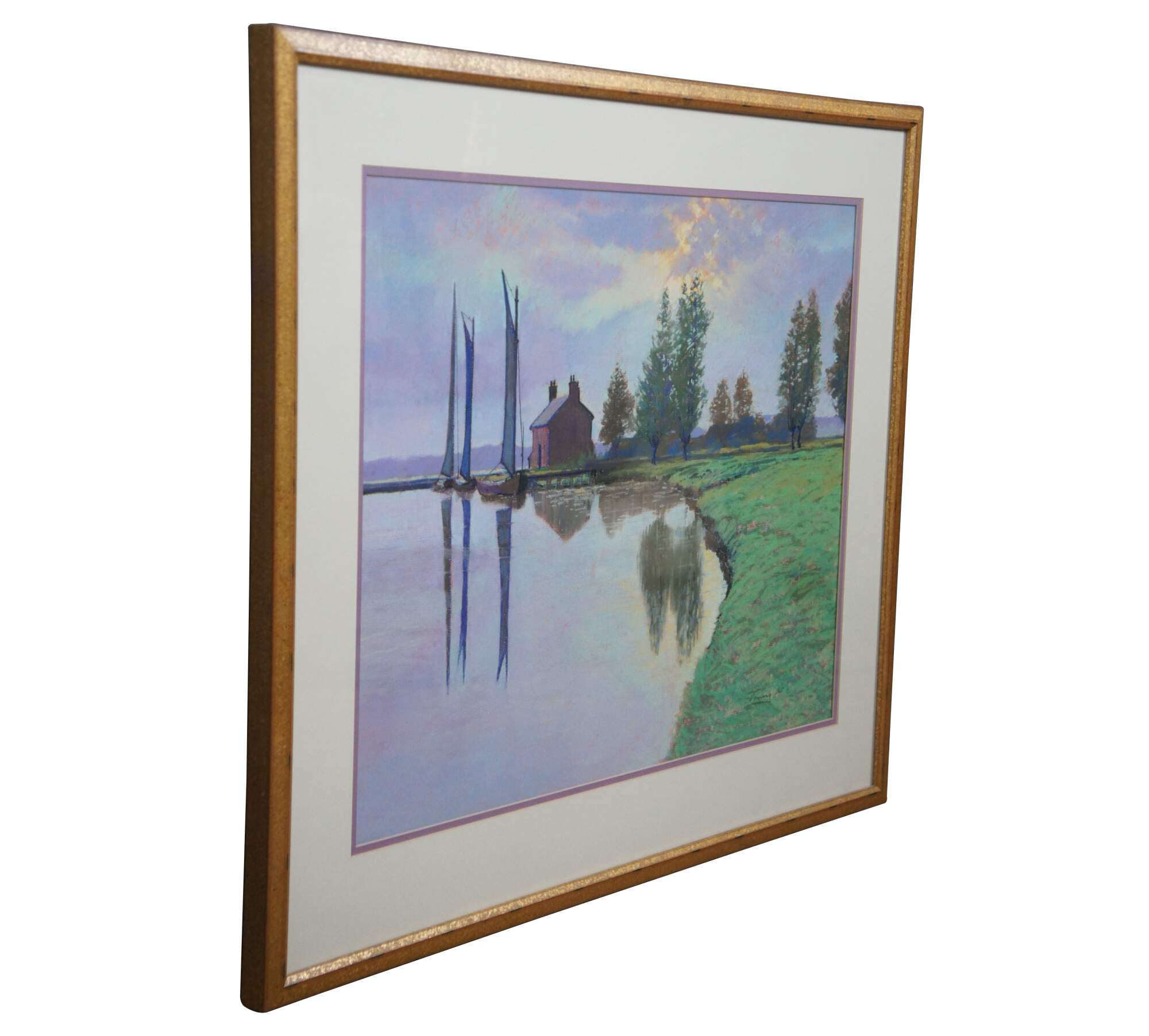 An eye catching late 20th century watercolor painting, signed Fleming lower right. Features a countryside setting with sailboats near a farmhouse. Three sailboats are docked on a calm body of water next to a lush green field. The sun overhead appears to be setting casting a beautiful shadow against the water. Circa 1995.