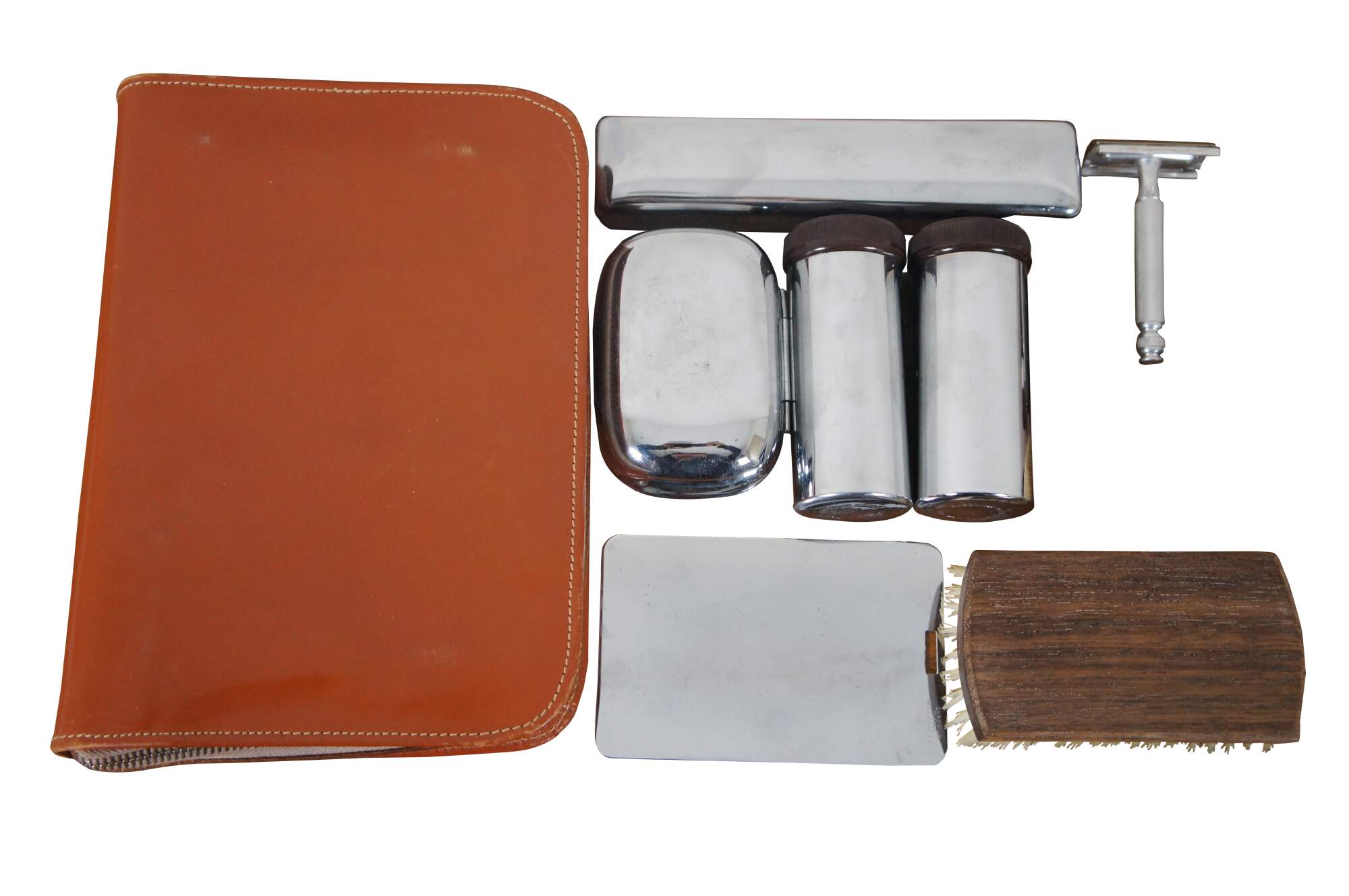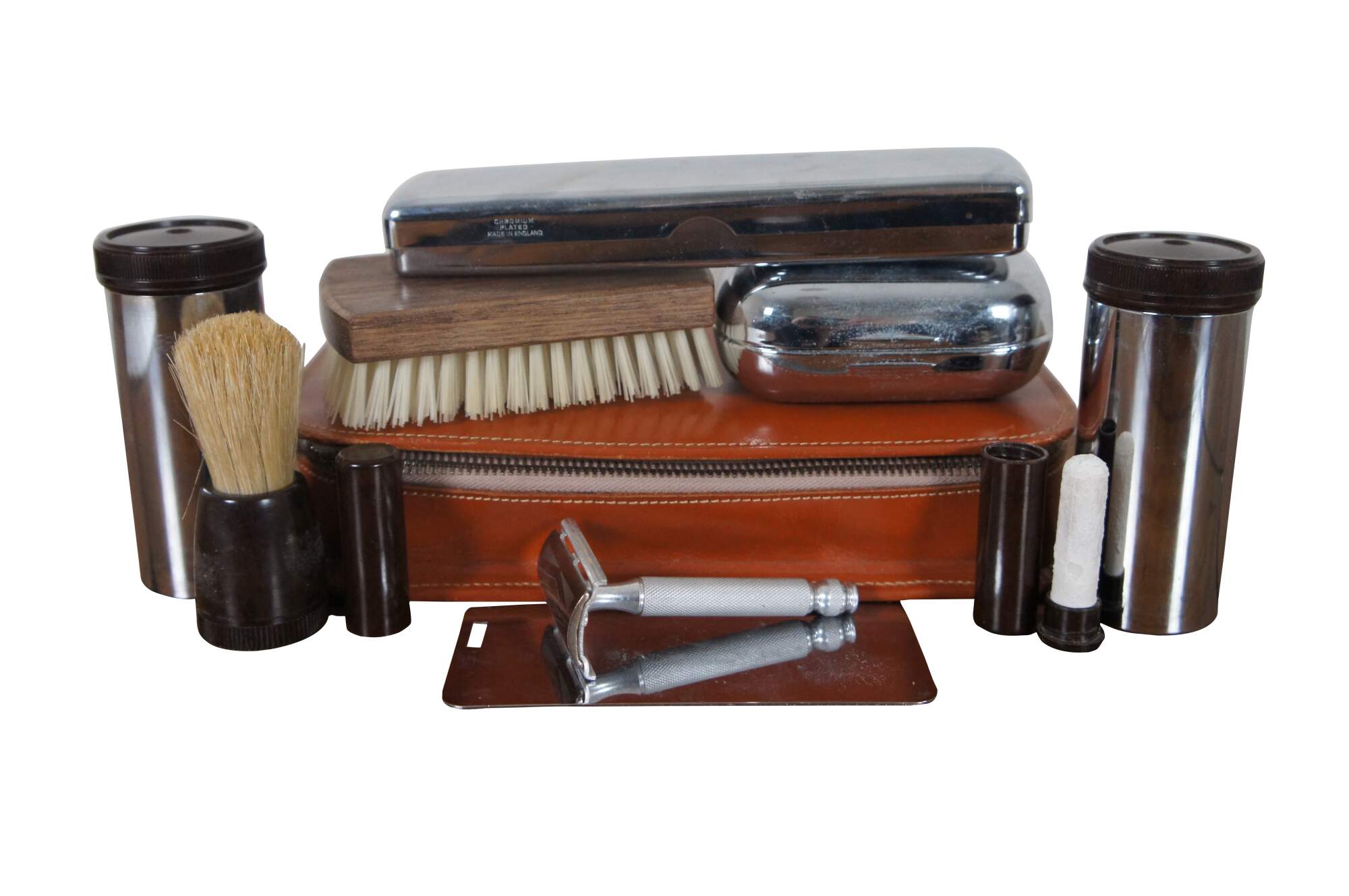Mid 20th century men’s travel kit, Made in England of peanut butter brown leather with zippered sides. Contains chromium plated hand mirror, toothbrush holder, soap box, and two storage canisters with brown plastic lids - one of which contains a natural bristle shaving brush, two brown plastic tubes – one empty/missing top and one containing a styptic stick, one wooden handled palm sized brush with nylon bristles, and Gillette brand safety razor.
