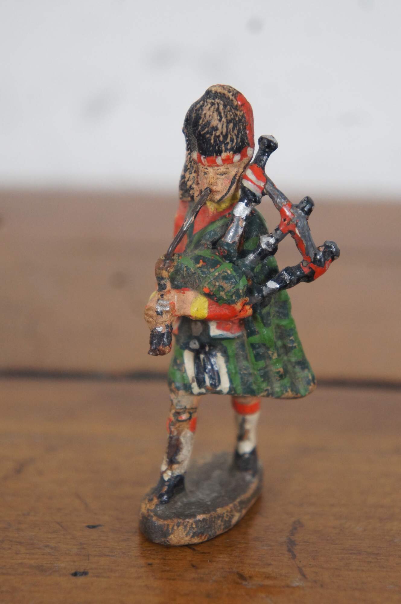 Set of seven vintage circa 1960’s Elastolin toy soldiers dressed as Scottish Highlanders in Blackwatch kilts and red coats.