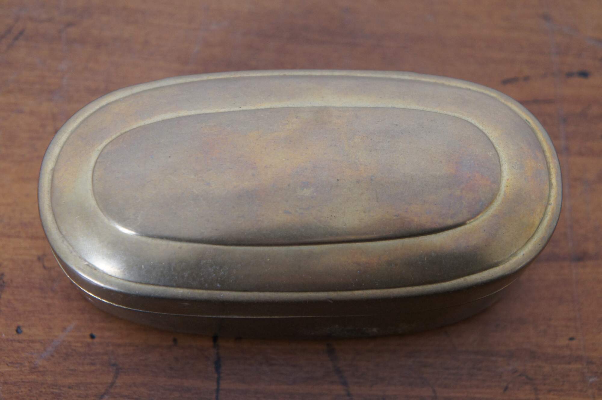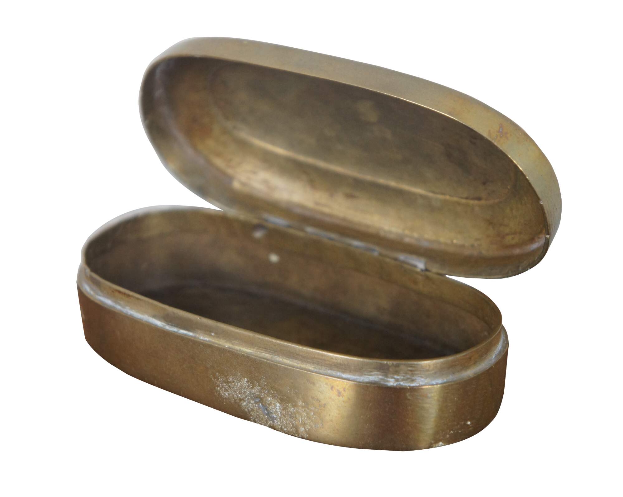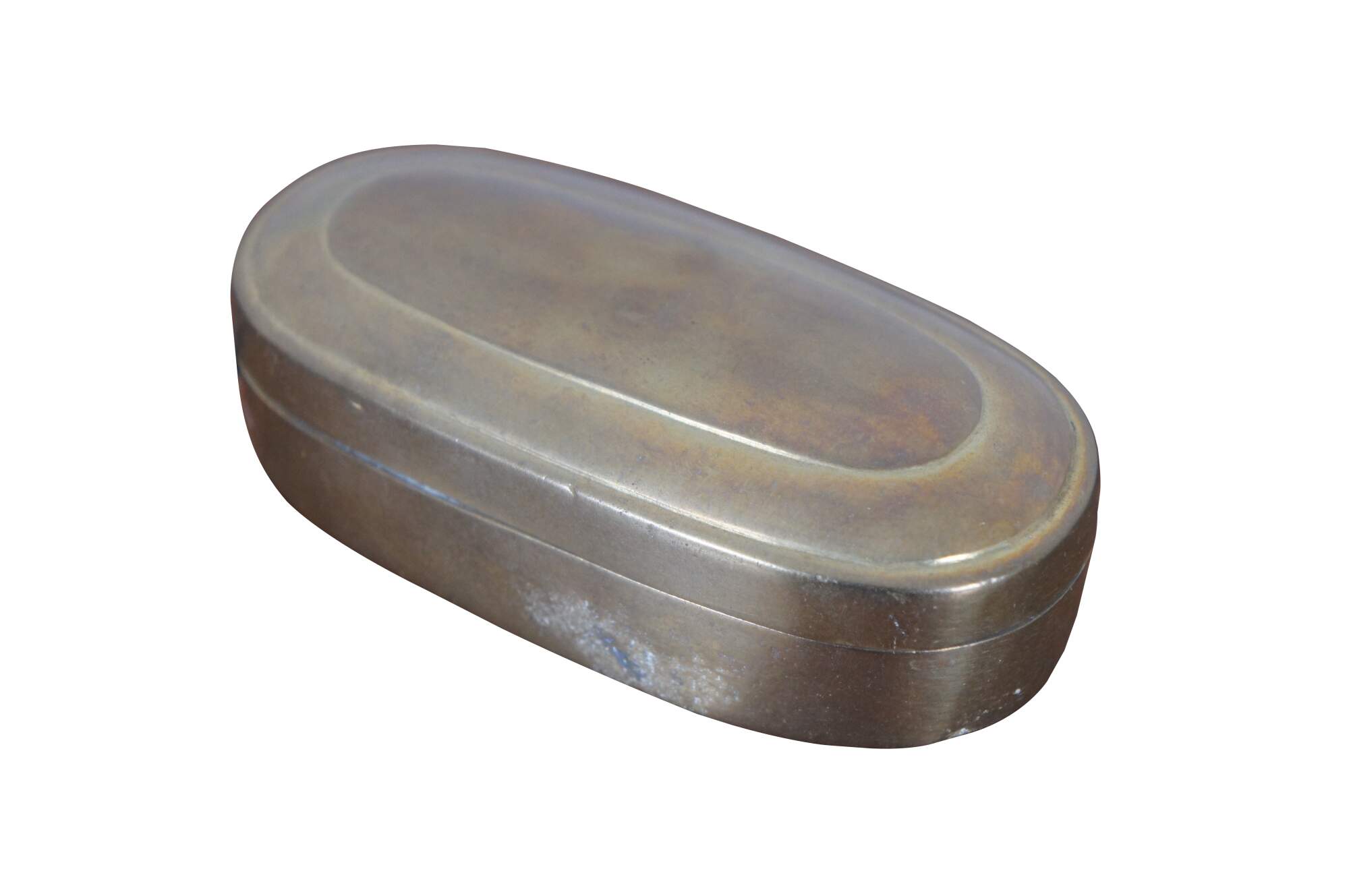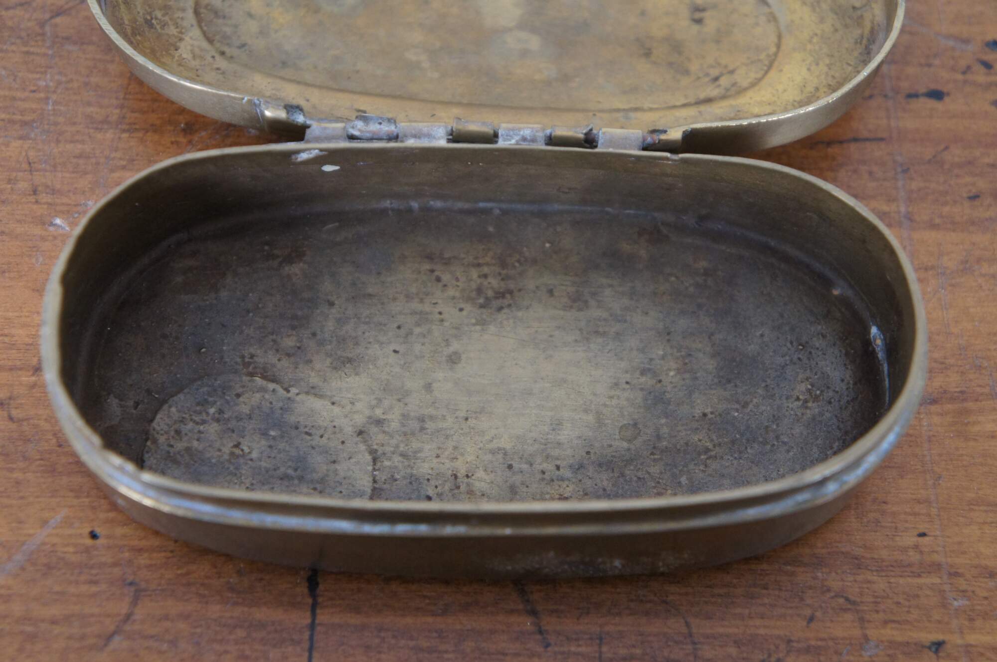 Antique 19th century oval brass snuff / tobacco box. From the home of Justina Bradford Haud, grandmother of Warren Dietz Gibson.