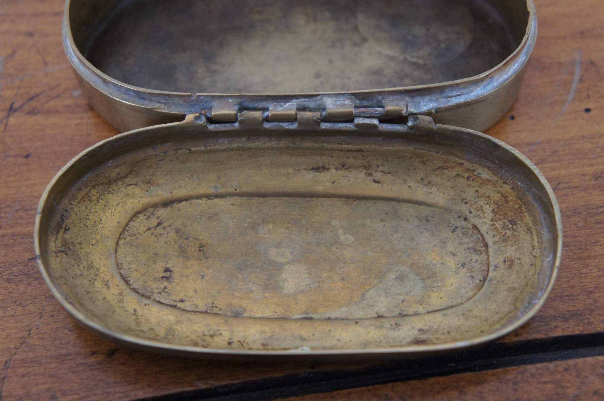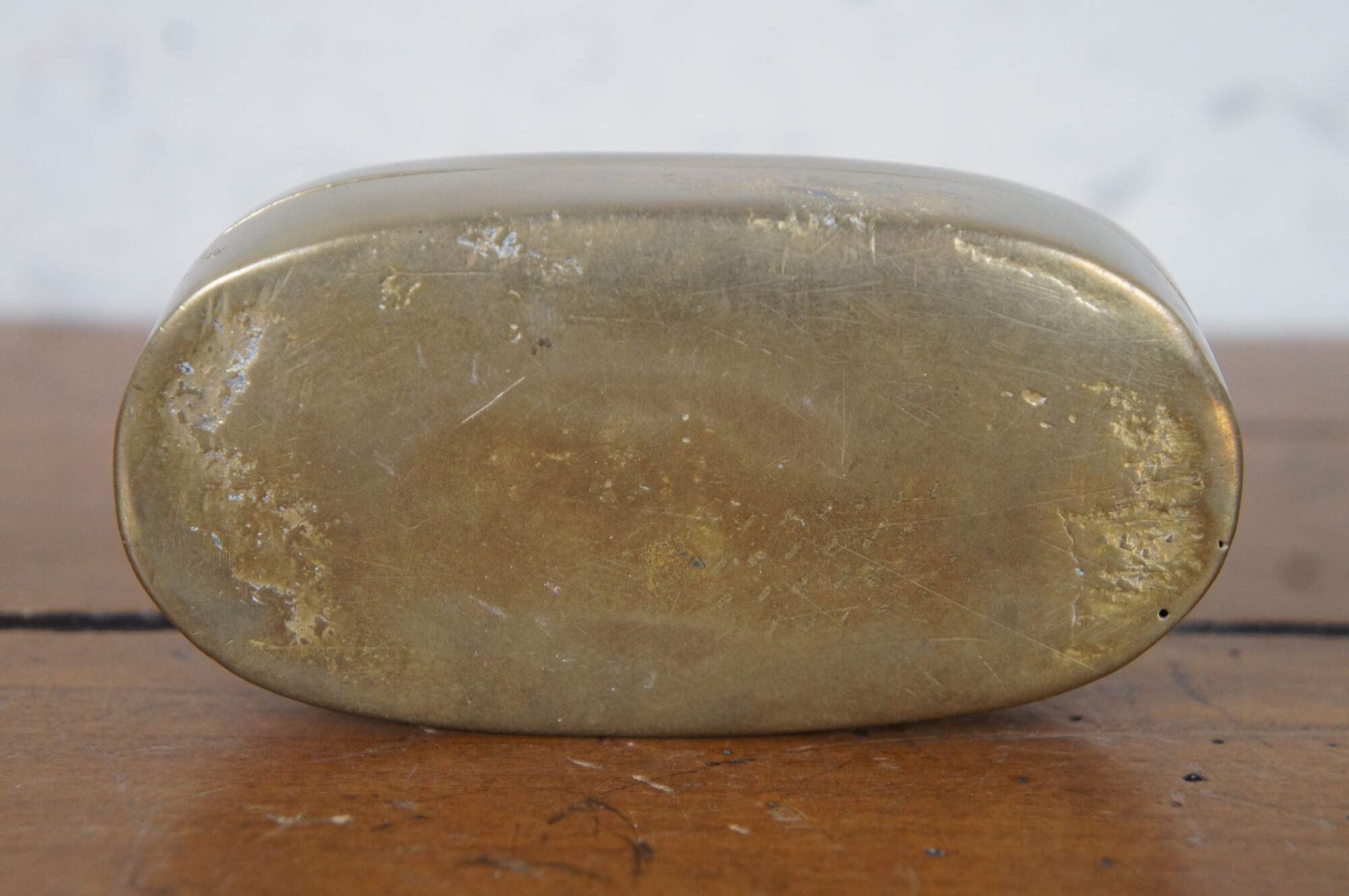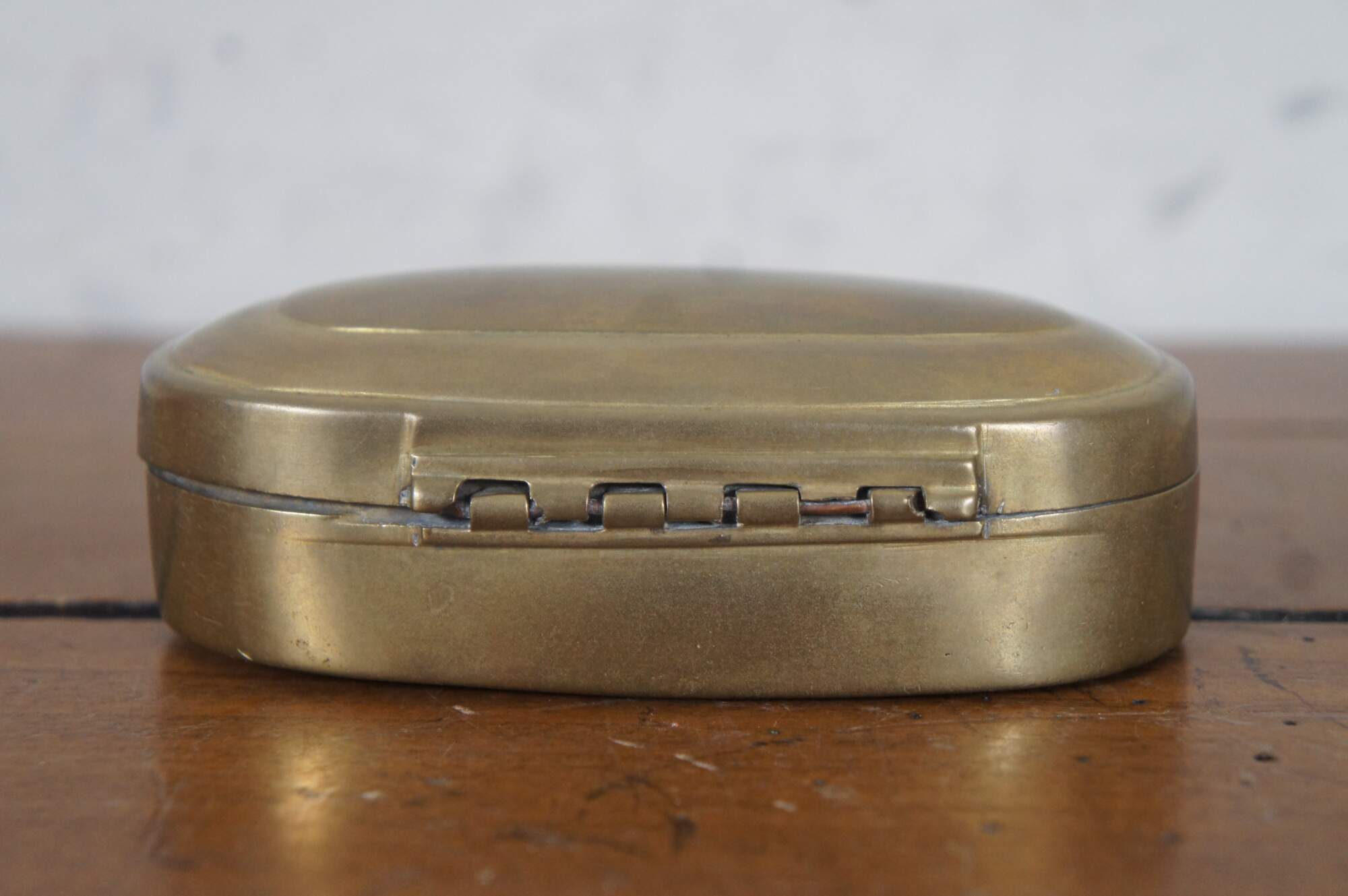 Antique 19th century oval brass snuff / tobacco box. From the home of Justina Bradford Haud, grandmother of Warren Dietz Gibson.