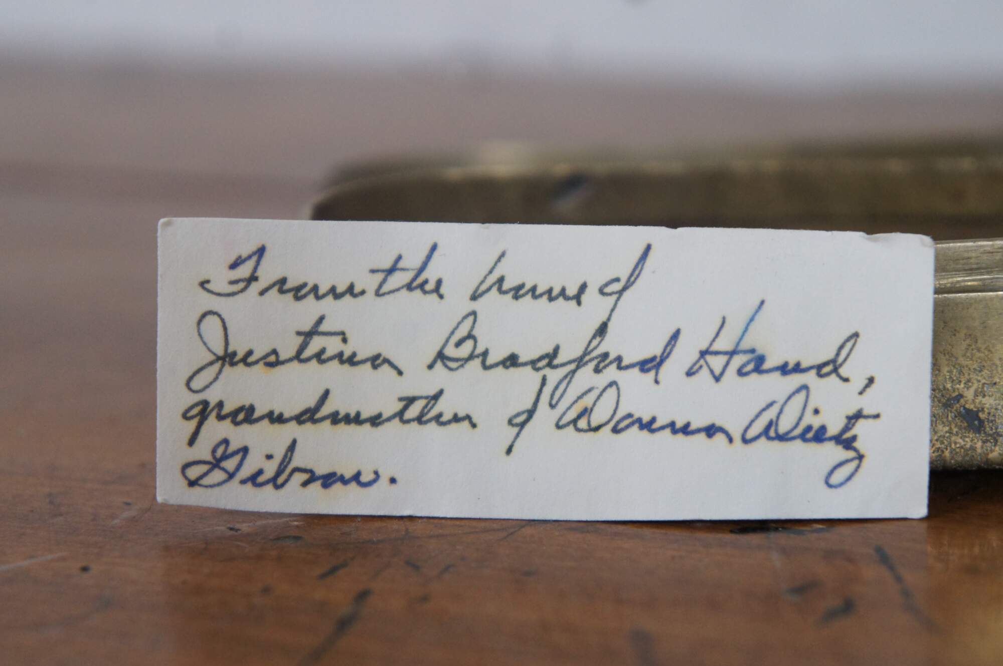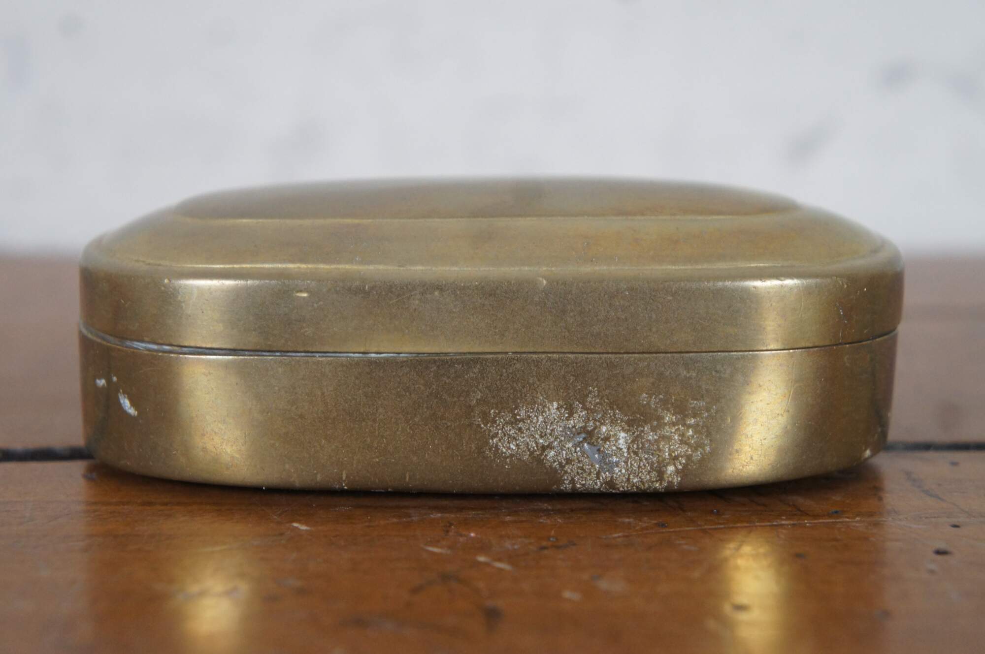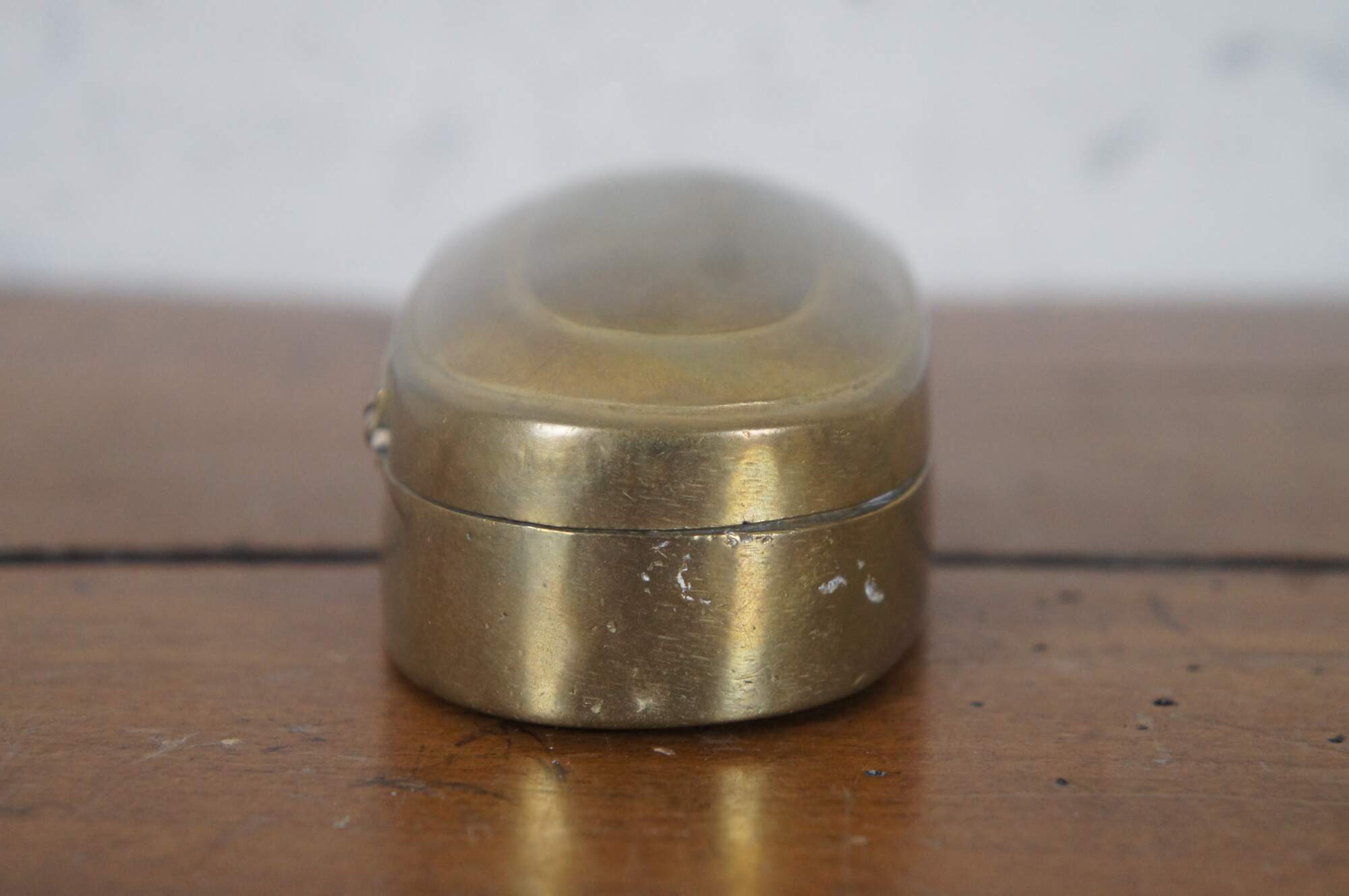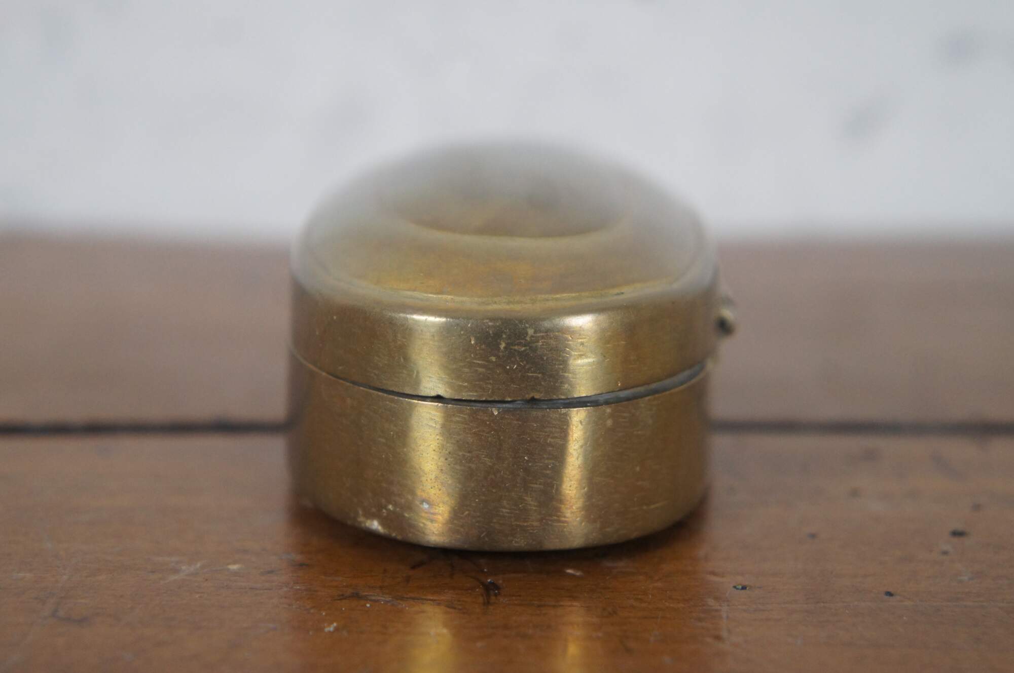 Antique 19th century oval brass snuff / tobacco box. From the home of Justina Bradford Haud, grandmother of Warren Dietz Gibson.