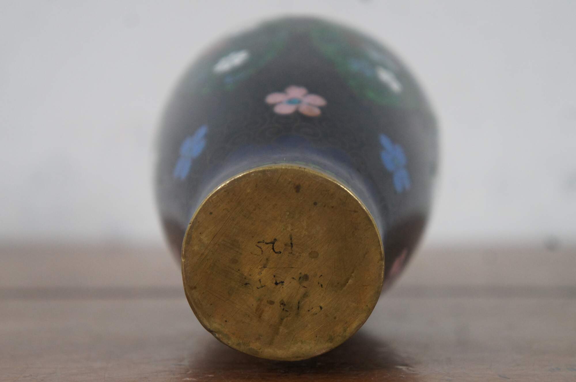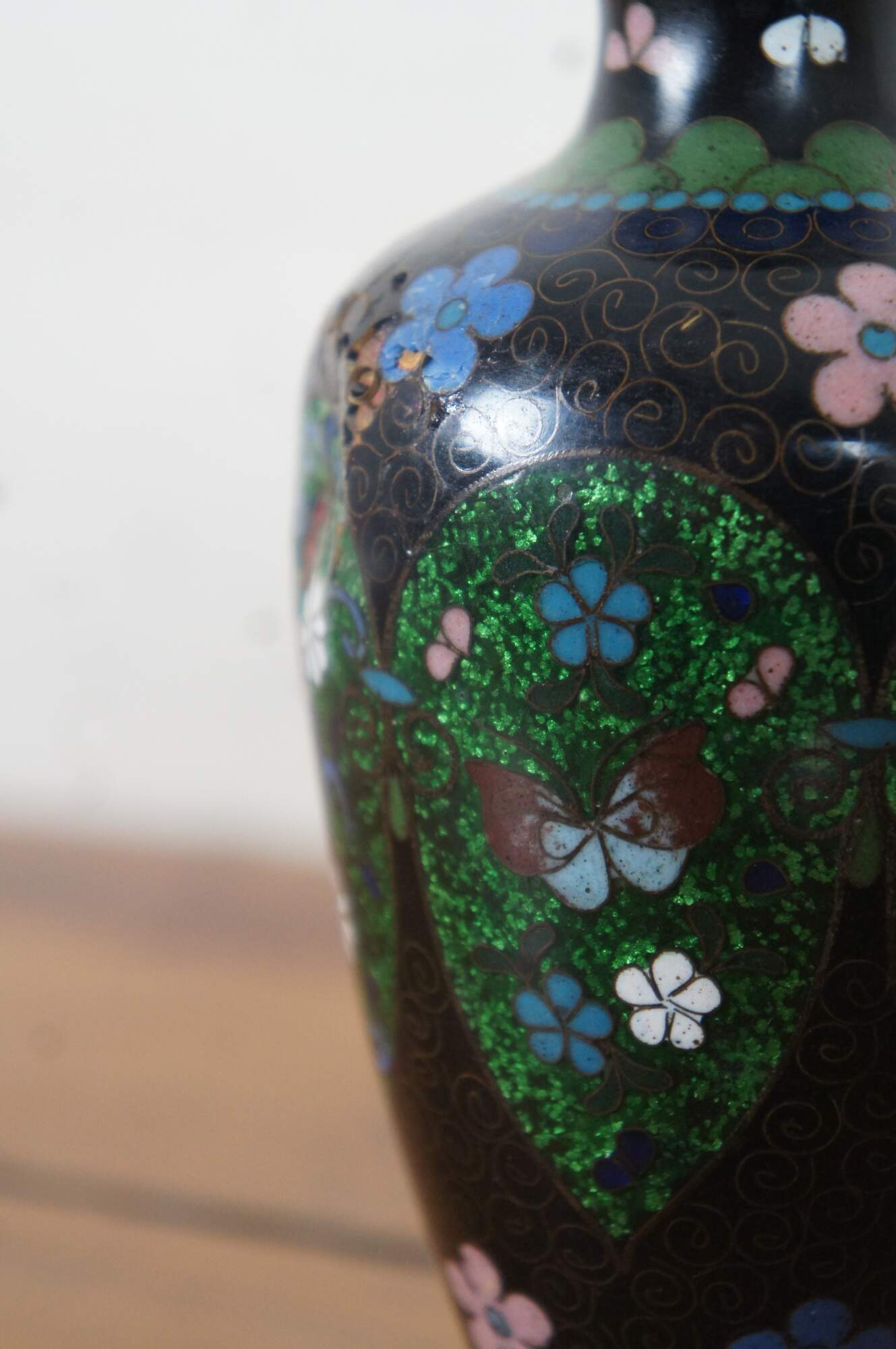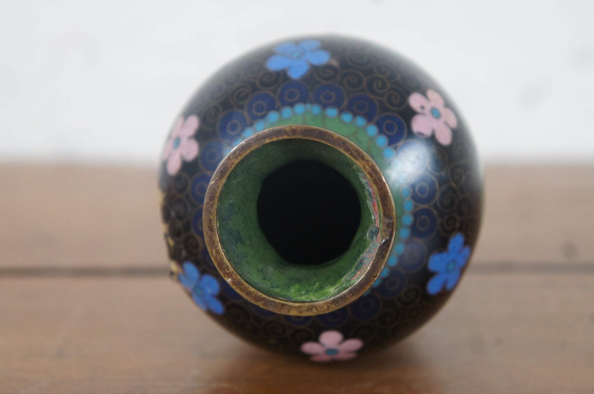 Antique Meiji era Japanese cloisonne bud vase in black with prominent pink, blue, and white flowers in and around tear drop shaped sections of green ginbari.