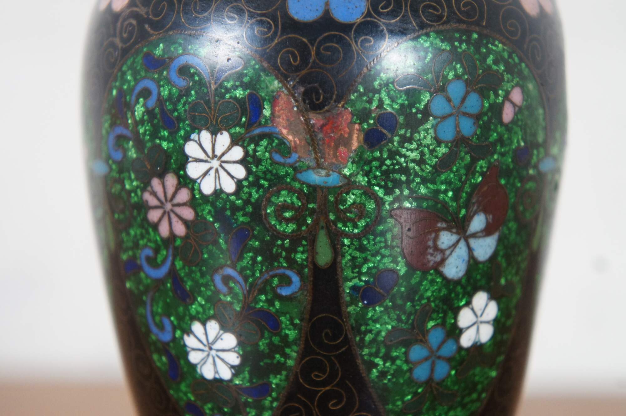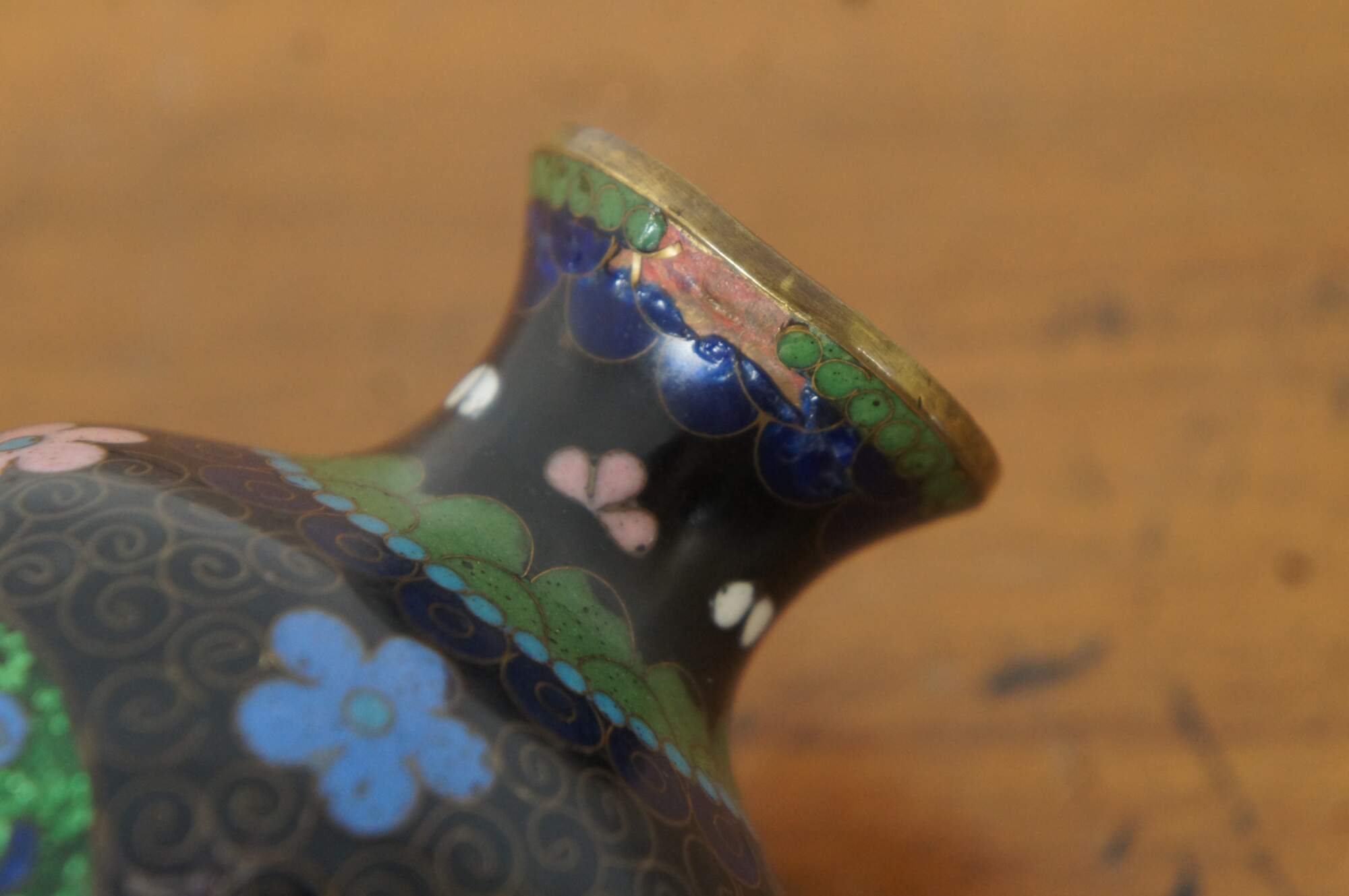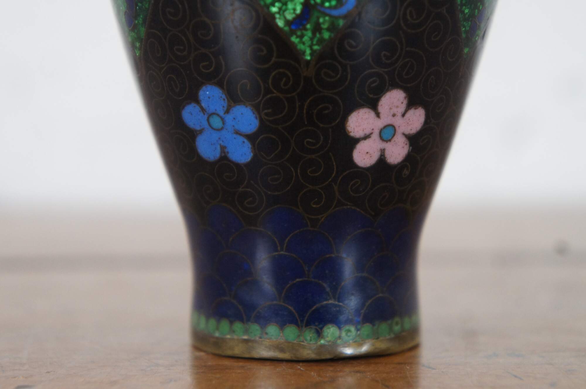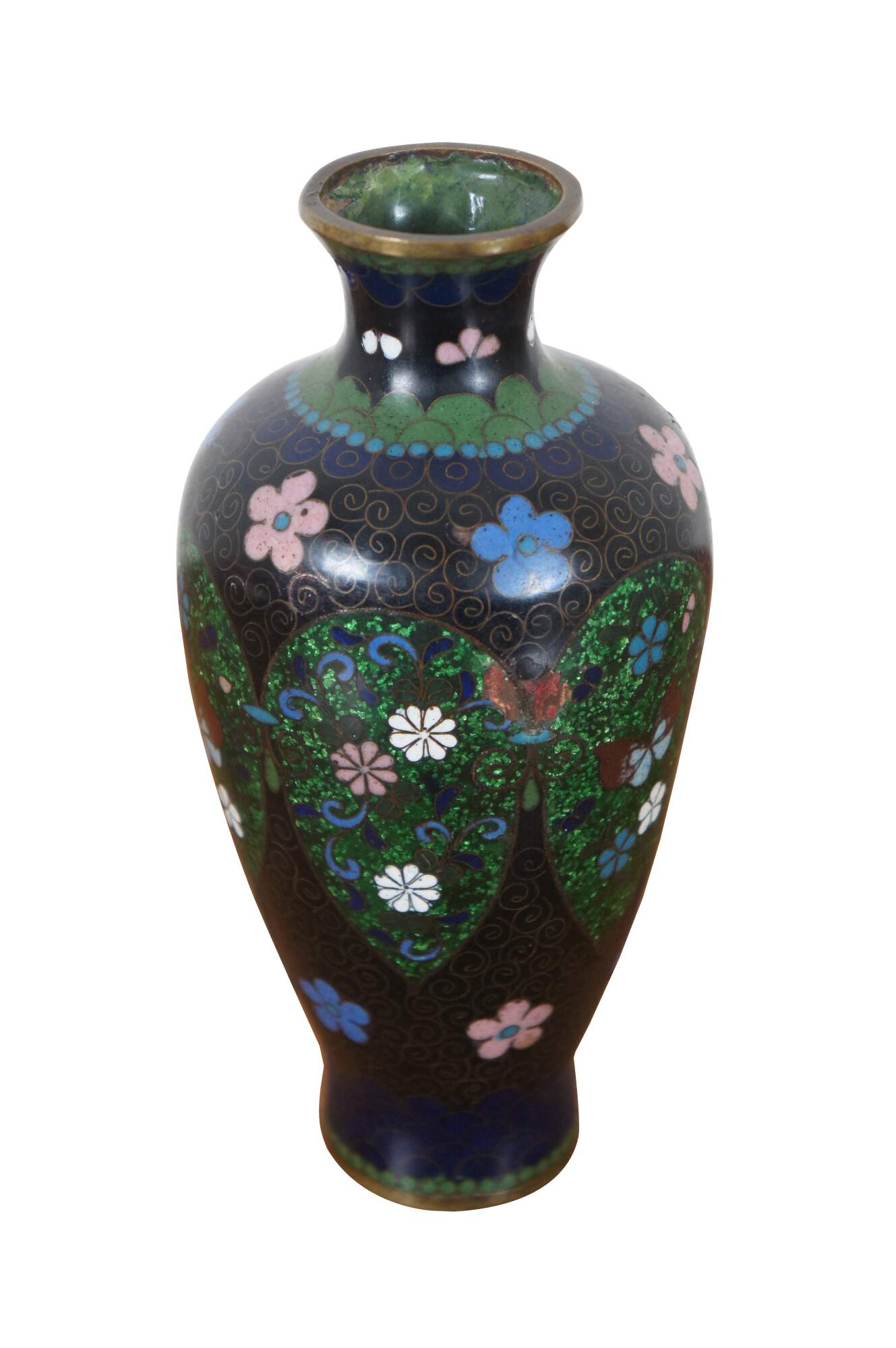 Antique Meiji era Japanese cloisonne bud vase in black with prominent pink, blue, and white flowers in and around tear drop shaped sections of green ginbari.