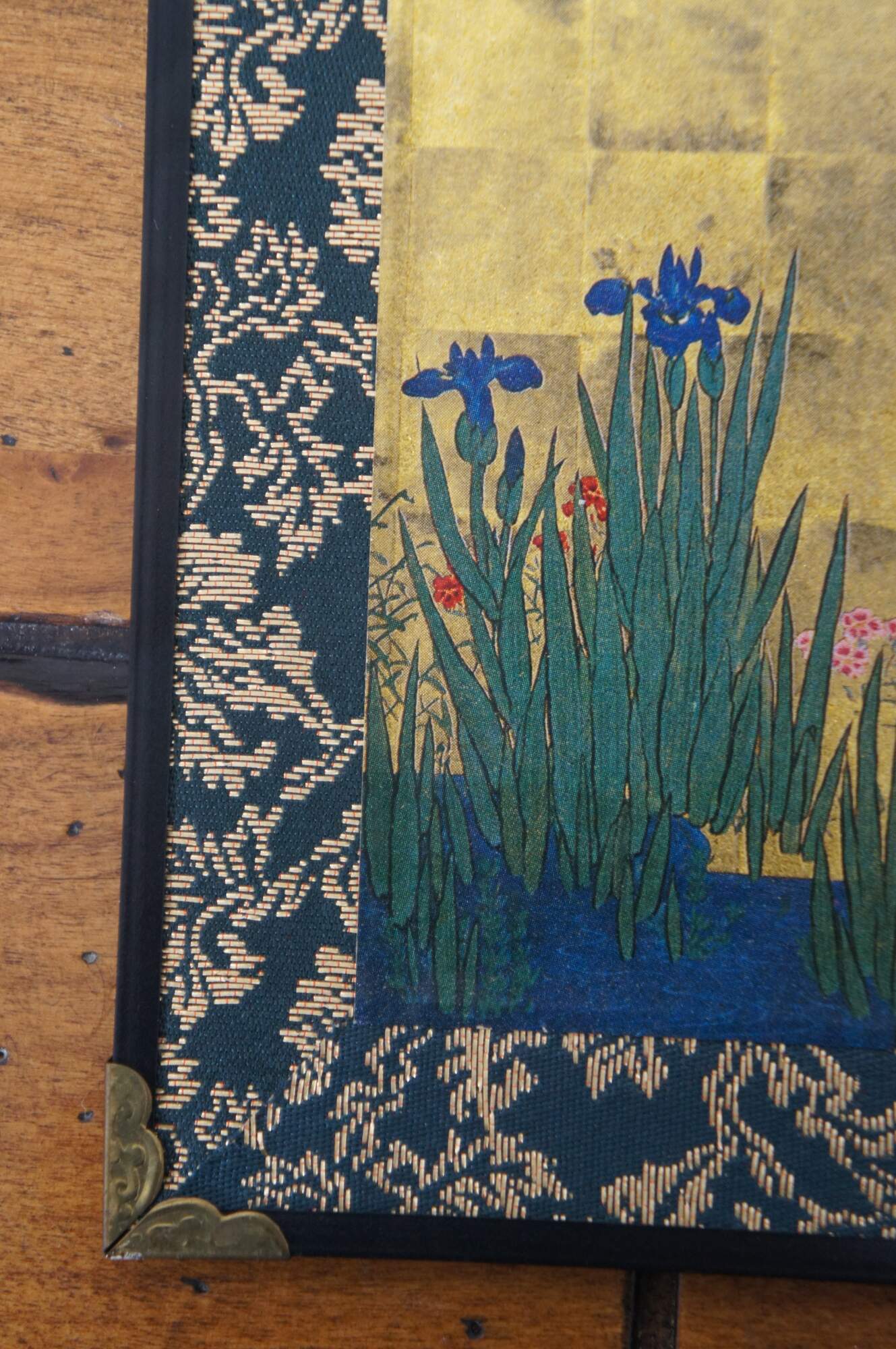 Vintage tabletop four panel Japanese privacy screen featuring cranes and a gnarled pine tree with a metallic gold background, surrounded by a fabric border and brass corners.