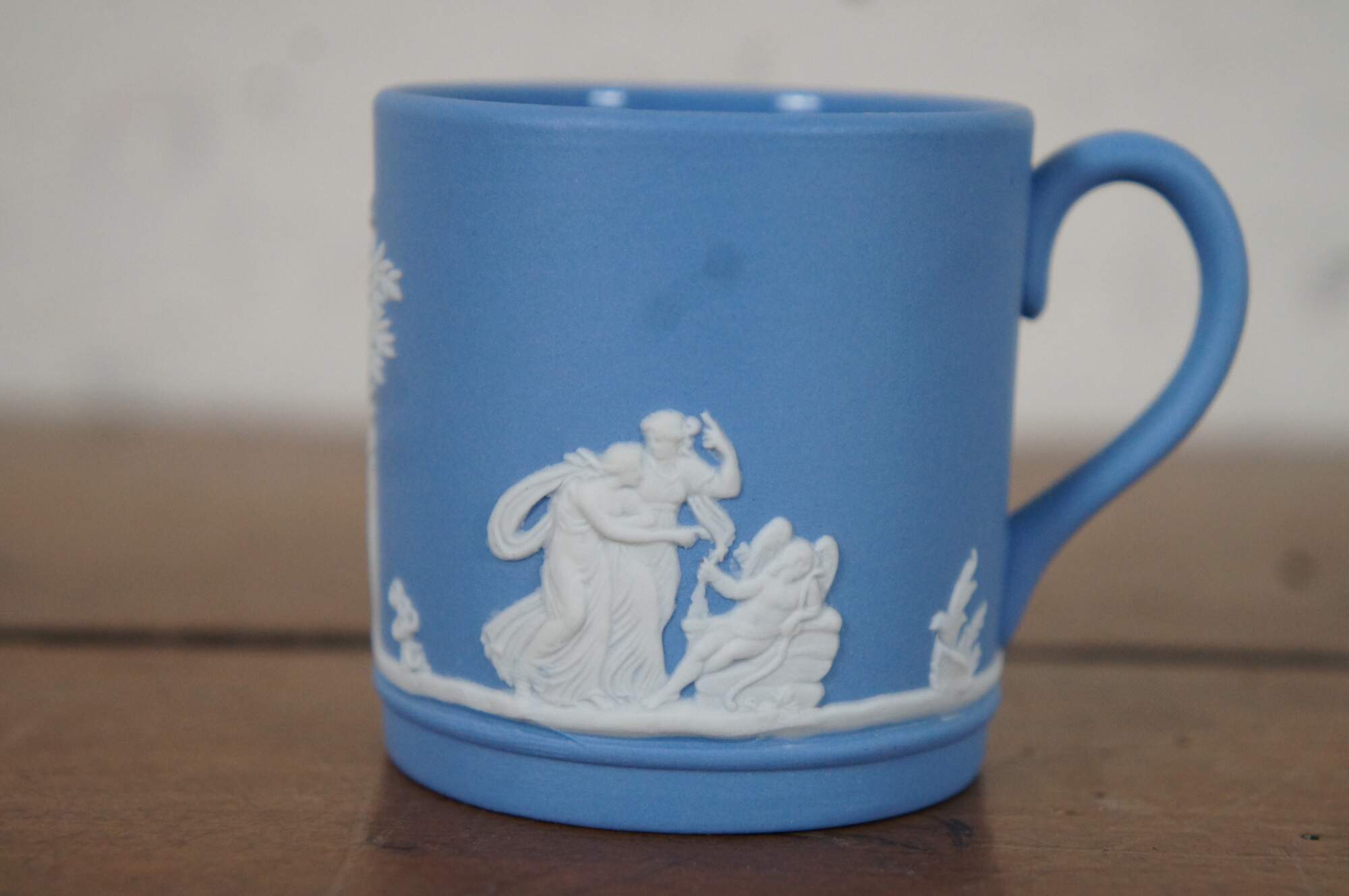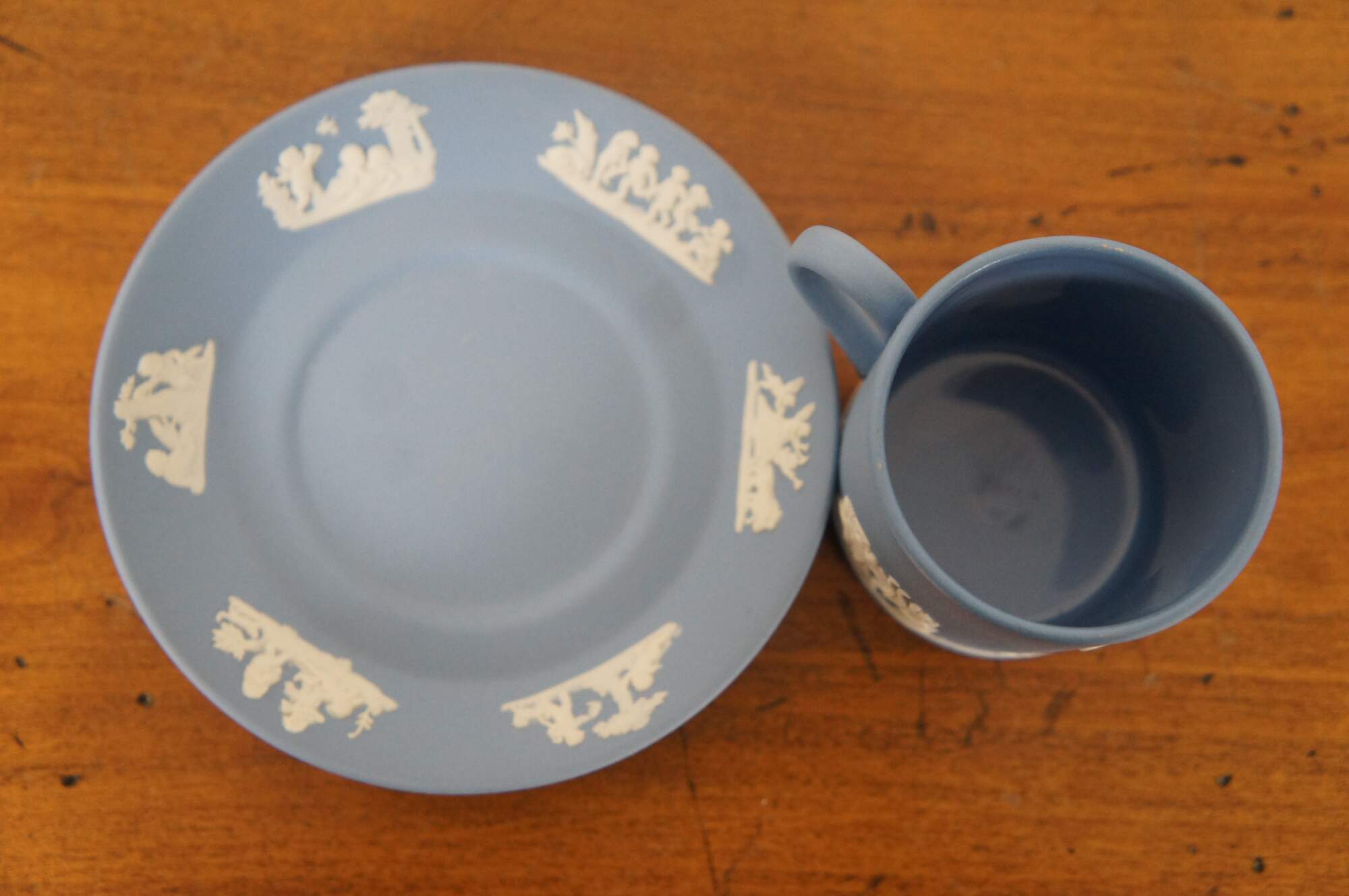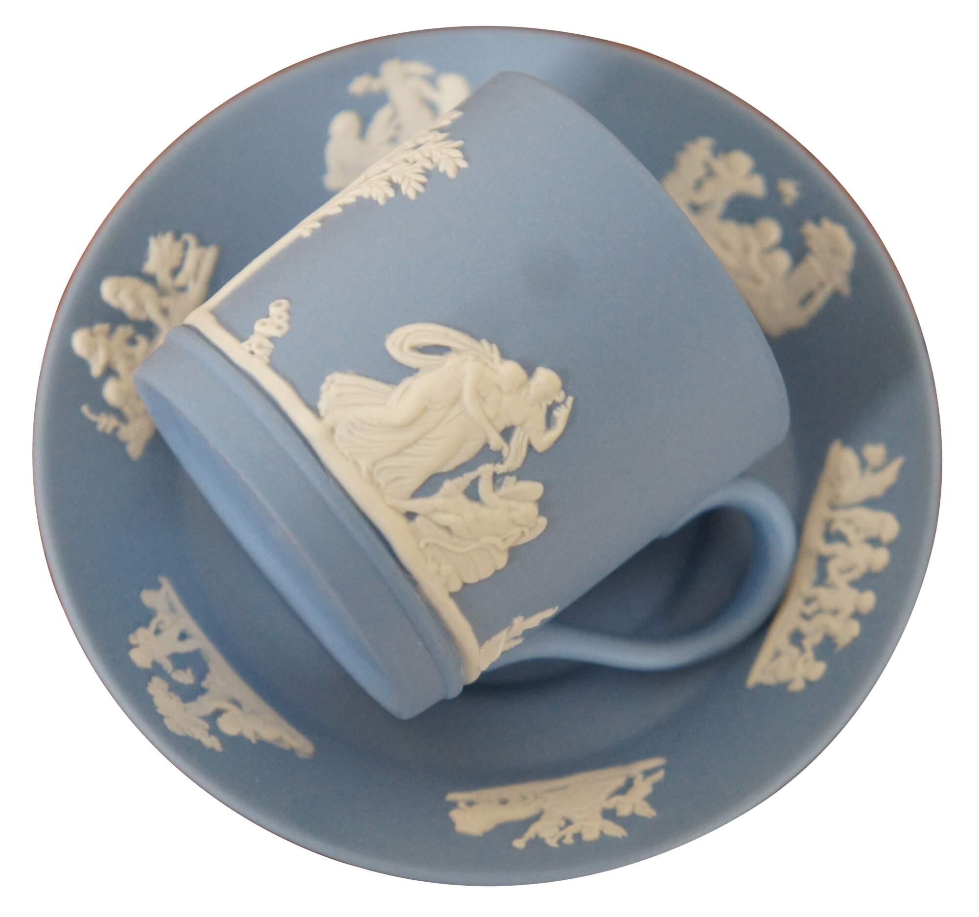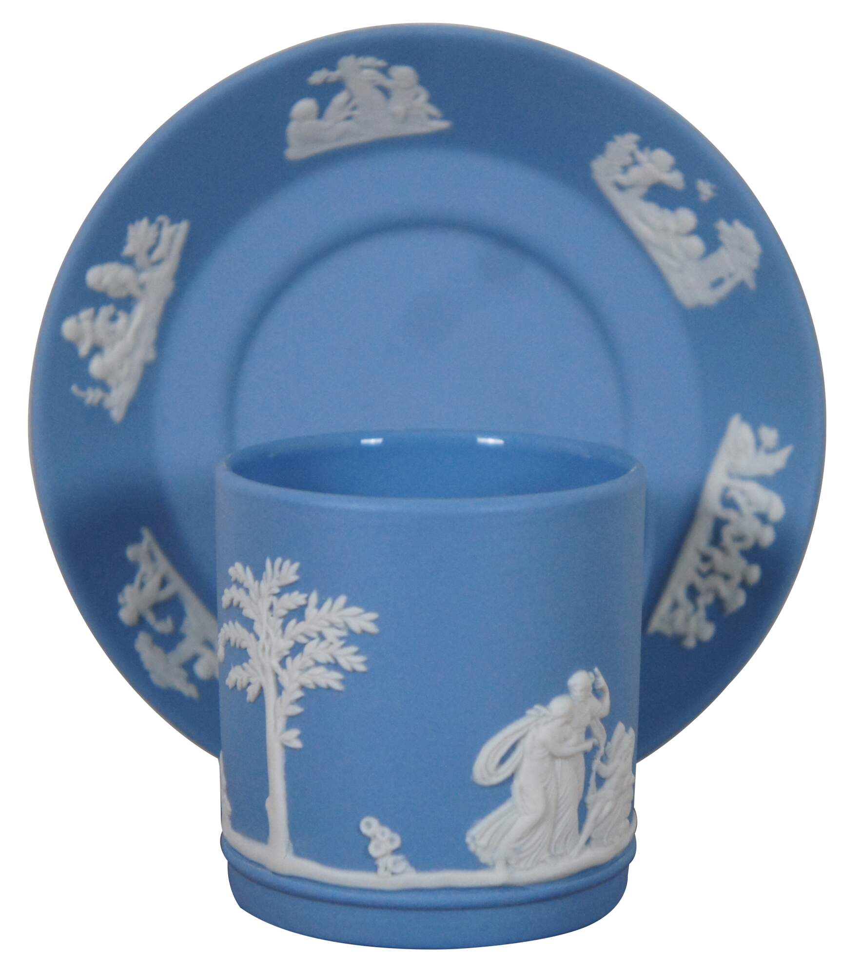 Vintage Wedgwood 1955 blue jasperware demitasse coffee cup and saucer with traditional applied cream neoclassical figures.