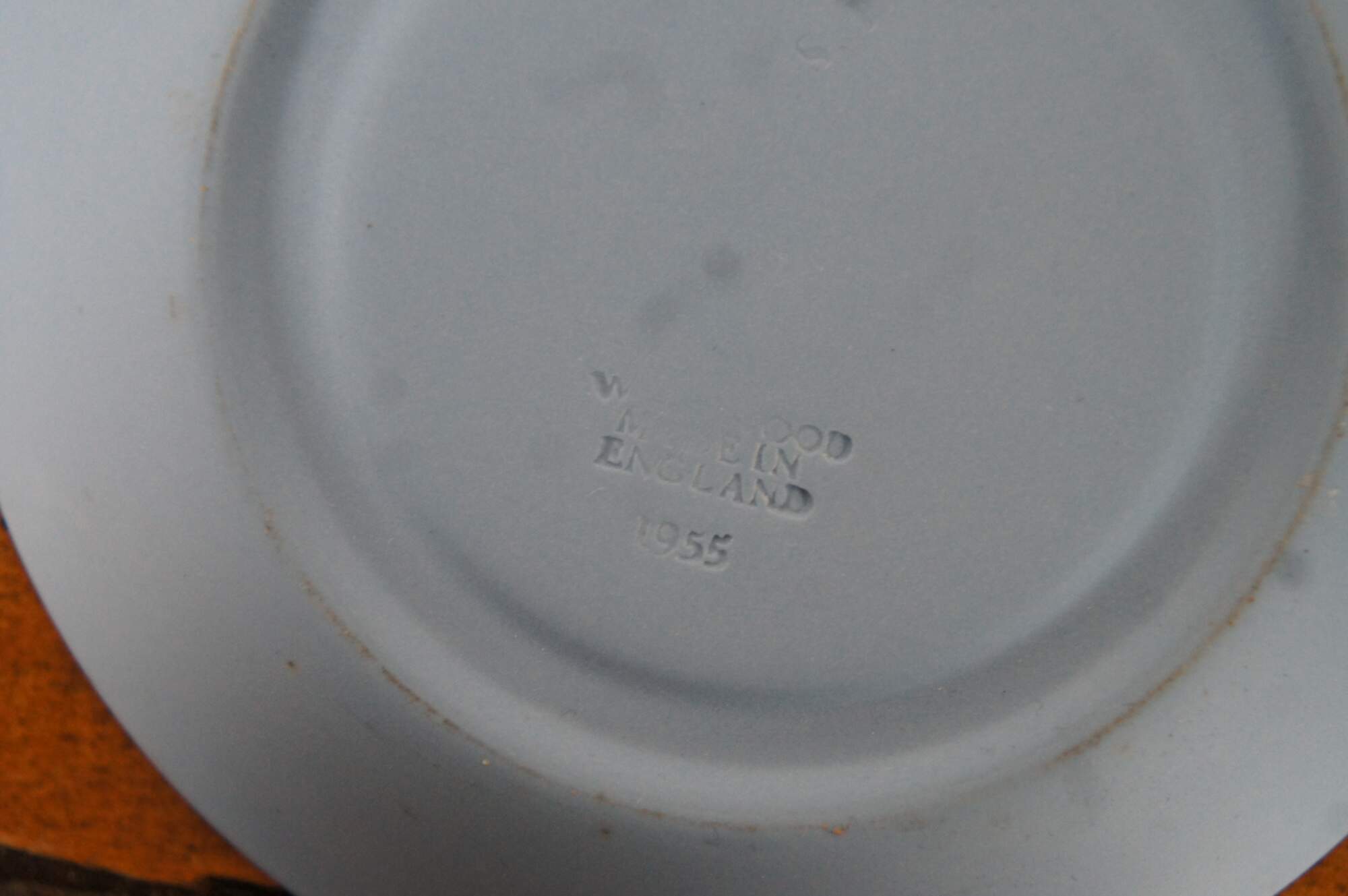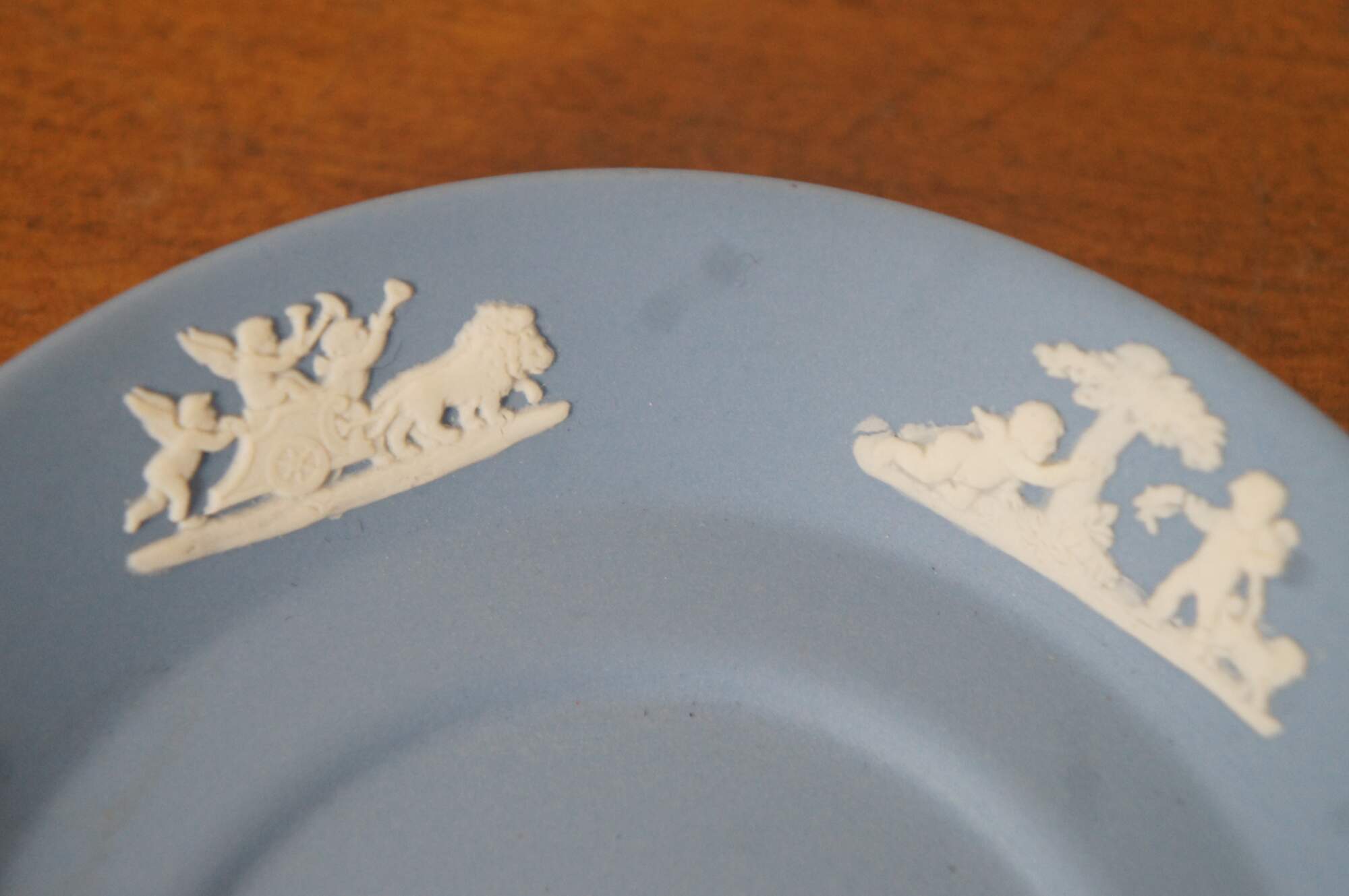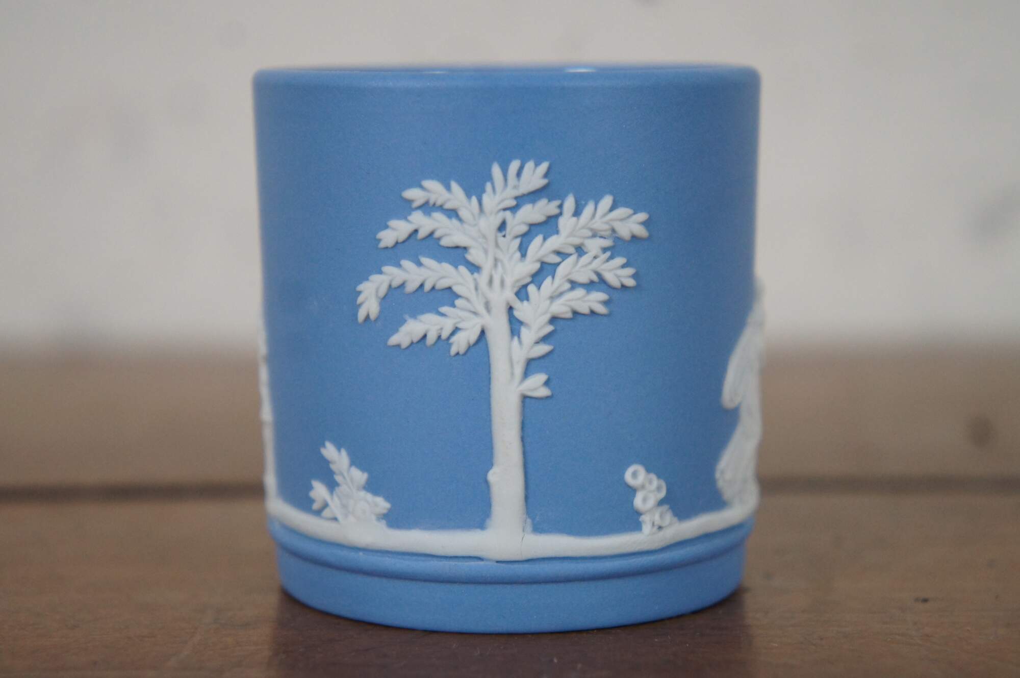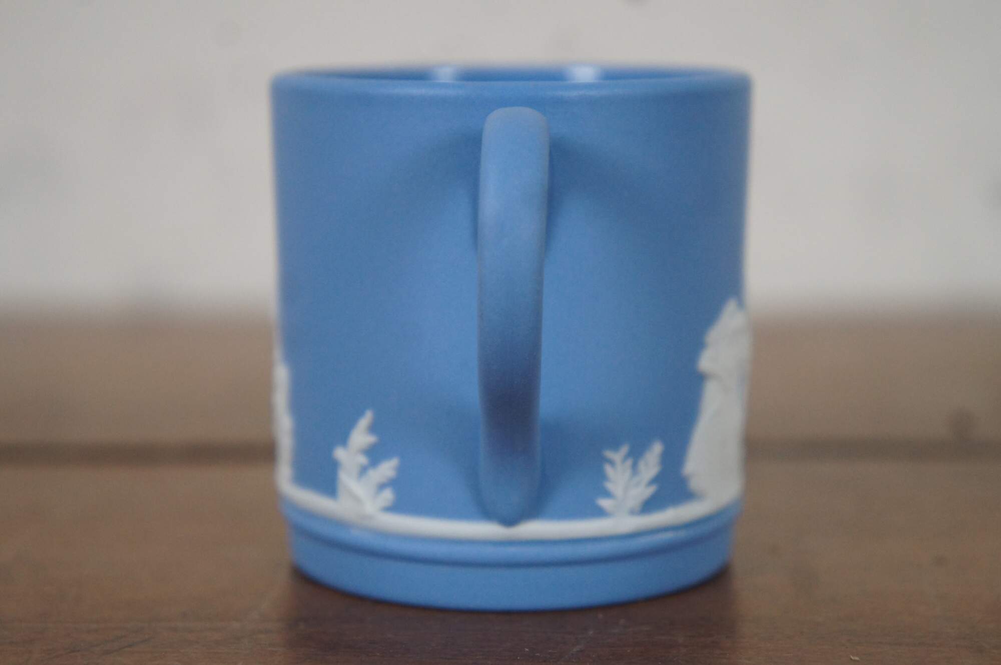 Vintage Wedgwood 1955 blue jasperware demitasse coffee cup and saucer with traditional applied cream neoclassical figures.