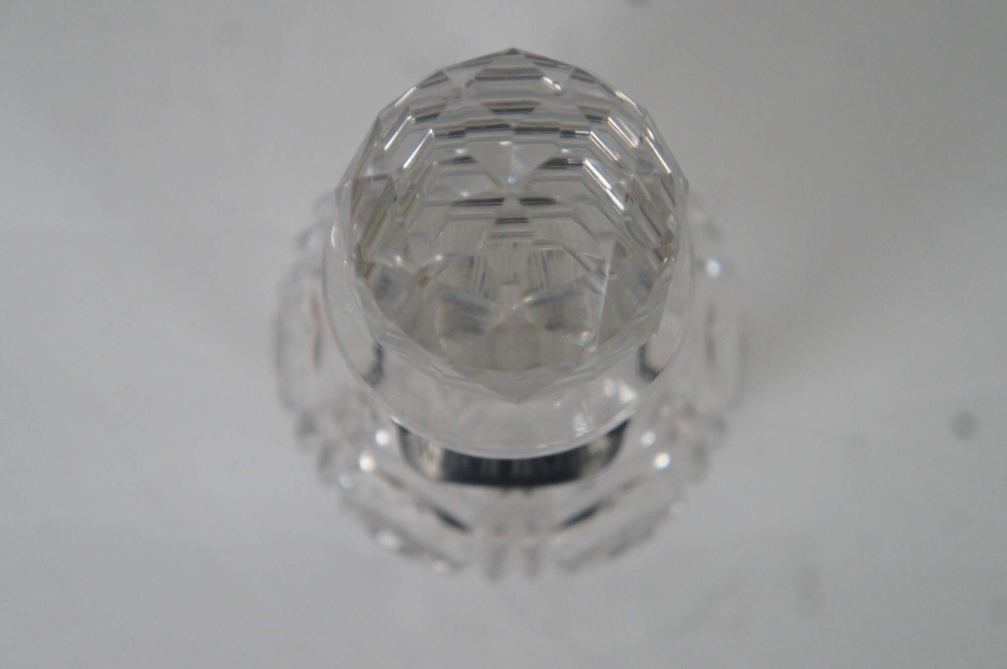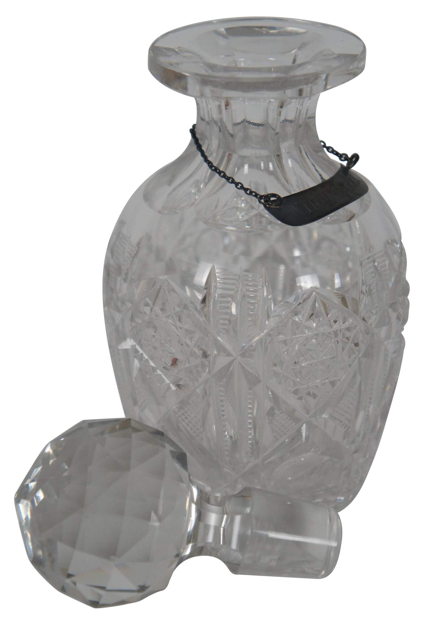Antique cut glass vanity bottle and stopper with metal label marking the bottle for witch hazel, a popular astringent.