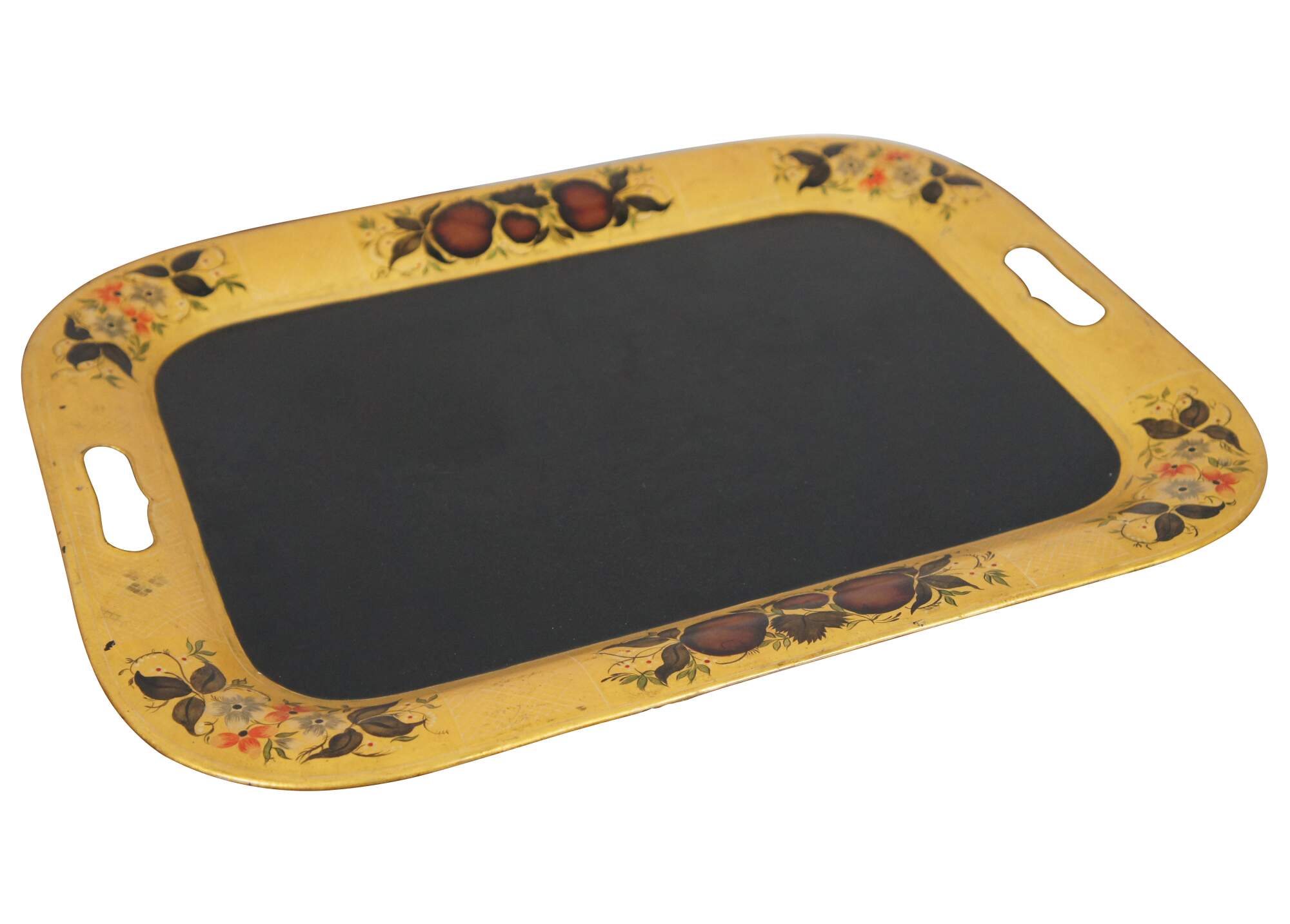 Primitive early 20th century black and yellow toleware tray. Features a handled pattern with stencilled fruit and flower motif.