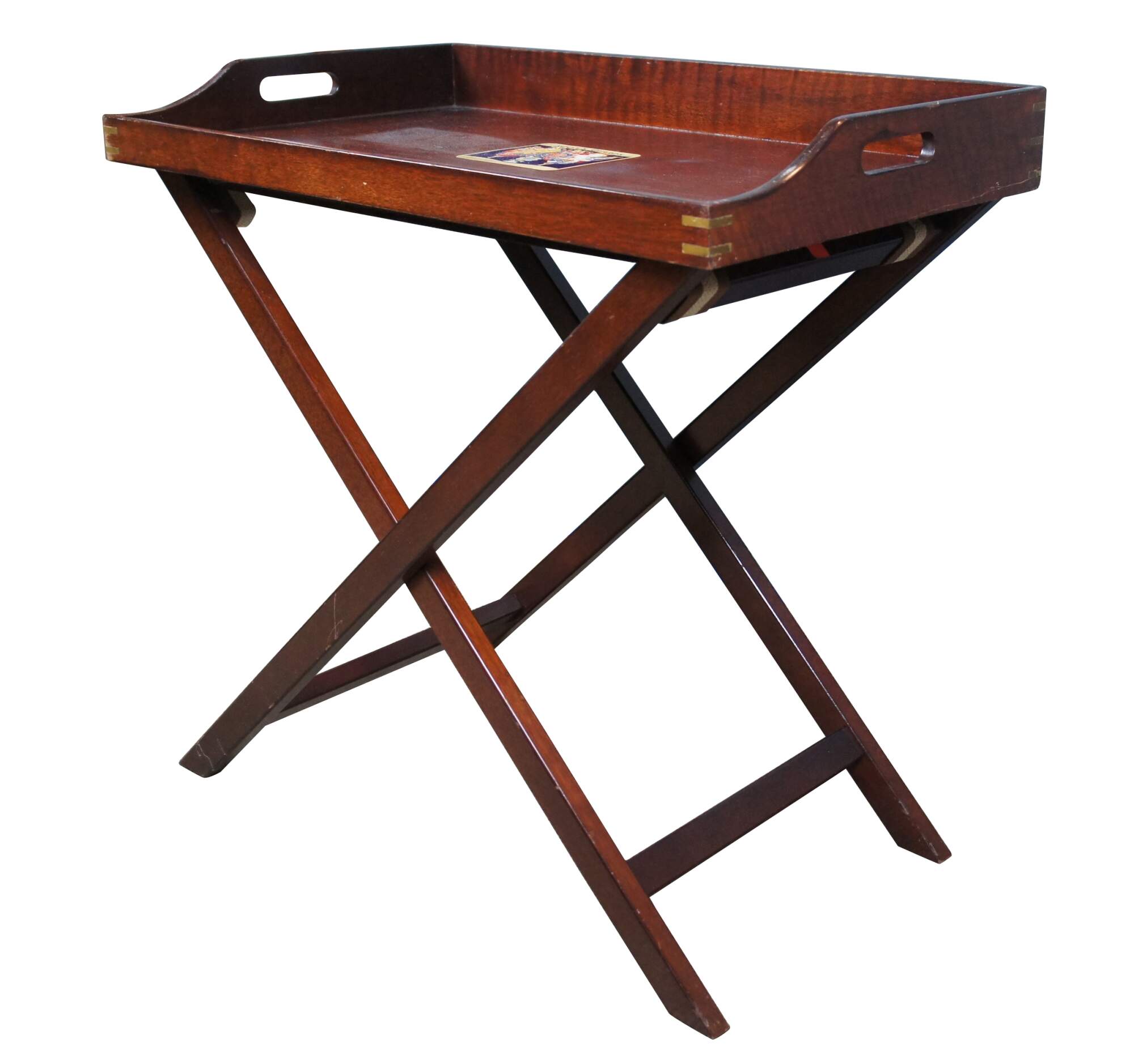 Vintage Scots Guard folding tray table. Made of mahogany featuring inlaid brass dovetail joinery with a central heraldic plaque or crest for the United Kingdom.
