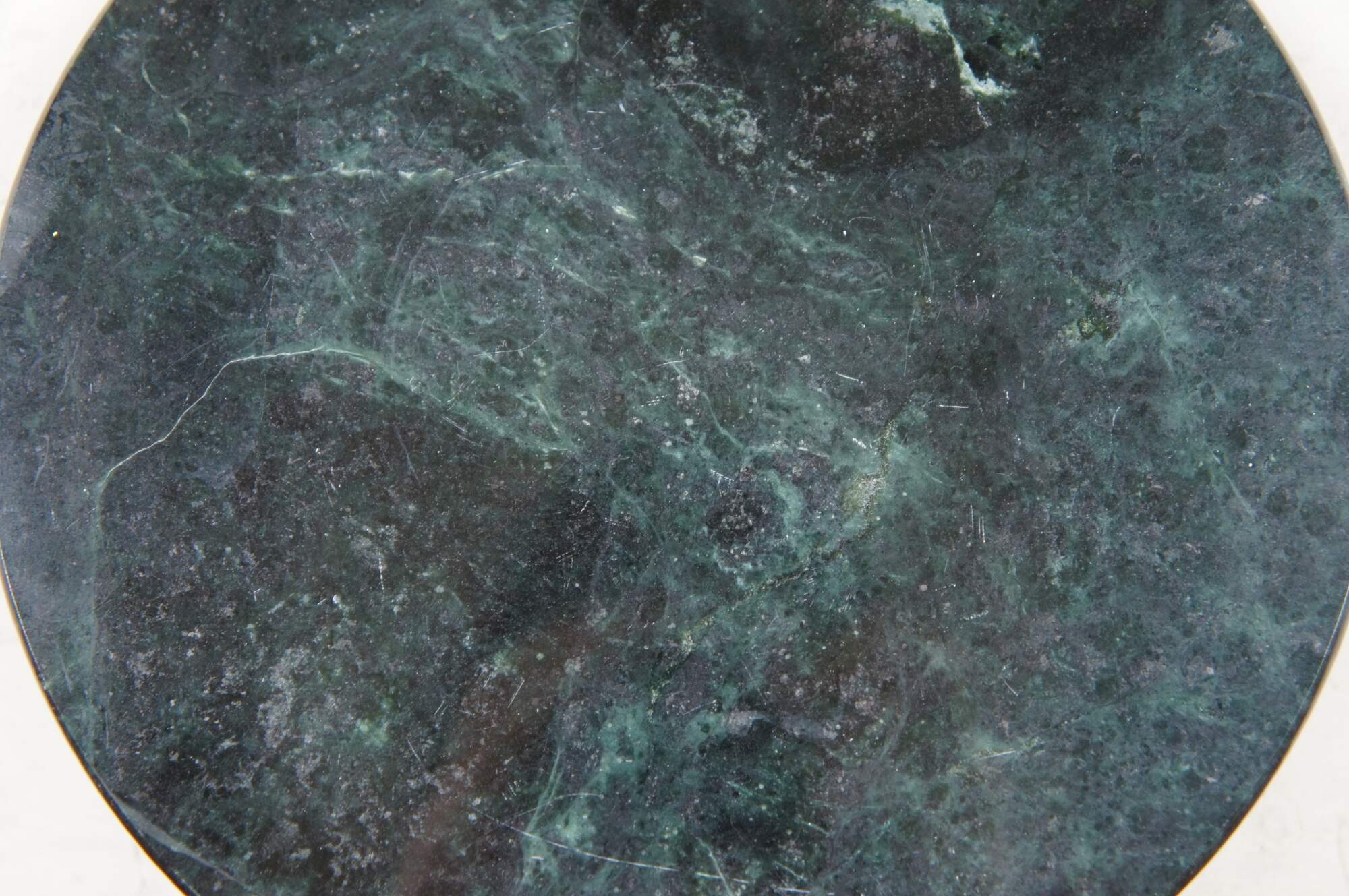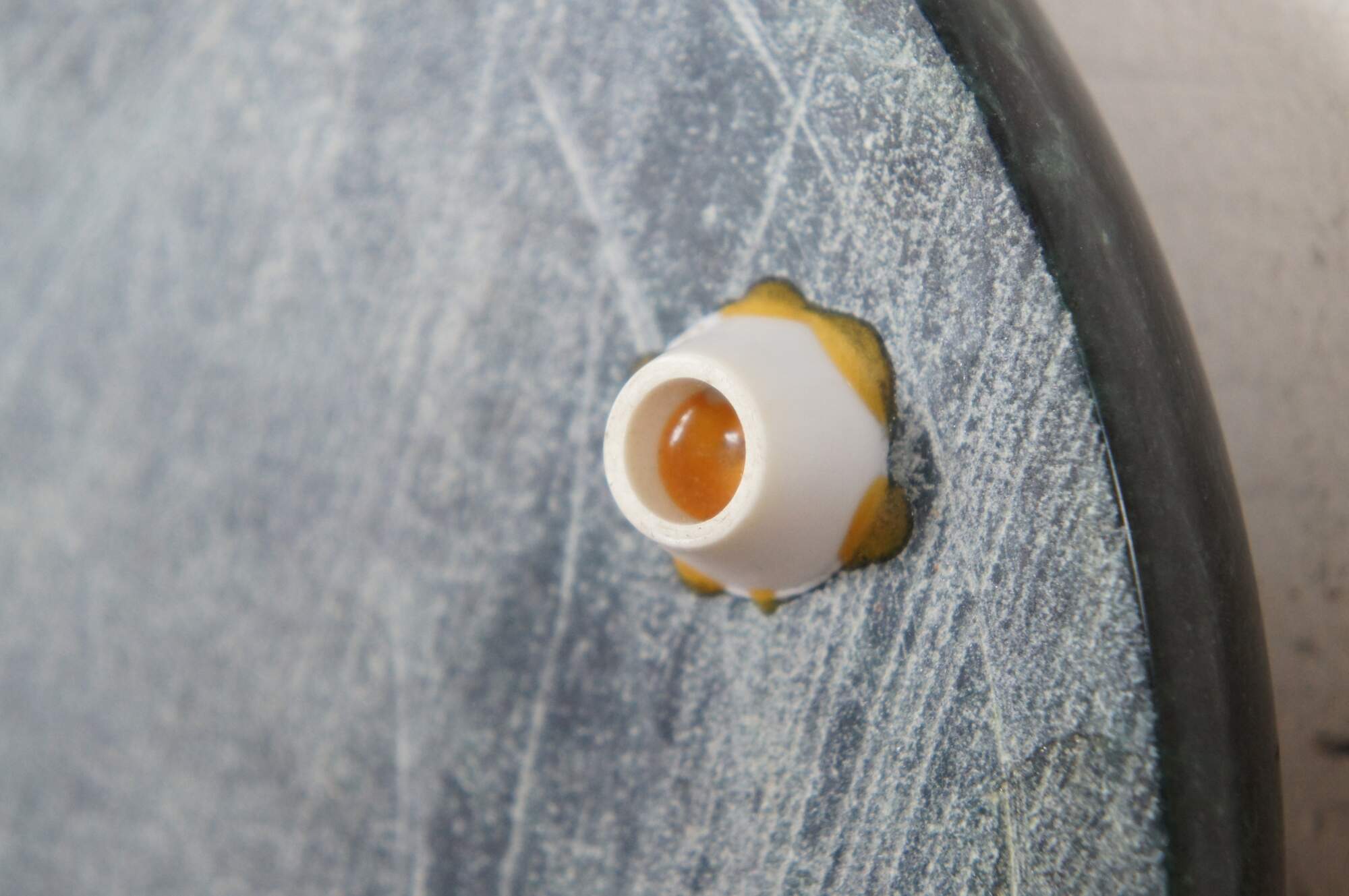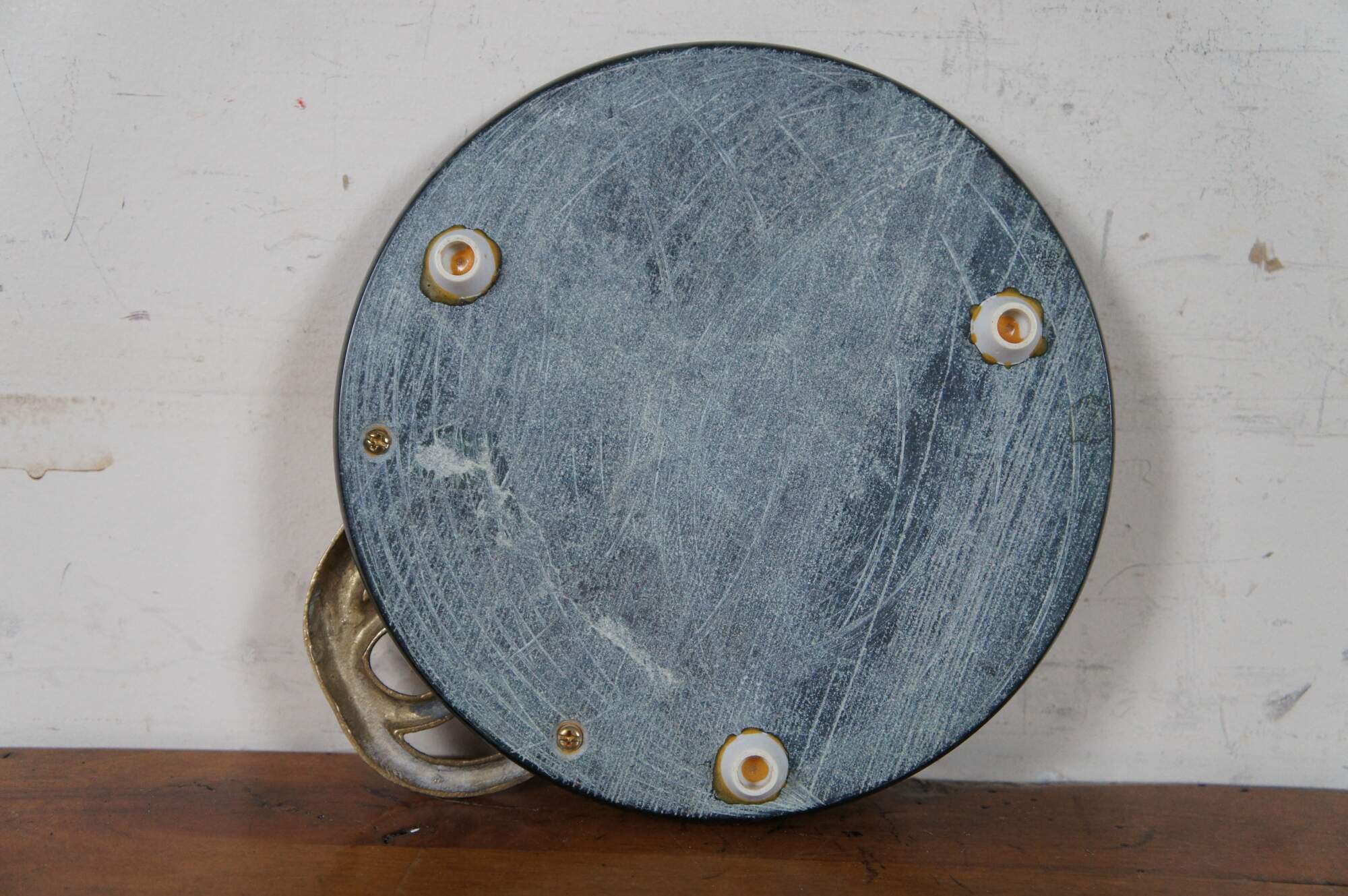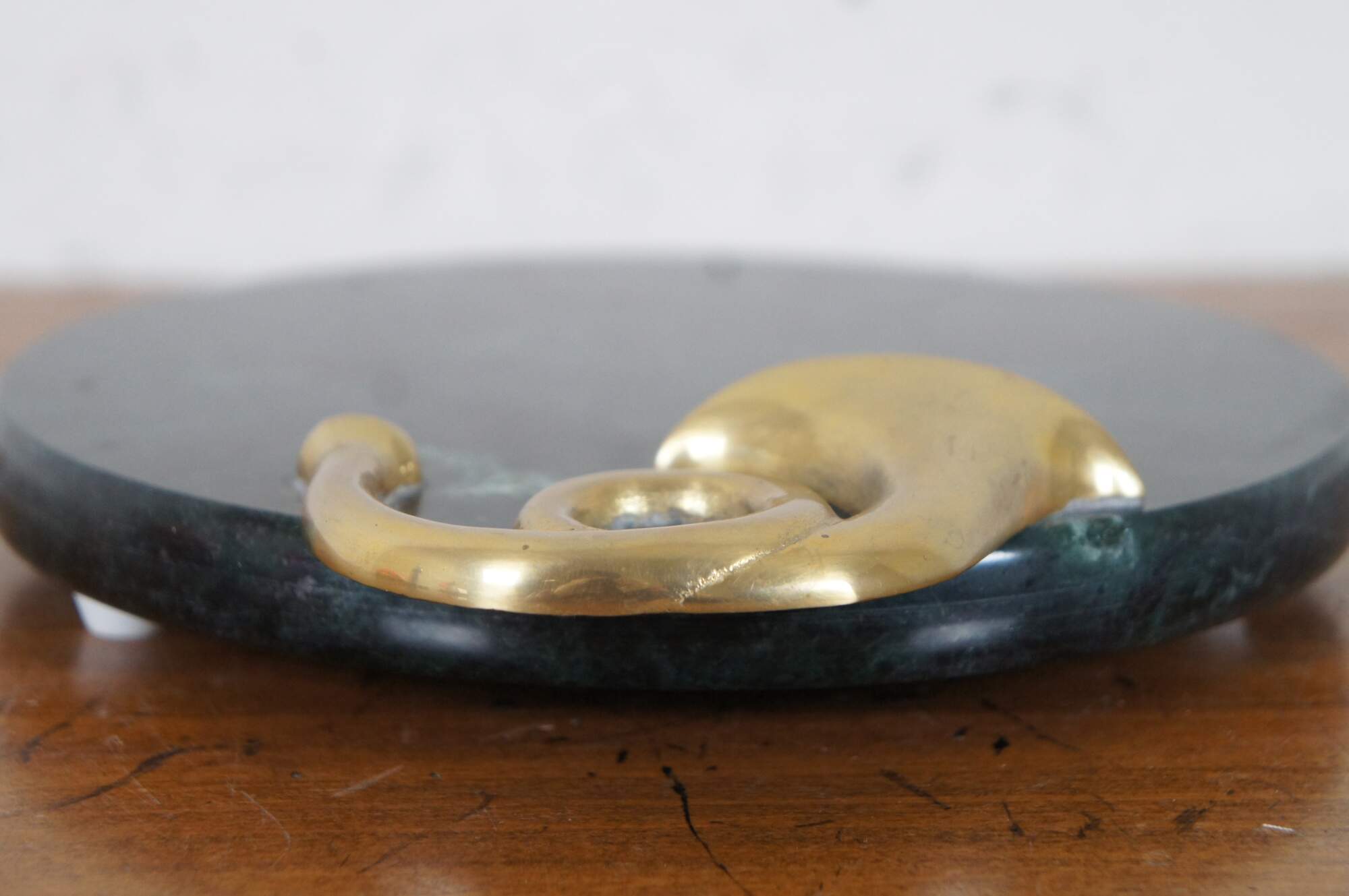 Vintage round green marble cheese plate / serving tray / champagne / wine / magnum bottle coaster featuring a musical orchestra theme a brass French Horn shaped handle and white plastic feet.